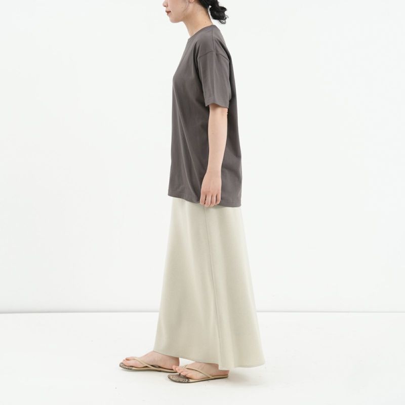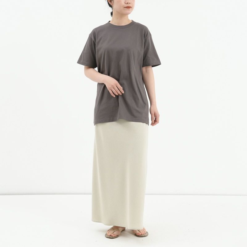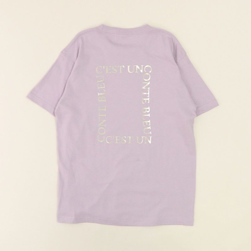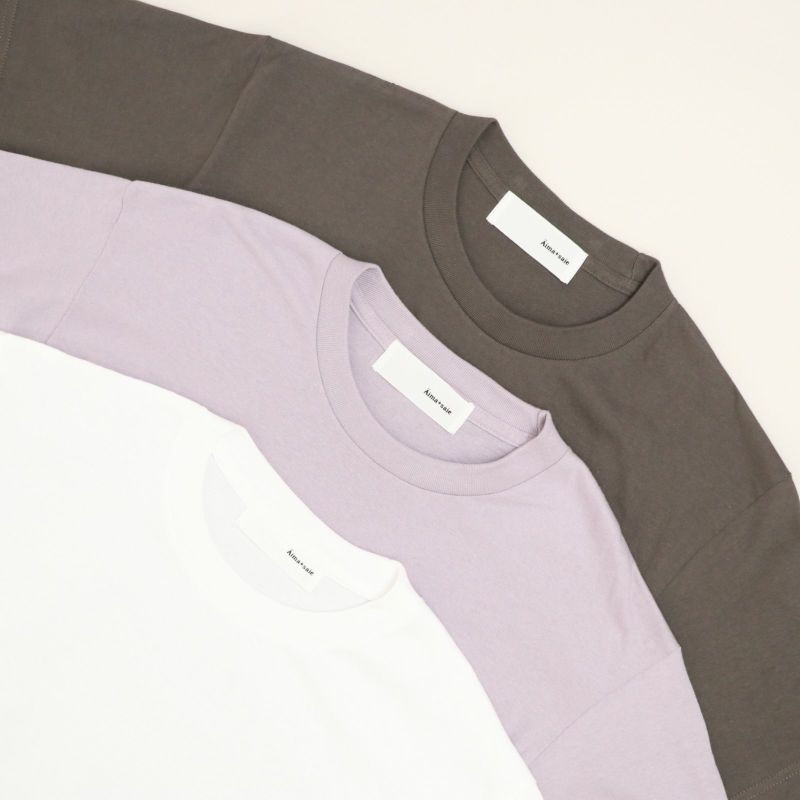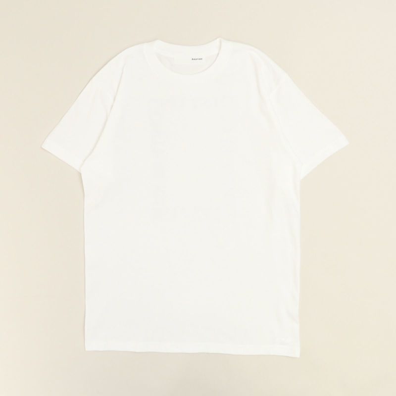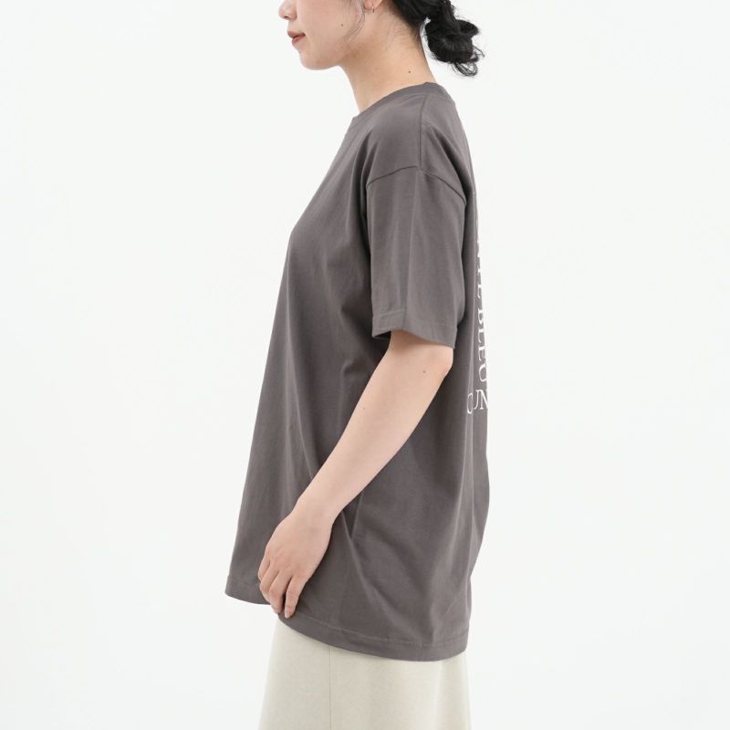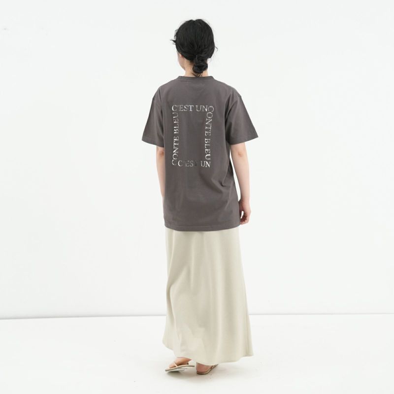背中に箔シートプリントで描いた少しシェープさせたロゴがポイント。透けにくいやや肉厚の天竺を使用。 無地のカラーTシャツ感覚で着られるのにアクセントになる1枚として◎