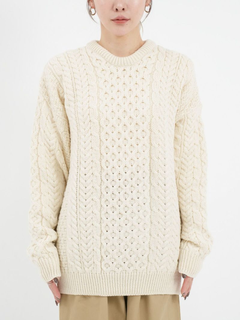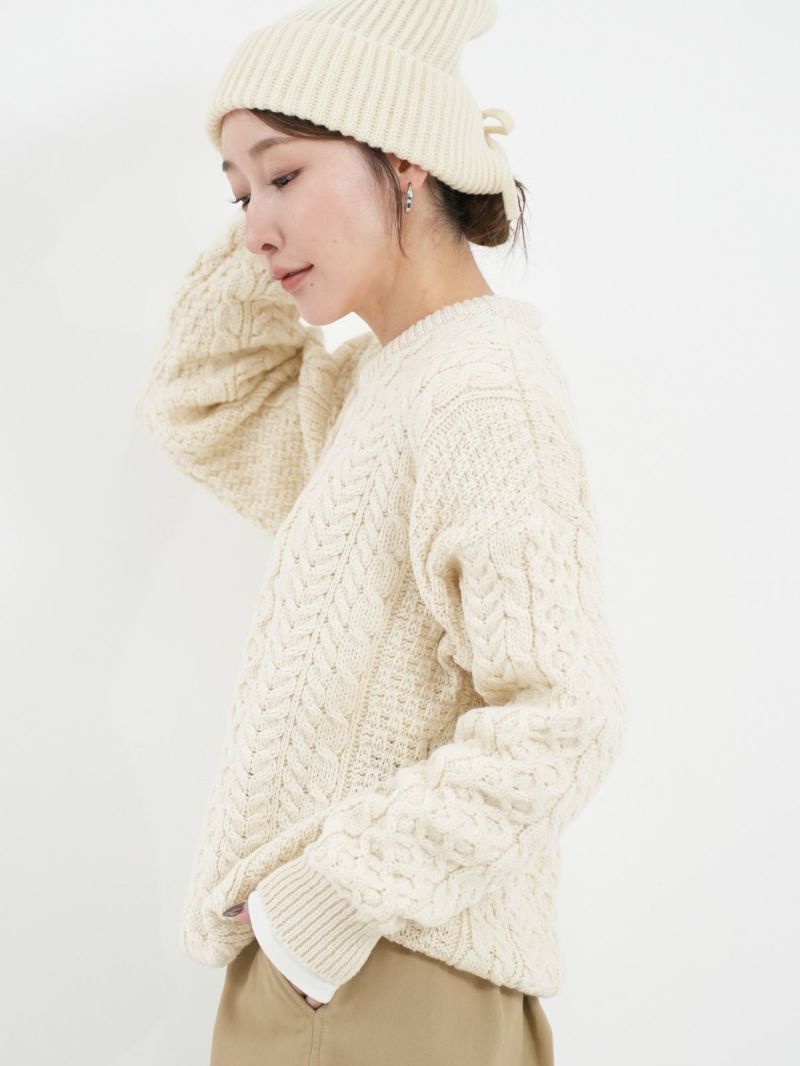 ケルト民族に伝わる複雑で美しいケーブル編みニットプルオーバー。 シンプルで立体感のある網目模様は1枚で着ても様になり、時代やトレンドに左右されないデザインです。ワイドパンツなどと合わせてラフな雰囲気を楽しんだり、スカートと合わせてフェミカジコーデもおすすめです。