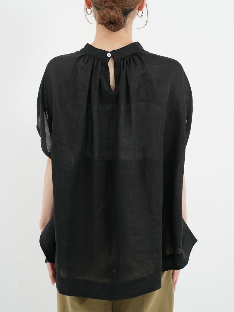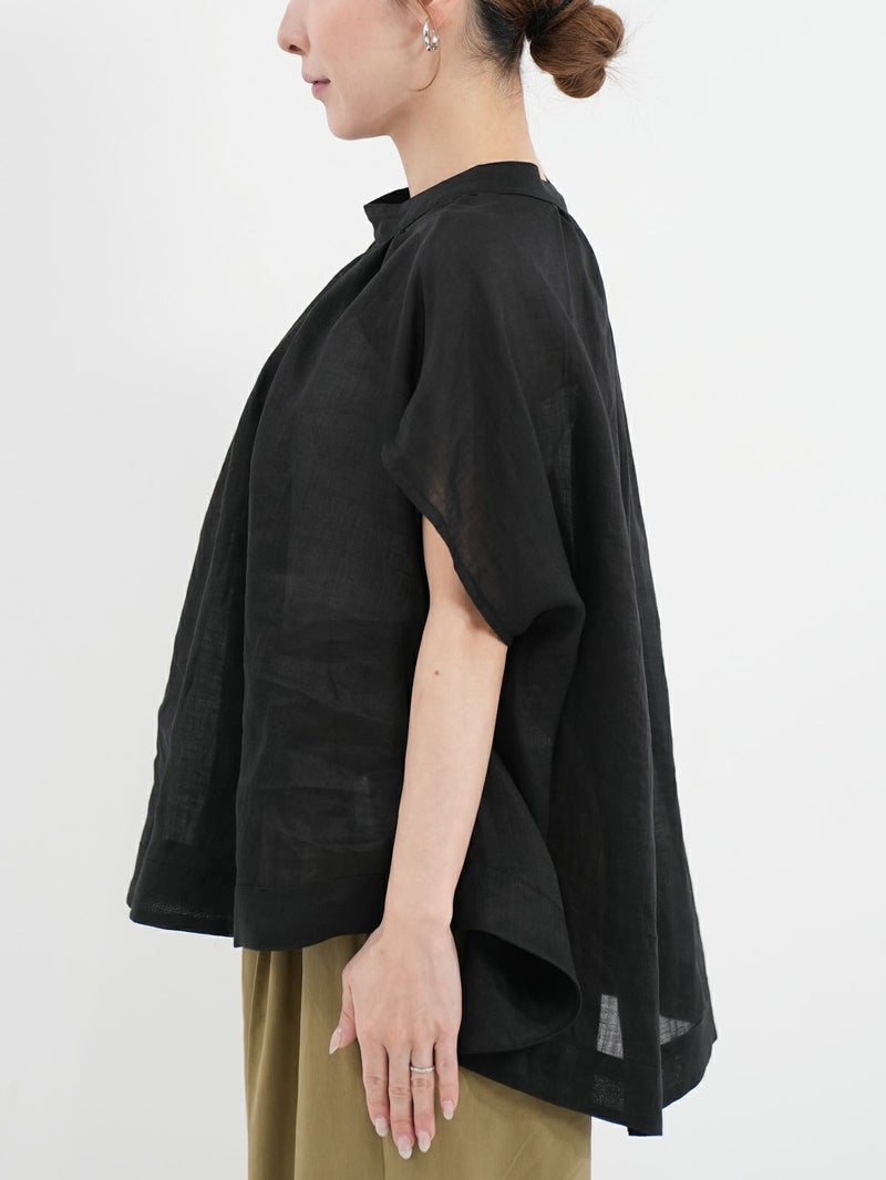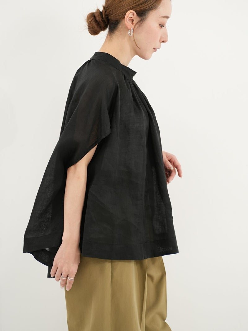 リネンのシャリ感とテンセルのしなやかさの両方を併せもったブラウス。 涼やかでナチュラルな雰囲気と大人な透け感を楽しめるリネンツイル生地。風通りが良く動くたび揺れるシルエットが印象的です。デニムと合わせてカジュアルに、キレイめなボトムと合わせてオフィスにと活躍する1枚です。
