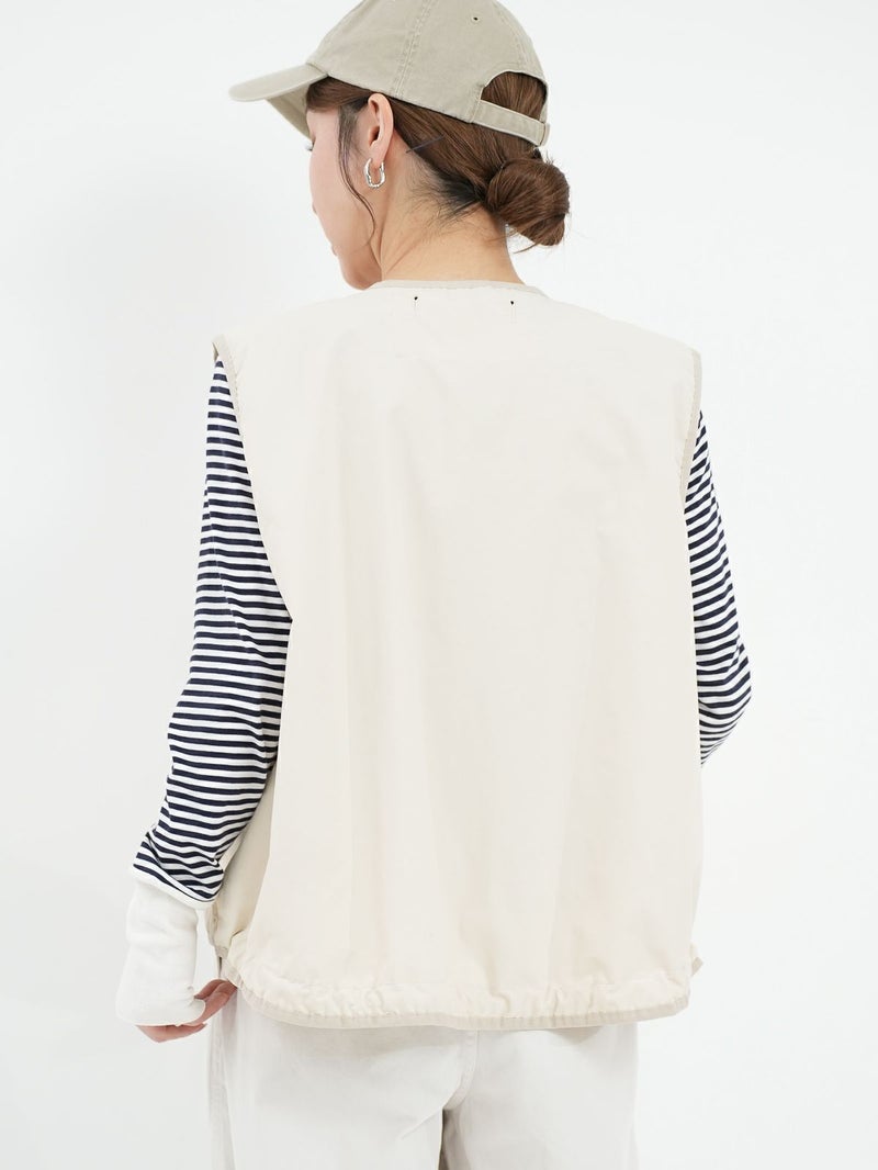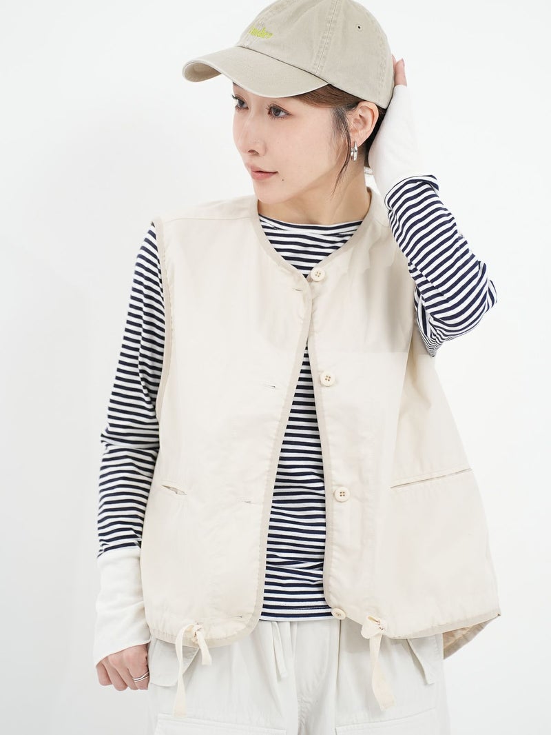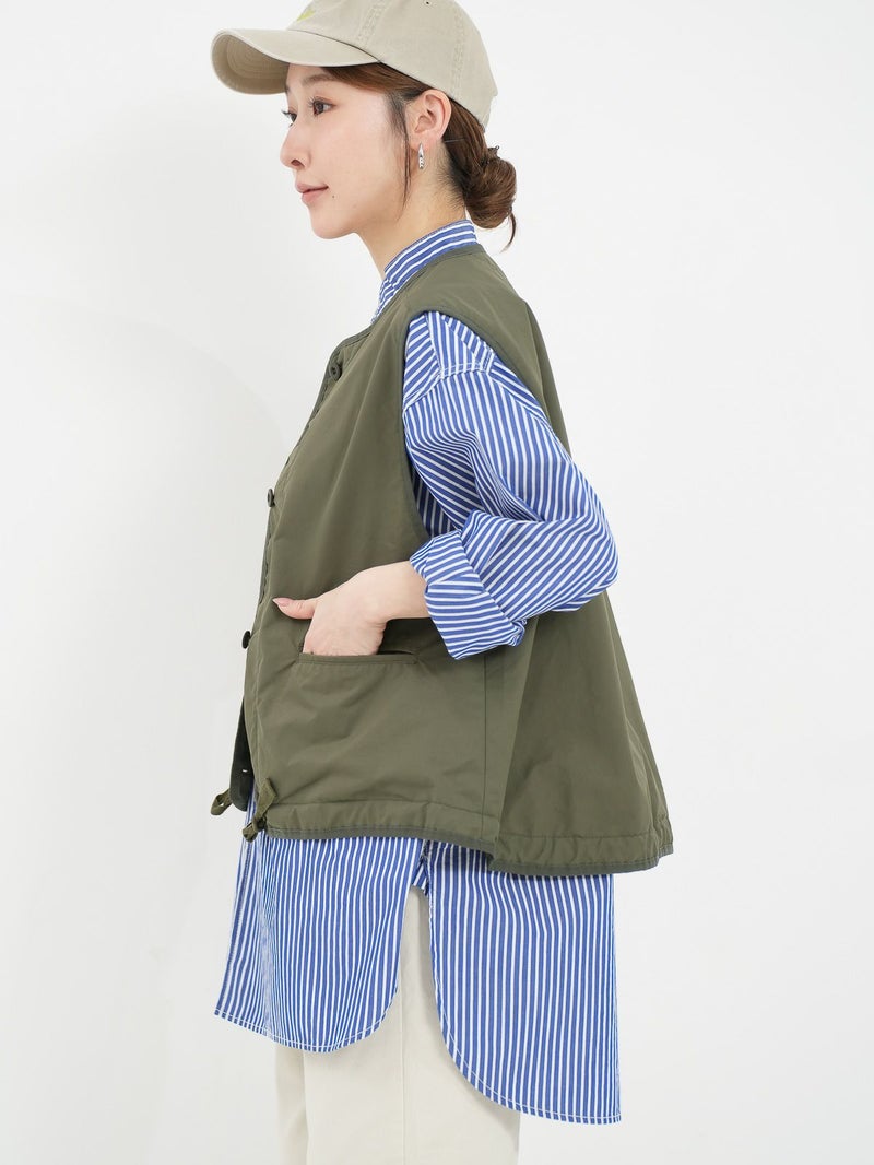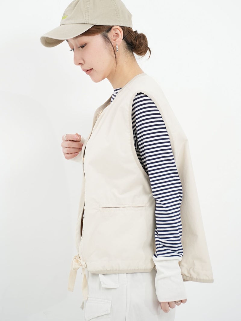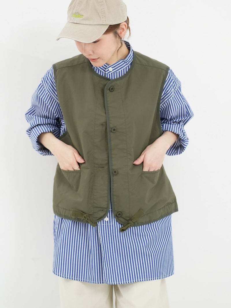 コットン/ナイロン素材のペーパータッチなミリタリーベスト。 洗い加工やパイピングのテンションのかけ方など細部までこだわったディテールがポイント。コンパクトながらも大きめのアームホールなので、オーバーサイズのトップスでもレイヤード可能。裾のテープを絞れば、立体的なシルエットに。