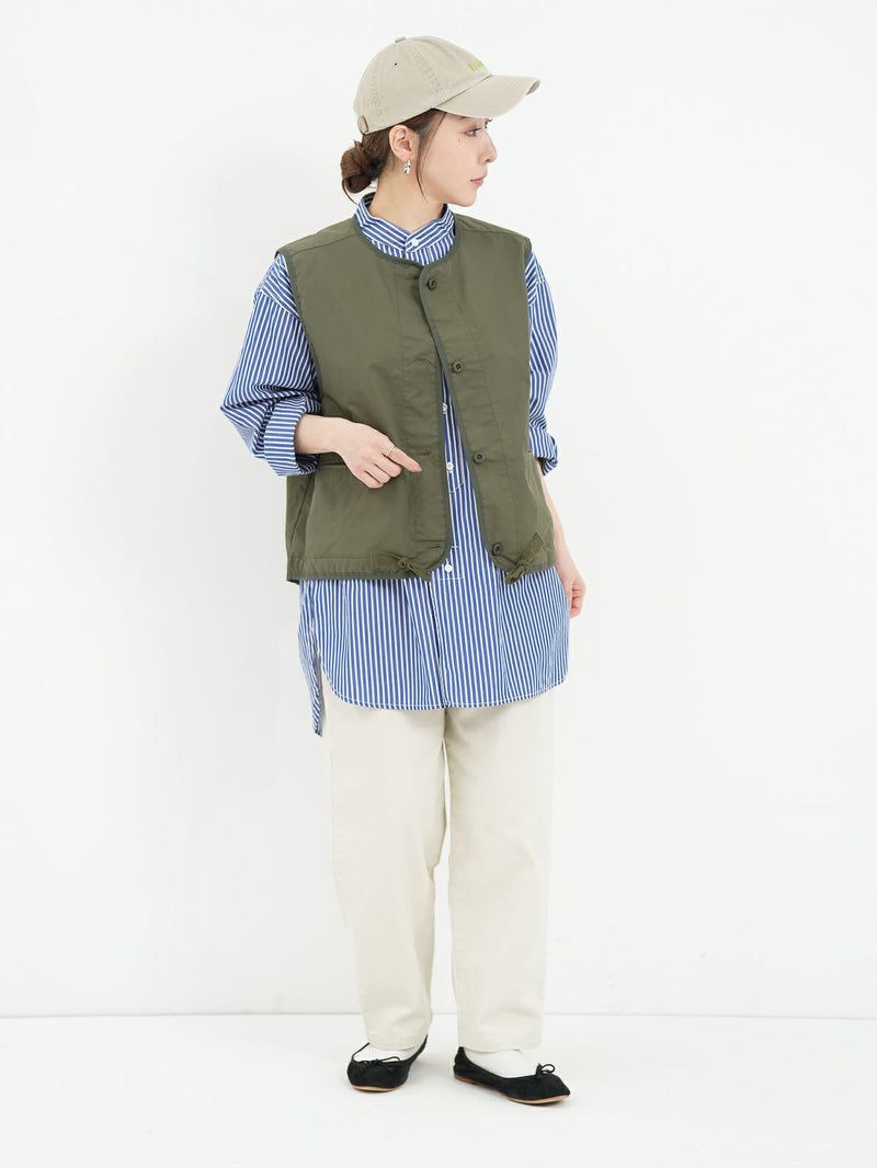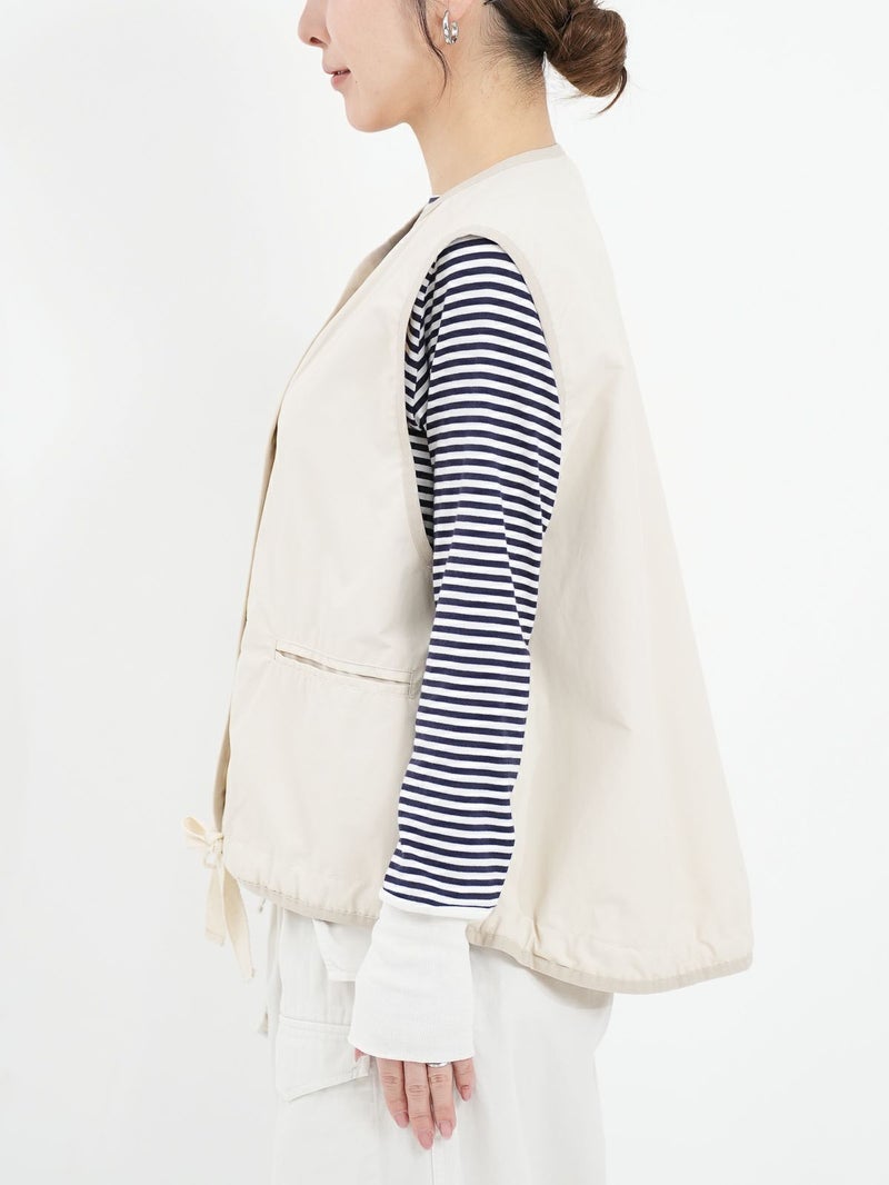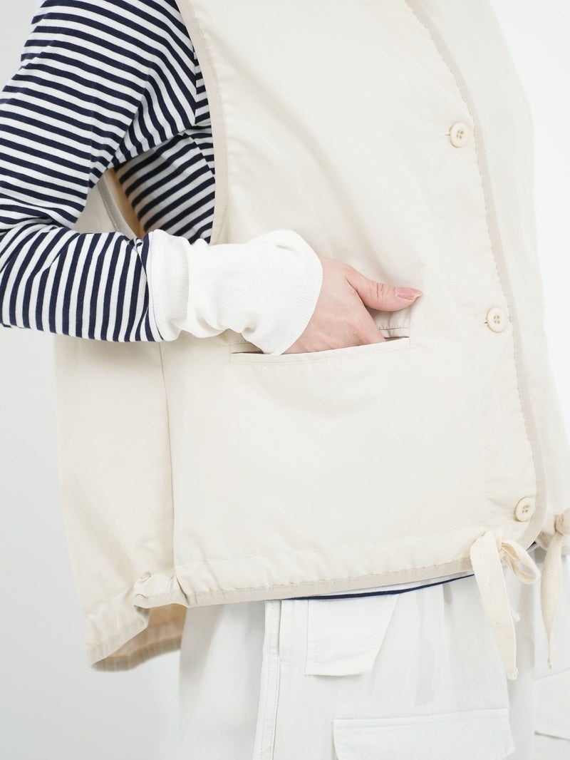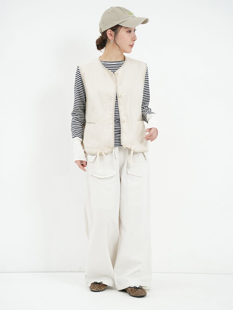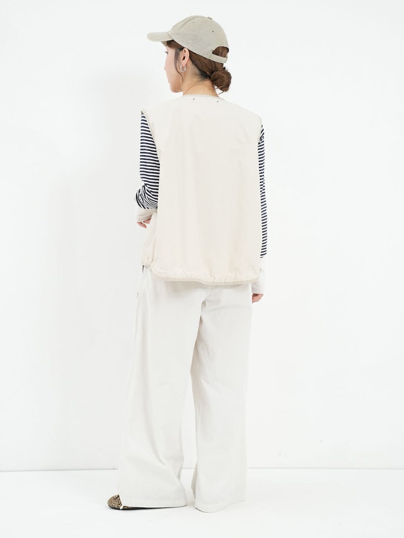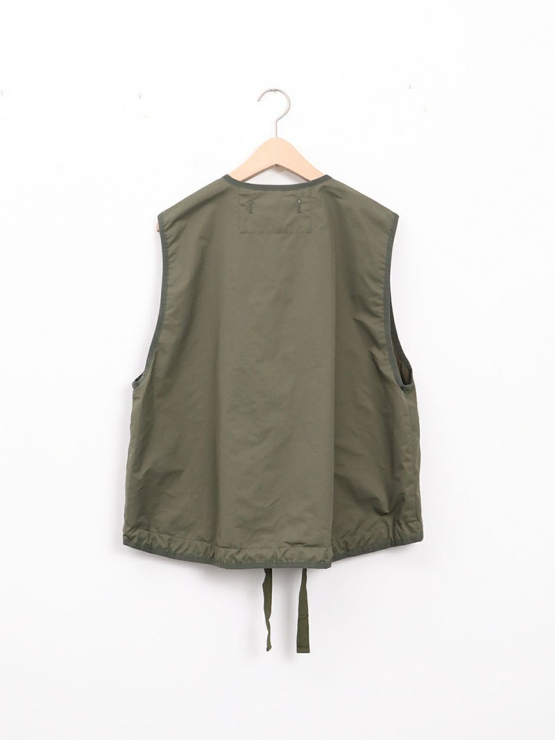 コットン/ナイロン素材のペーパータッチなミリタリーベスト。 洗い加工やパイピングのテンションのかけ方など細部までこだわったディテールがポイント。コンパクトながらも大きめのアームホールなので、オーバーサイズのトップスでもレイヤード可能。裾のテープを絞れば、立体的なシルエットに。