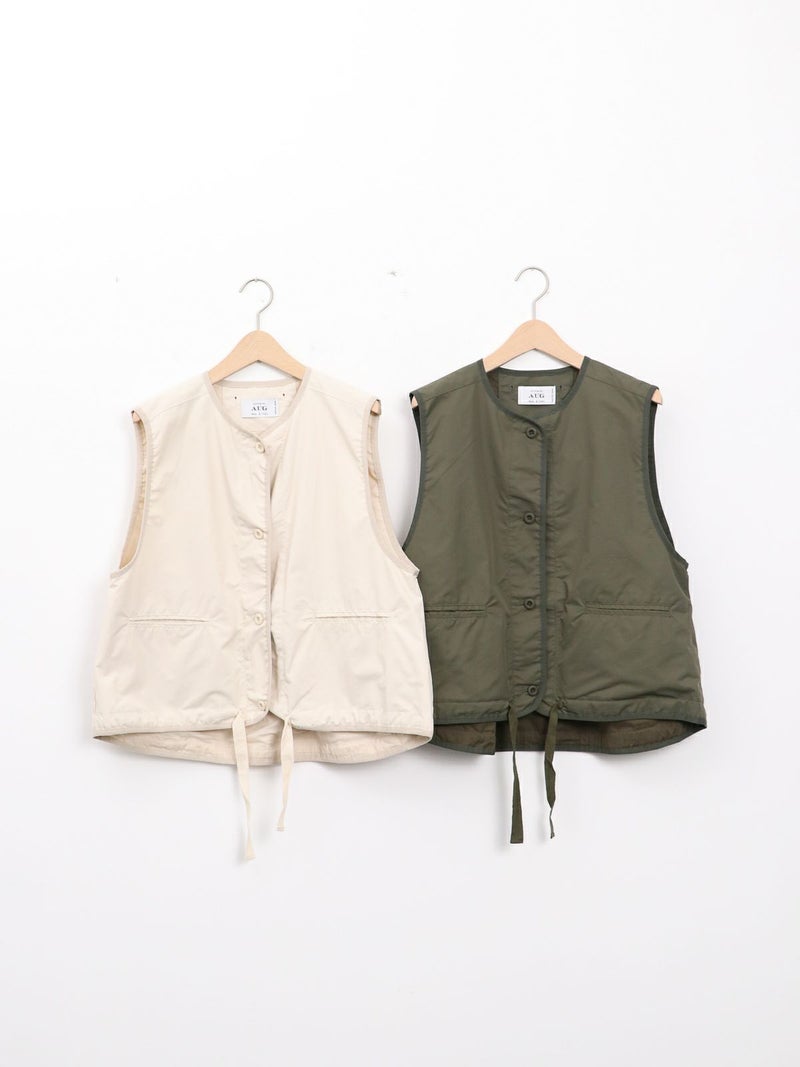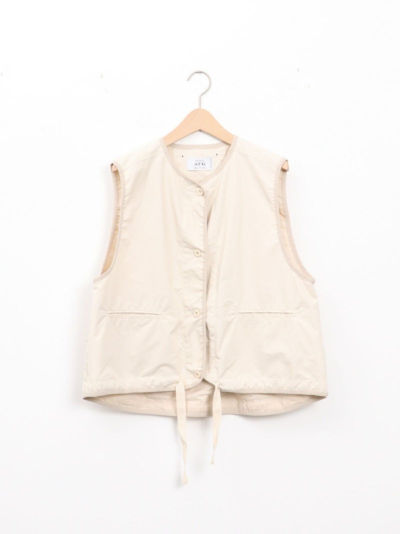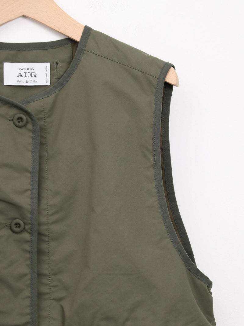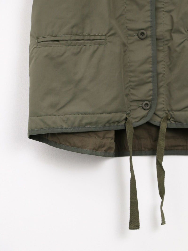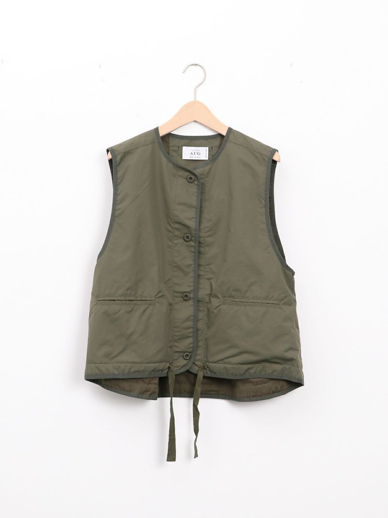 コットン/ナイロン素材のペーパータッチなミリタリーベスト。 洗い加工やパイピングのテンションのかけ方など細部までこだわったディテールがポイント。コンパクトながらも大きめのアームホールなので、オーバーサイズのトップスでもレイヤード可能。裾のテープを絞れば、立体的なシルエットに。