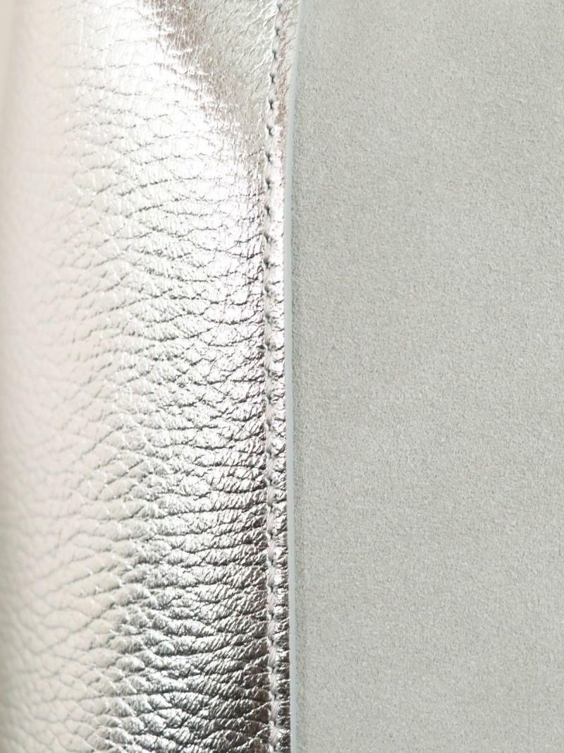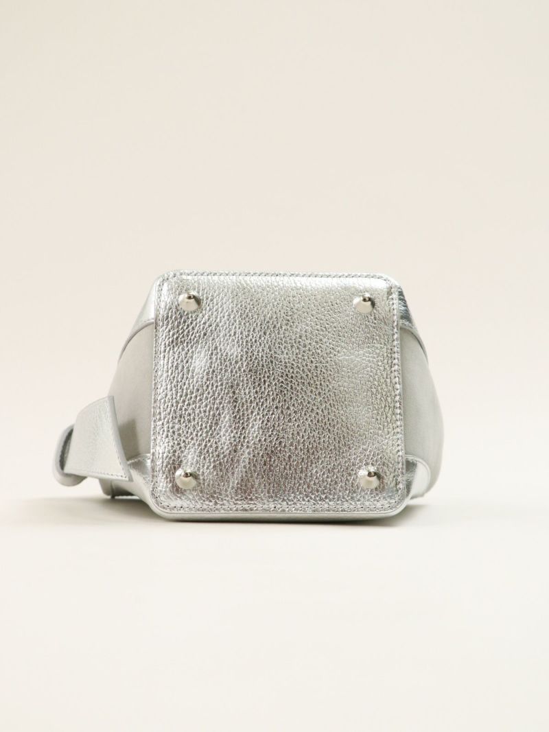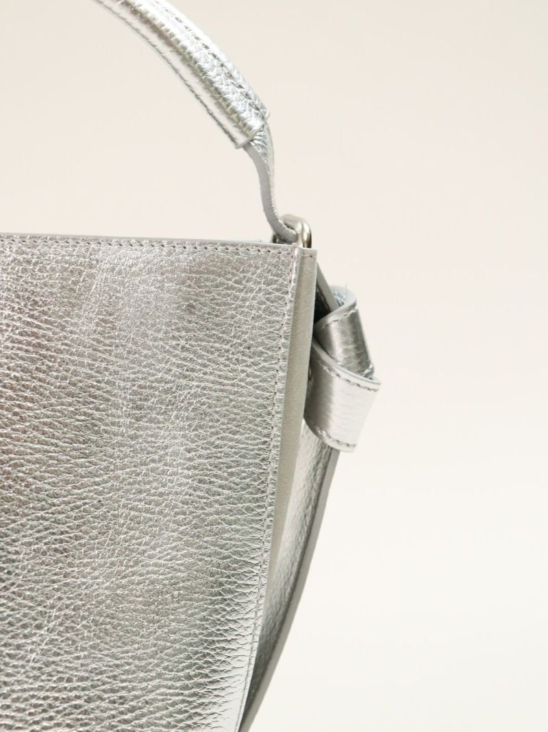 上品な艶とシボ感のあるレザーを使用しており、サイドに垂らしてぐるりと結んだハンドルや、スエードの切り替えがアクセント。着脱可能なショルダーストラップ付きで斜め掛けもでき、サイドのボタンで形を変えられるのも◎ストラップを取り付けてポシェットにもなる同素材のポーチ付きで幅広く活躍するアイテムです。