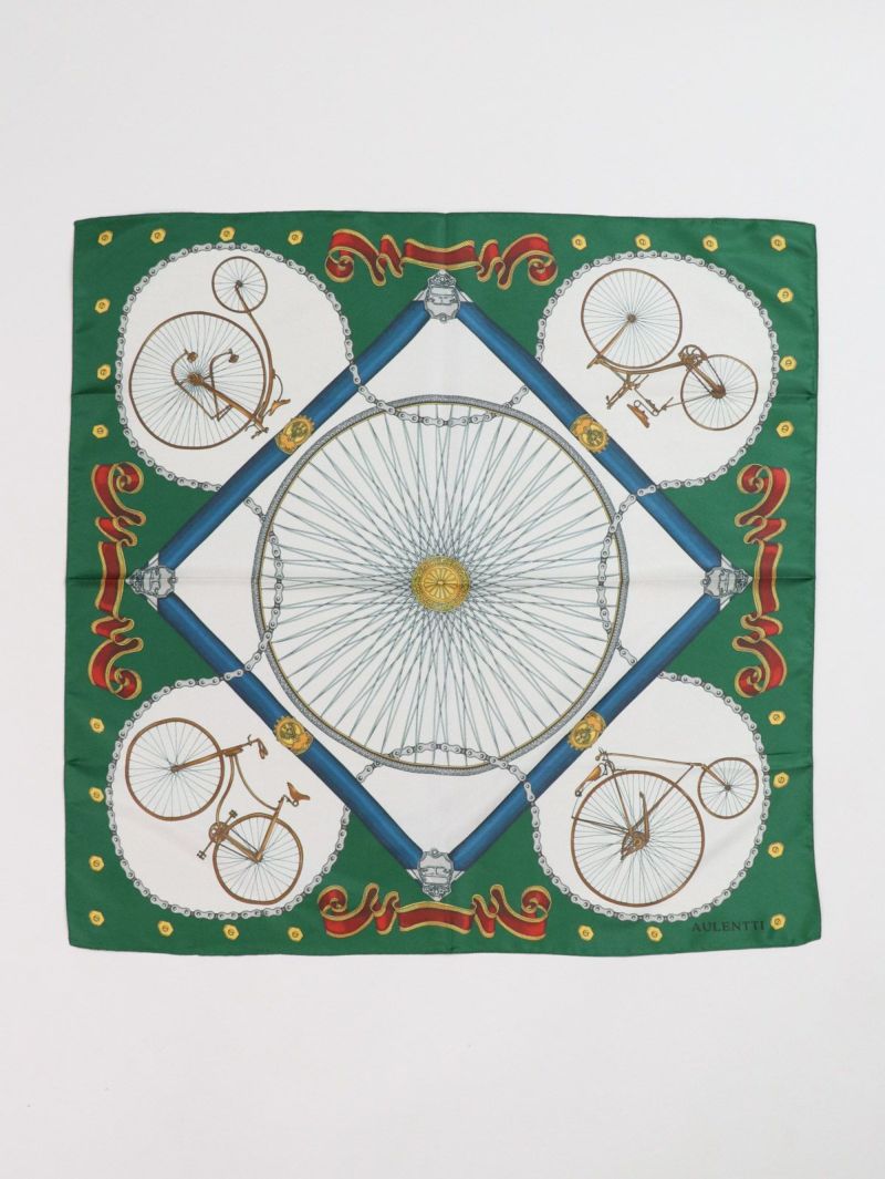 自転車をモチーフにしたクラシック柄の大判スカーフ。 ポリエステル100%ながらも高級感のある滑らかな肌触り。首元に巻いたり、バッグに取り付けたりと様々なシーンやコーディネートのアクセントに◎