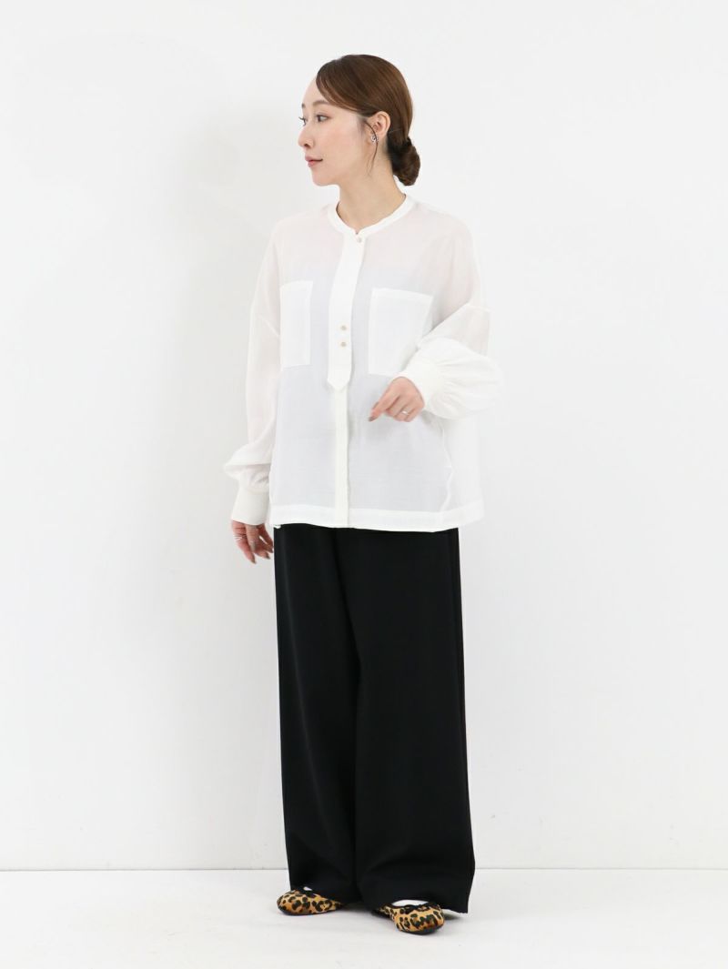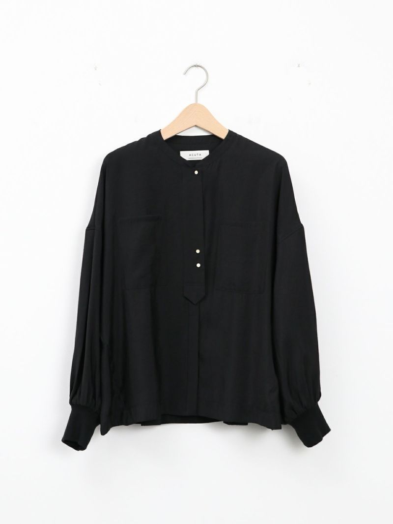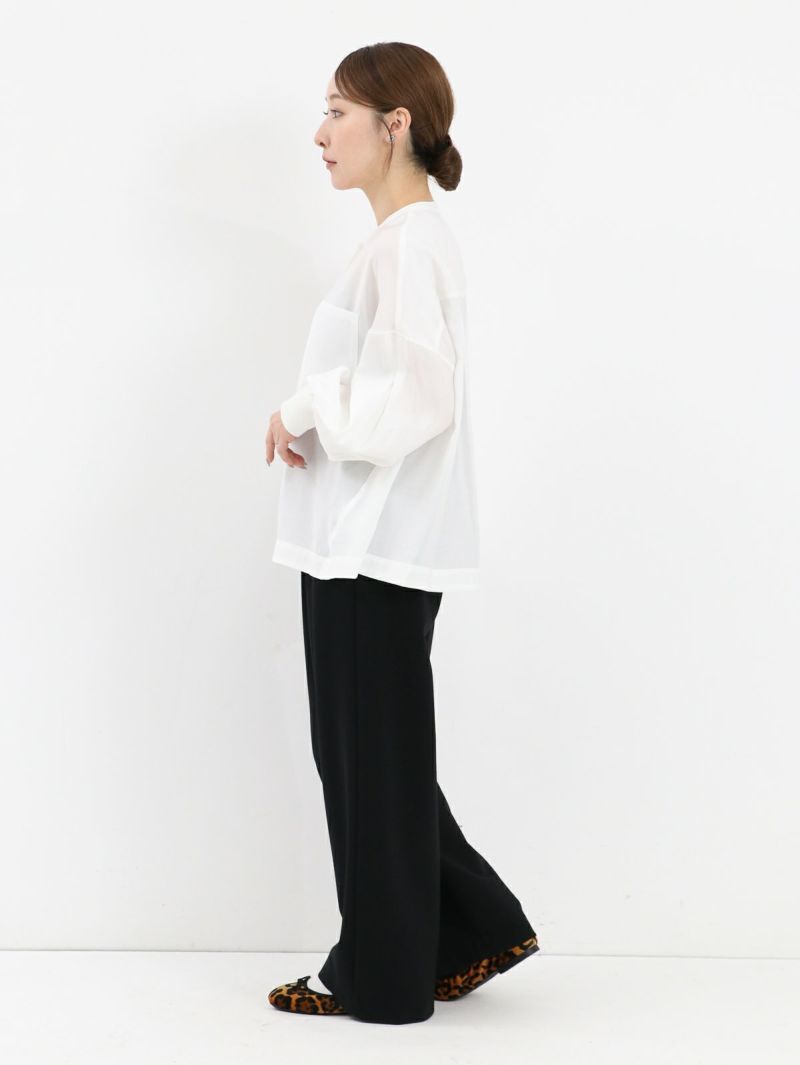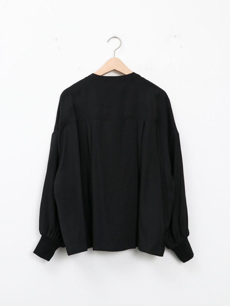 シルクのようなハリと光沢のあるポリモダールブロード×強撚カットソーのドッキングブラウス。袖のリブ使いなどパーツごとに表情のあるデザインです。
