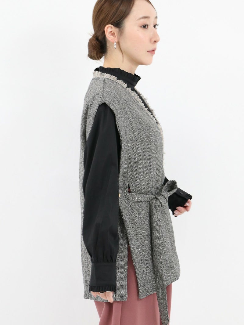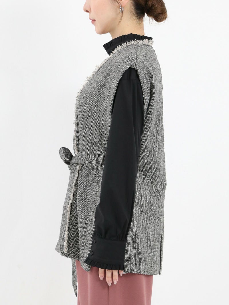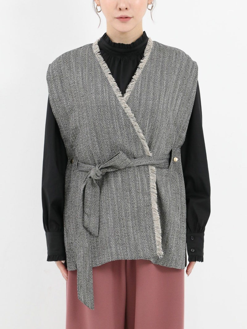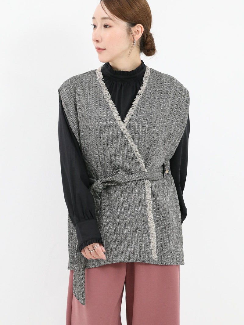 ウール見えするヘリンボーン生地はAWの雰囲気を取り入れるのにぴったりの素材感。 ミックスツイードの表面感が暖かみがありつつモードな雰囲気。フロントはボタンなどは付けず前端のフリンジが際立つデザイン。スッキリとした深めのVネックで大人な雰囲気に仕上げました。程よく長めの着丈で気になる腰回りやヒップもカバーできる優れもの。ベルトの巻き方はスタイリングに合わせてアレンジが可能です。