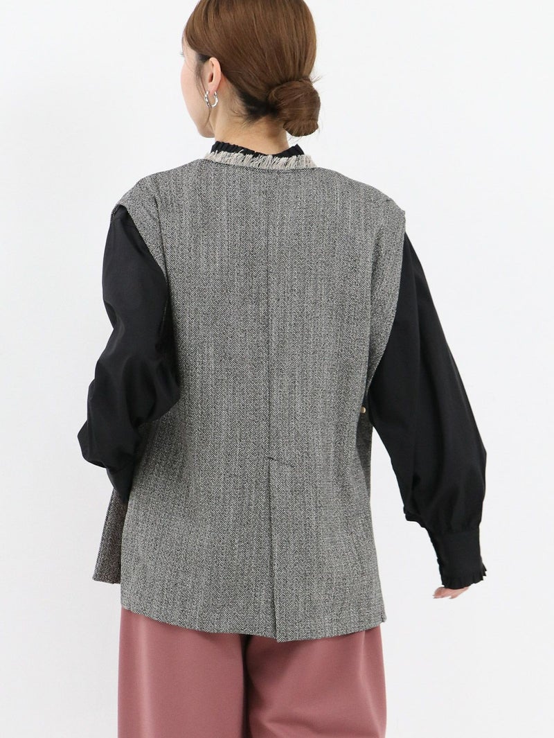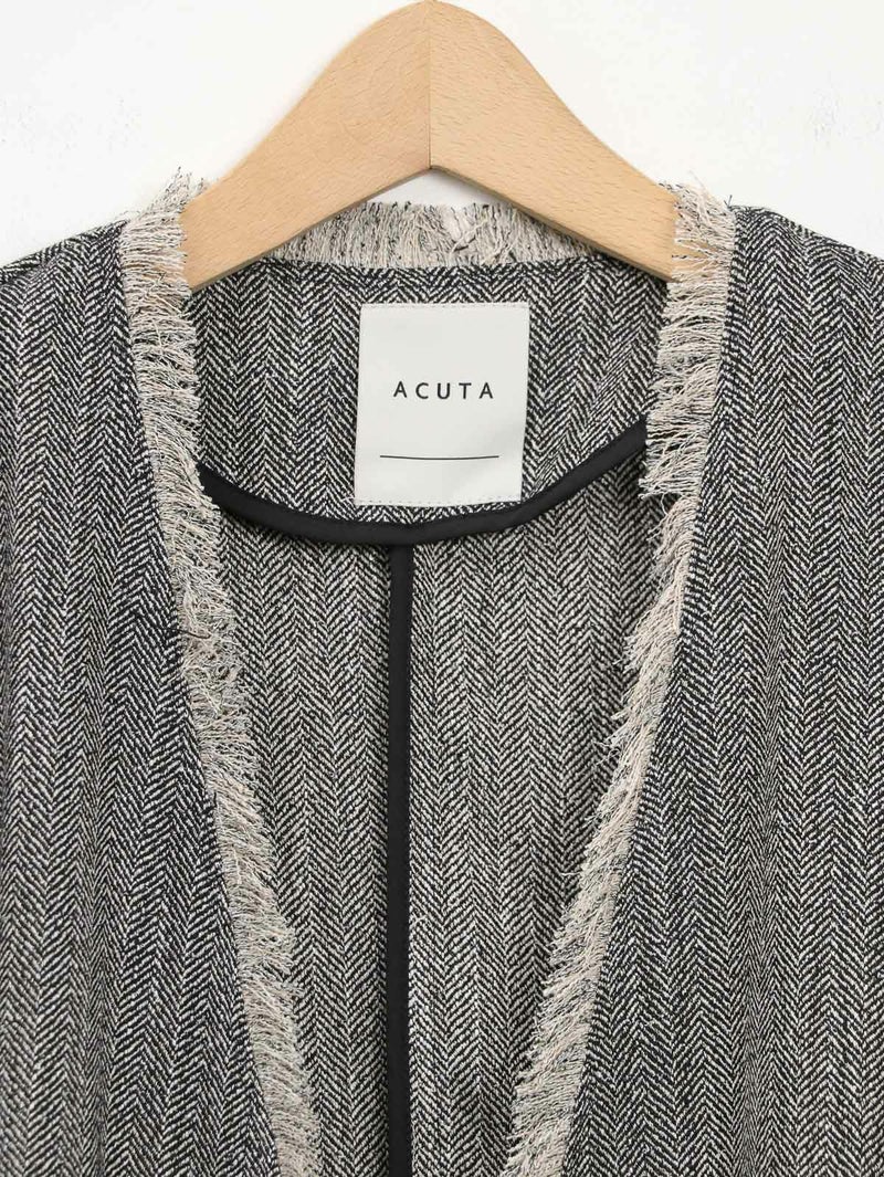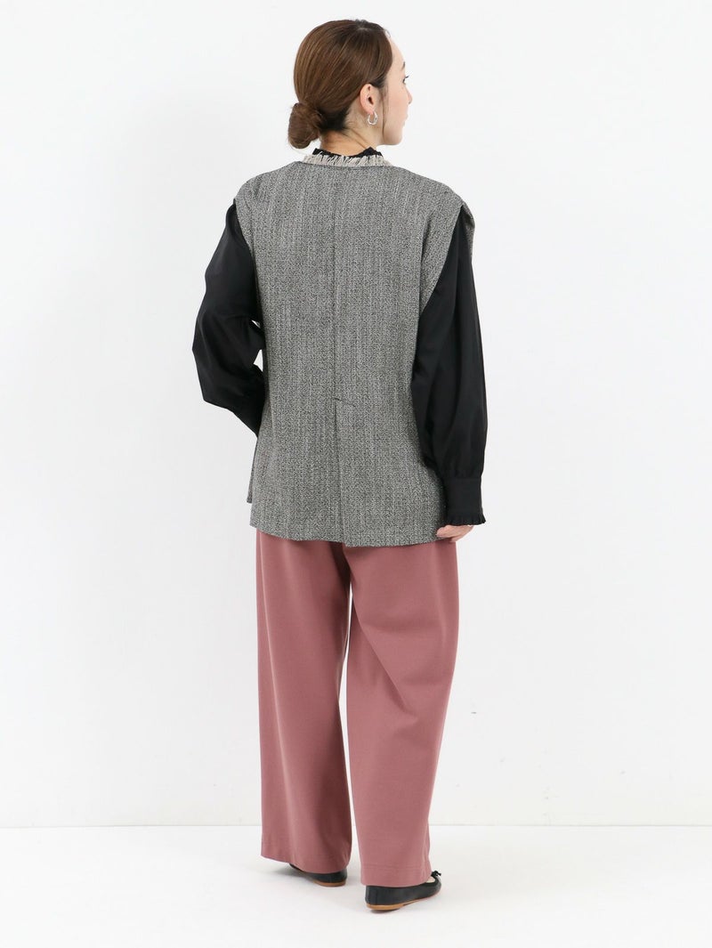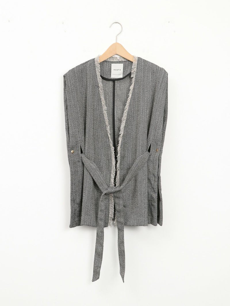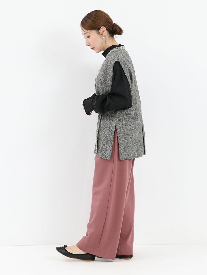 ウール見えするヘリンボーン生地はAWの雰囲気を取り入れるのにぴったりの素材感。 ミックスツイードの表面感が暖かみがありつつモードな雰囲気。フロントはボタンなどは付けず前端のフリンジが際立つデザイン。スッキリとした深めのVネックで大人な雰囲気に仕上げました。程よく長めの着丈で気になる腰回りやヒップもカバーできる優れもの。ベルトの巻き方はスタイリングに合わせてアレンジが可能です。