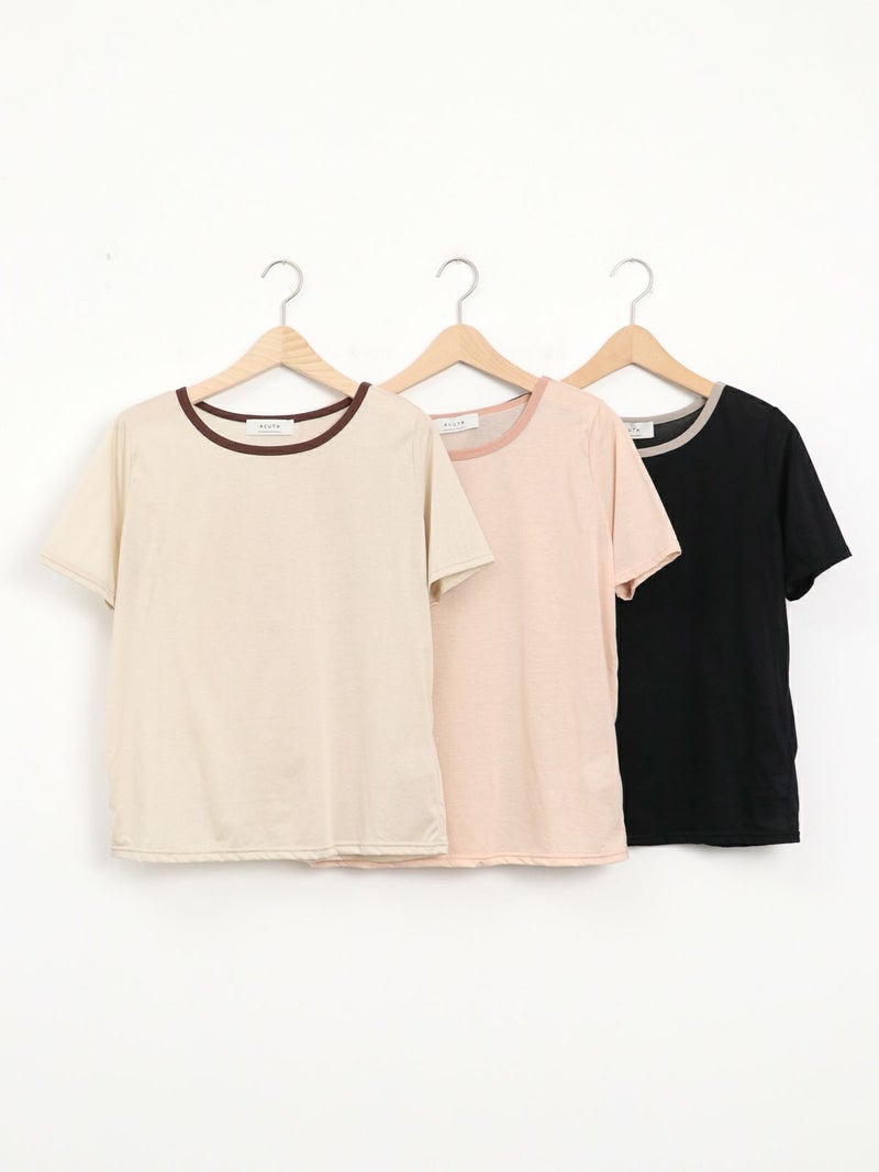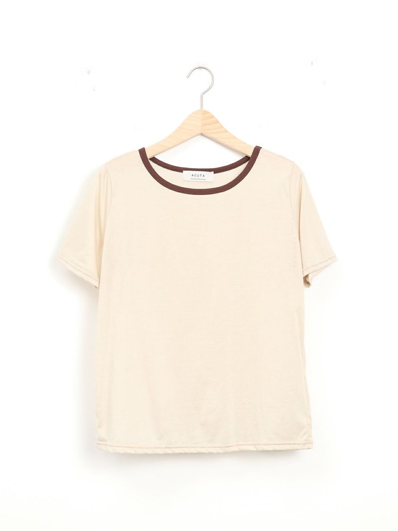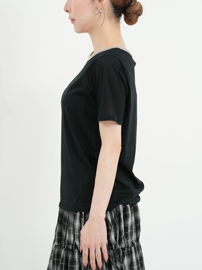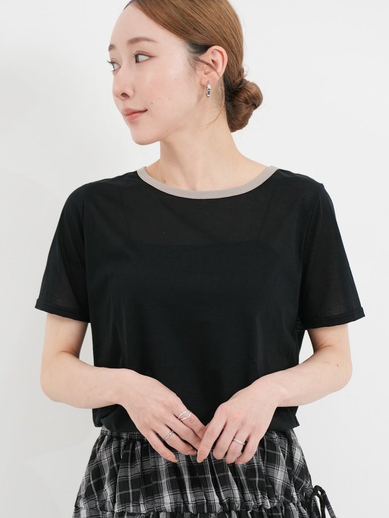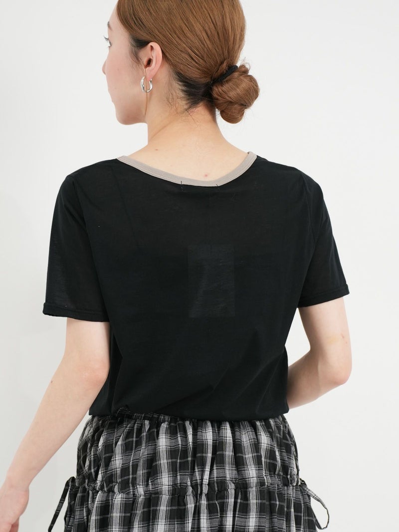 シアー感が特徴で女性らしく着こなせるシアーリンガーTee。 繊細な細番手の糸で編み上げたハイゲージなカットソー素材を使用し、夏にぴったりなエアリーな着心地。衿幅は細く華奢に、大人の女性が着やすい配色も魅力。 程よく身体にフィットするサイズ感が魅力で、インナーとしてはもちろん、一枚着でシアー感を楽しむ着こなしもおすすめです。