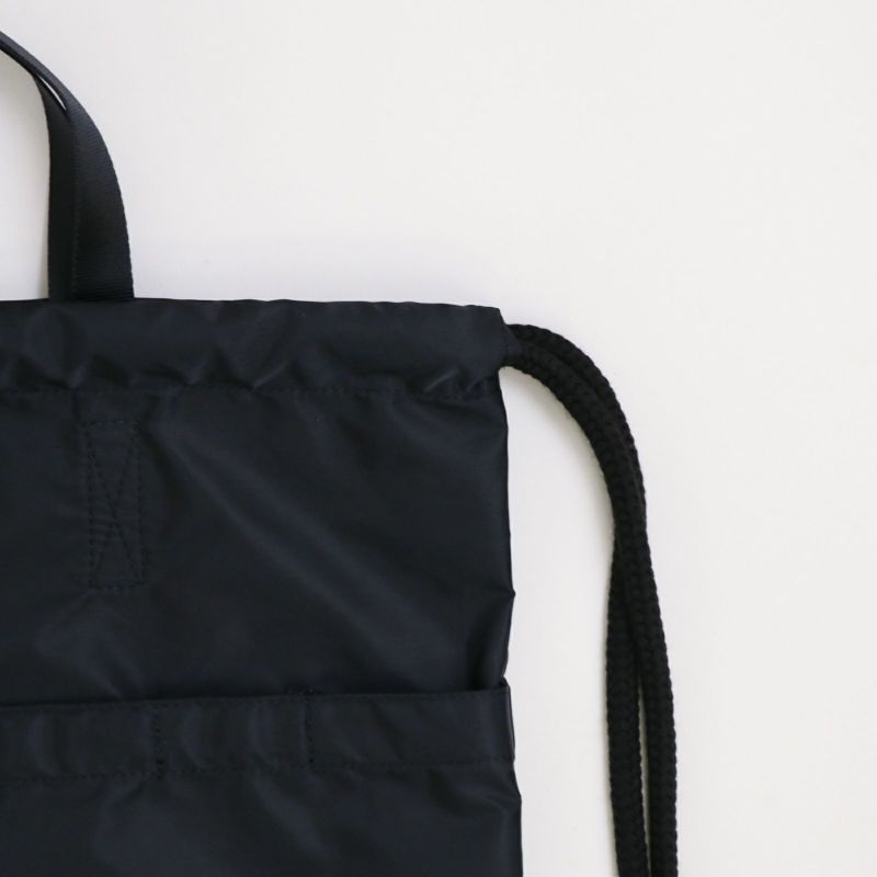 ナイロン素材を使用したナップサック。 外側と内側に仕分けのしやすい大きめのポケットが付いています。また、トップハンドルもあるため、手持ちと2way使用が可能です。光沢のあるしっかりとしたナイロンボディーでオンオフ使用して頂けます。