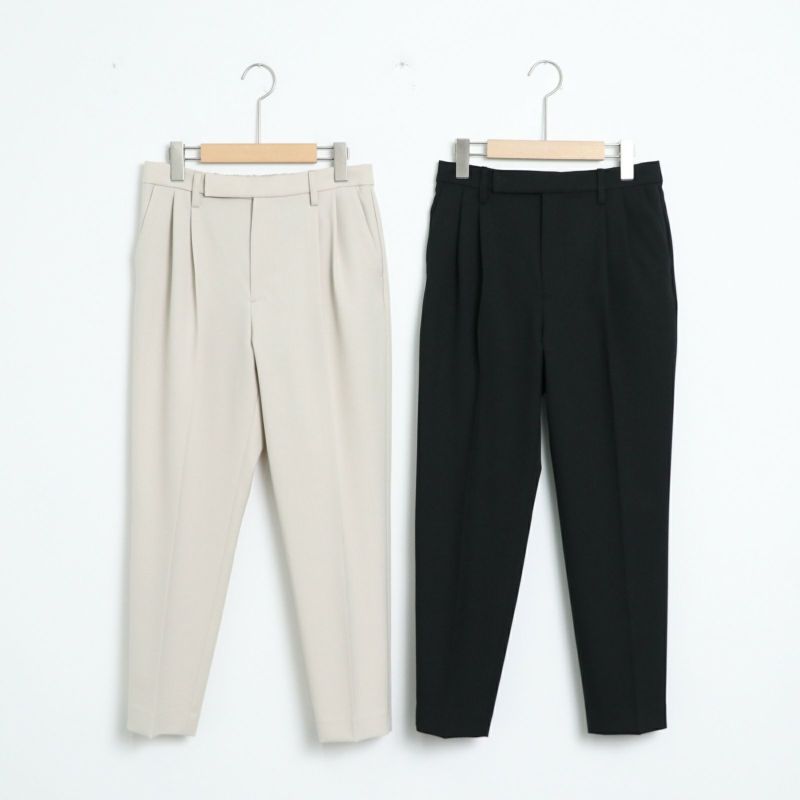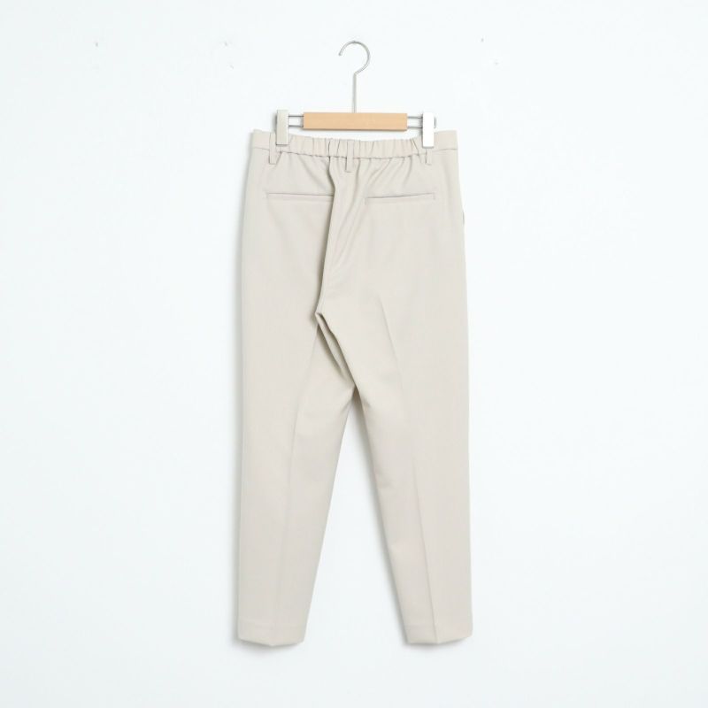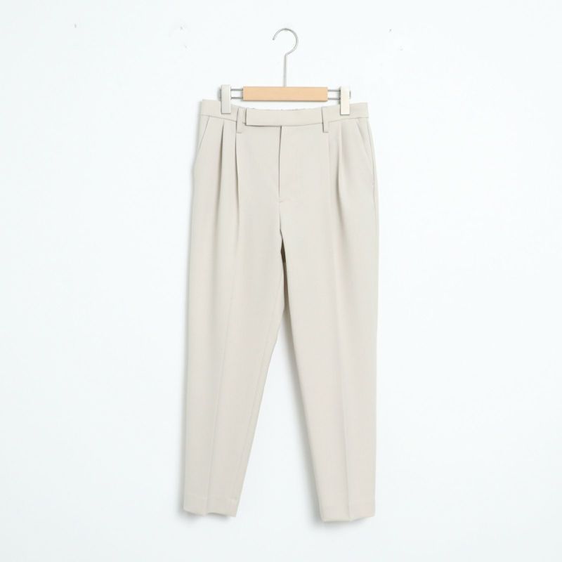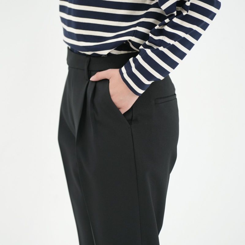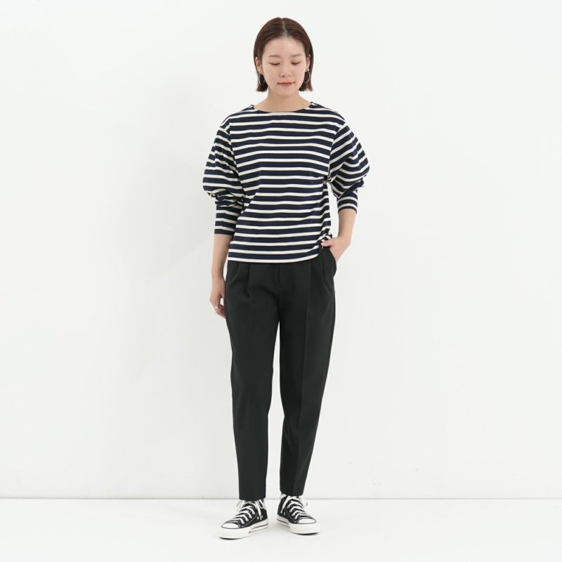 タック入テーパードパンツ。 ポリエステル100%で若干ストレッチも効いています。ジャケットやニットで綺麗めにも、ボーダーでカジュアルにも使えて、春先の急なおでかけにも重宝する一枚です。