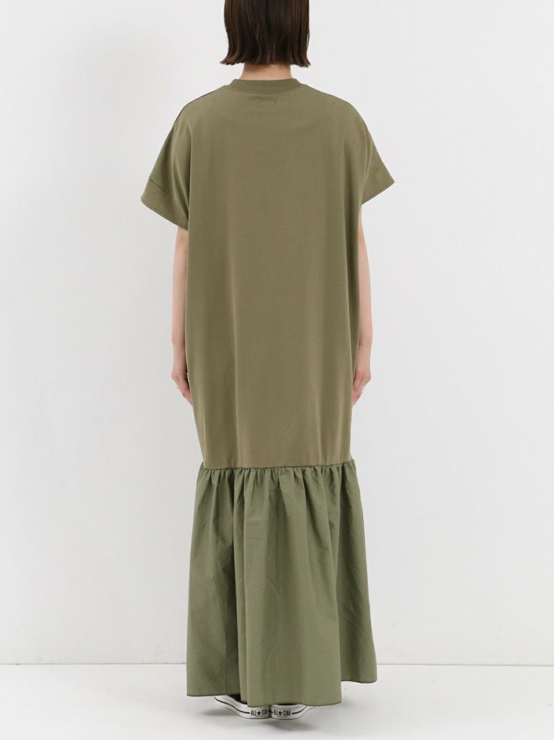 裾のフレアラインが特徴のワンピース。 身頃はやや光沢感がある滑らかな肌触りのカットソー生地を使用し、裾のフレア部分はブラウス生地を使用。素材の違う生地がドッキングした1枚で着映えするワンピースです。