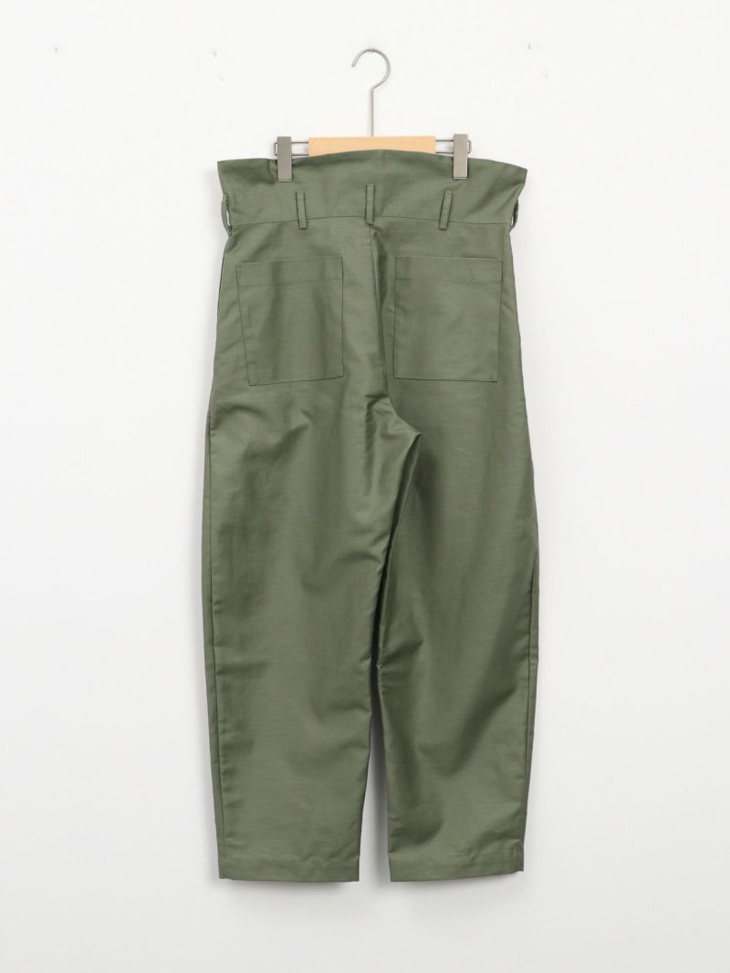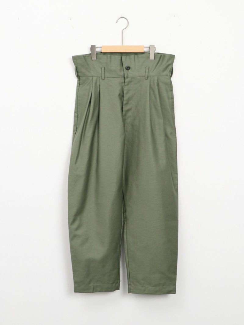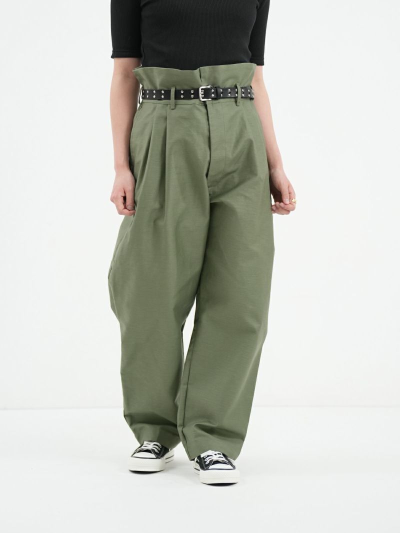 RONNIE SCOTT'S別注、デザインの効いたハイウエストワークパンツ。 ハリのあるコットン100%で仕立ててあり立体感のあるシルエットに。ウエストにタックが入ったテーパードのシルエット。ベルトをぎゅっと閉めてパンツを主役にしたコーディネートがオススメです。