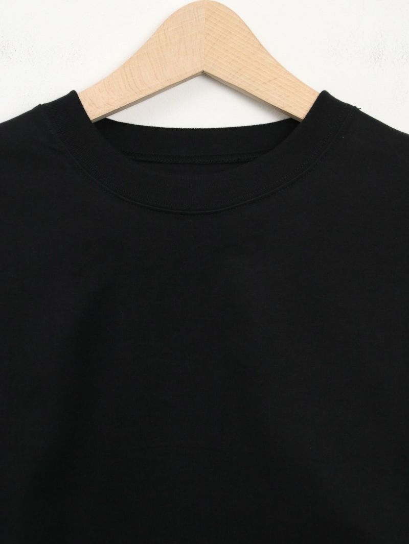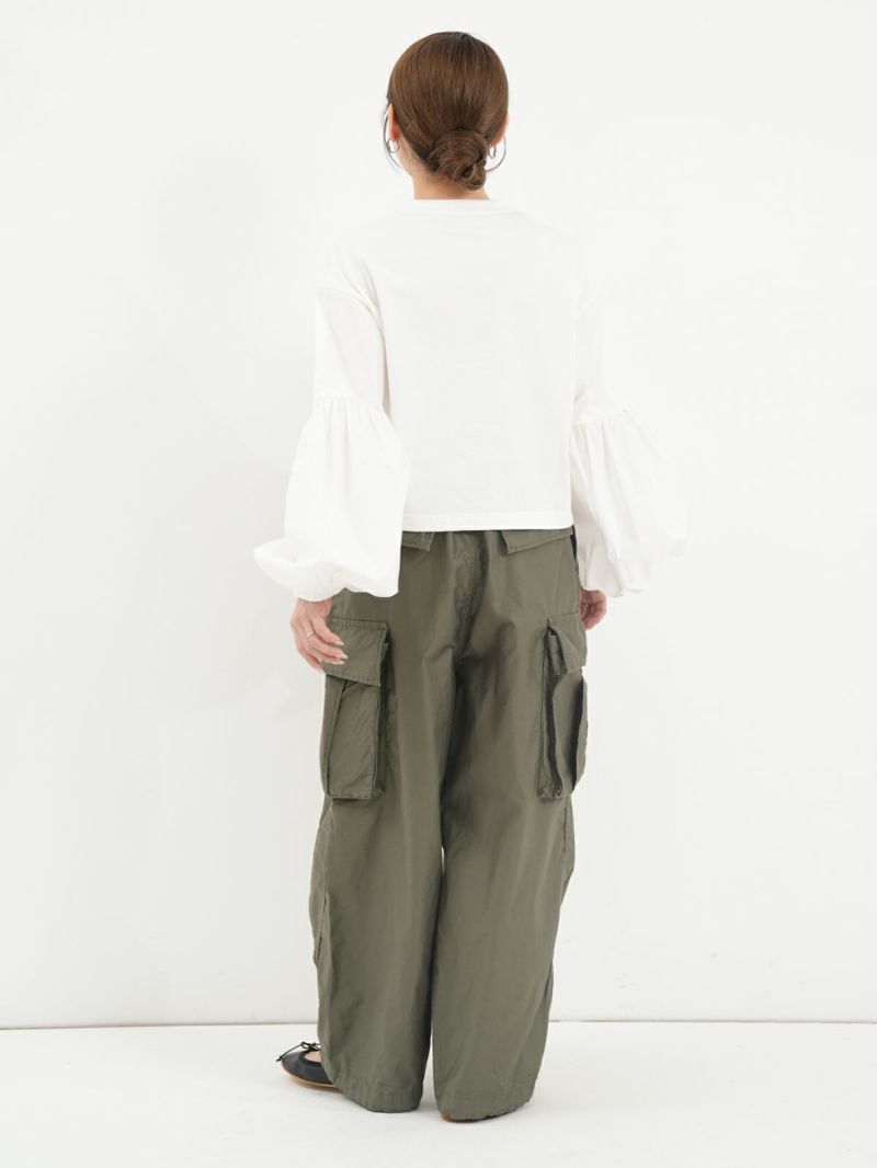 ウエストインをせずにボリュームのあるボトムスとのバランスが取りやすい一枚。シンプルになりがちなワイドパンツとのコーディネートがオススメです。