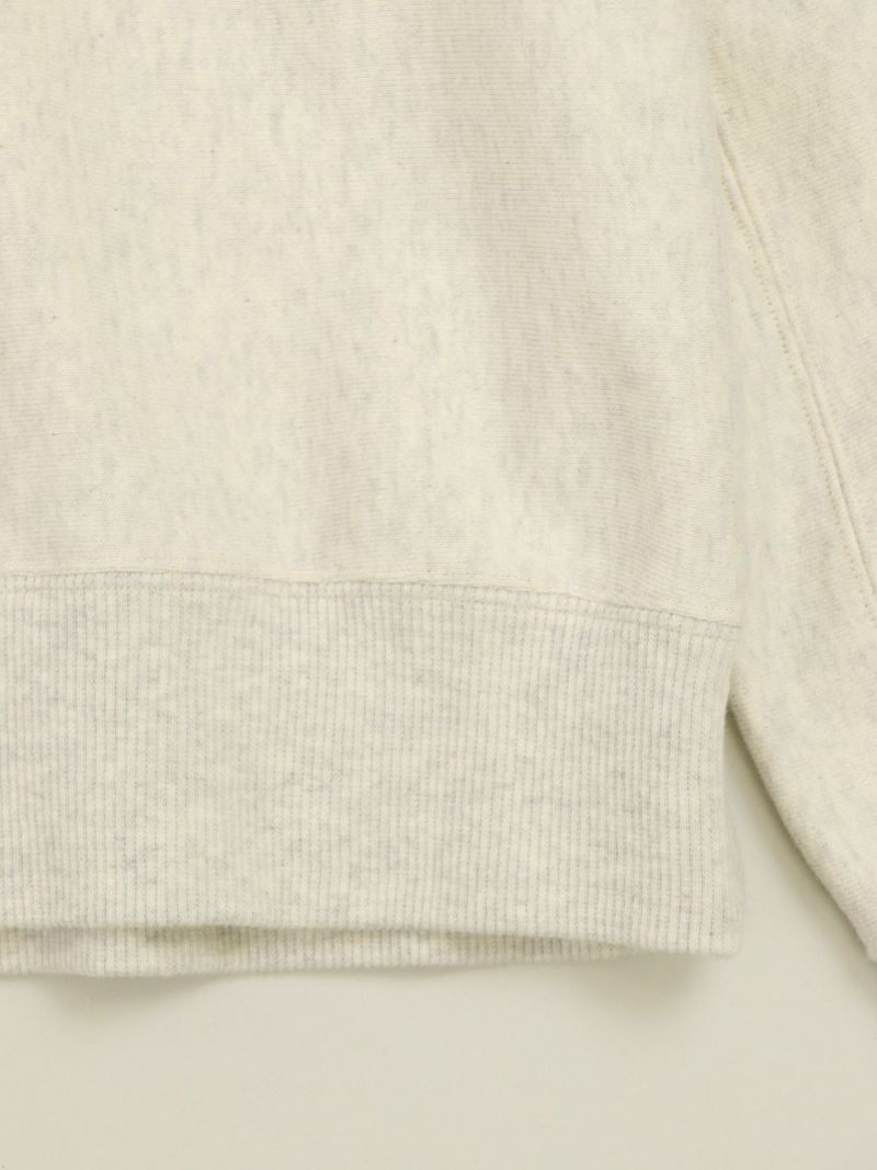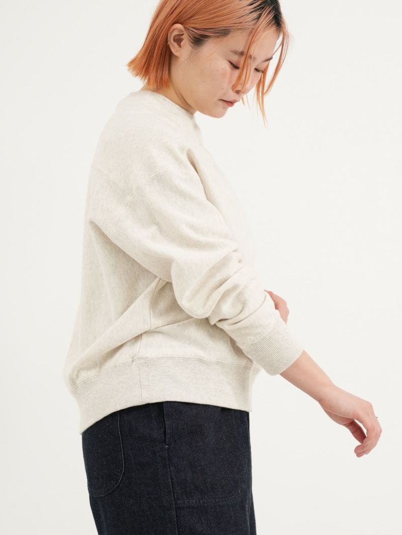 肌触り柔らかなスウェットプルオーバー。 ベビー裏毛で季節の変わり目に程よい生地感です。肩と袖に切り替えがあるのと、胸元のロゴがポイントです。
