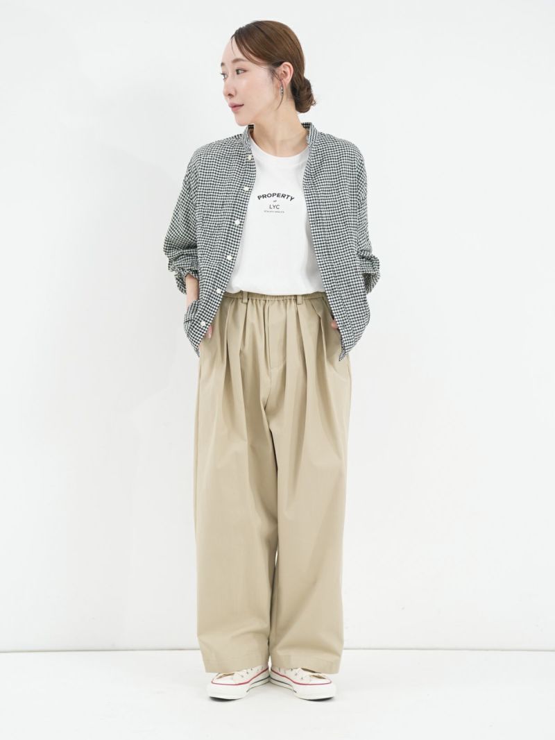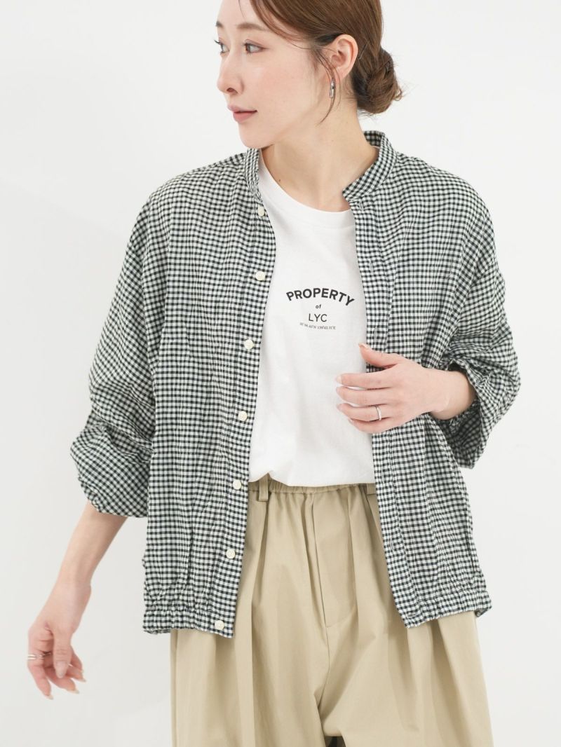 シャーリングが魅力のチェックシャツ。 さらっとした着心地で肌離れもよく◎裾はゴム仕様になっているのでブルゾン風にも着用していただけます。アイロンがけ不要なのもうれしいポイントです。