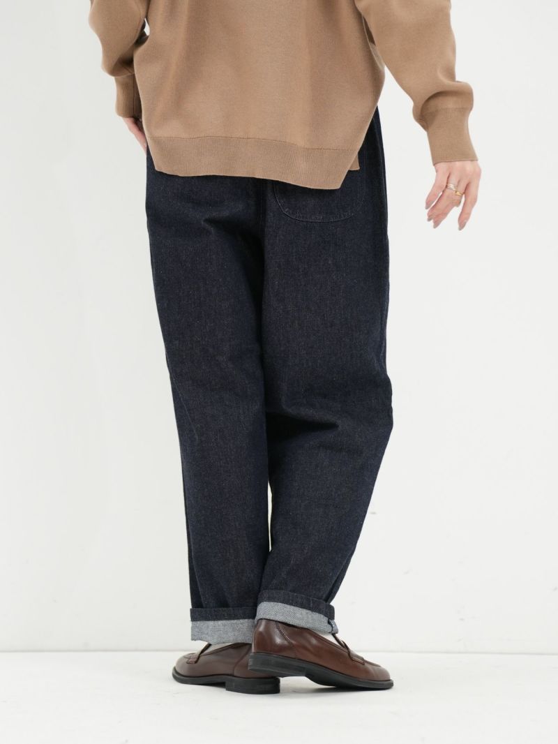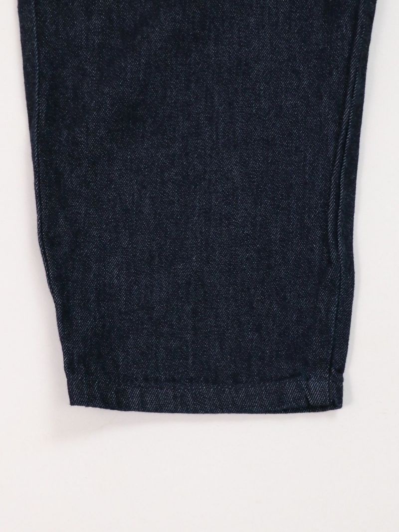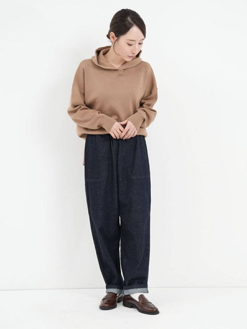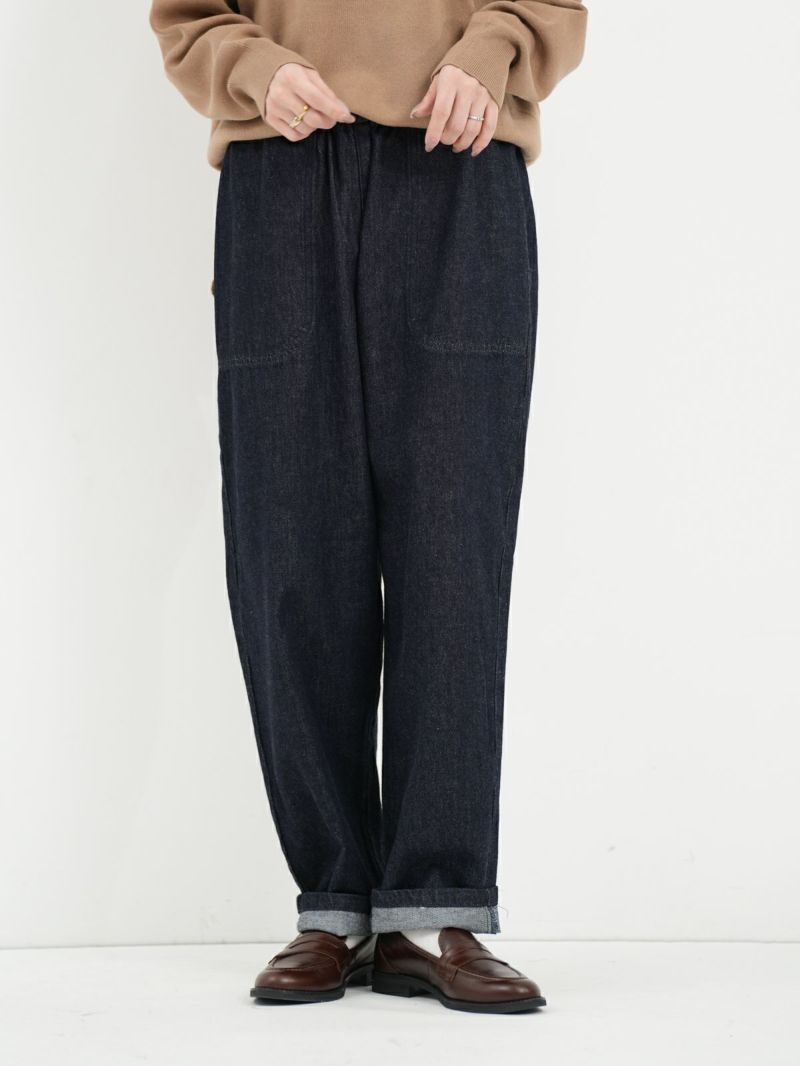 インディゴ染めの深みのある色合いとごわつきのないソフトな肌触りが魅力のパンツ。 ウエストがゴム使用になっているため締め付け感がなく楽な着心地で、ストレートに近いテーパードシルエットです。
