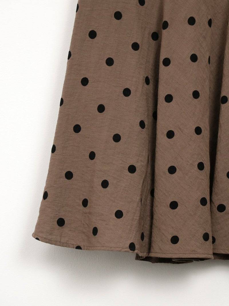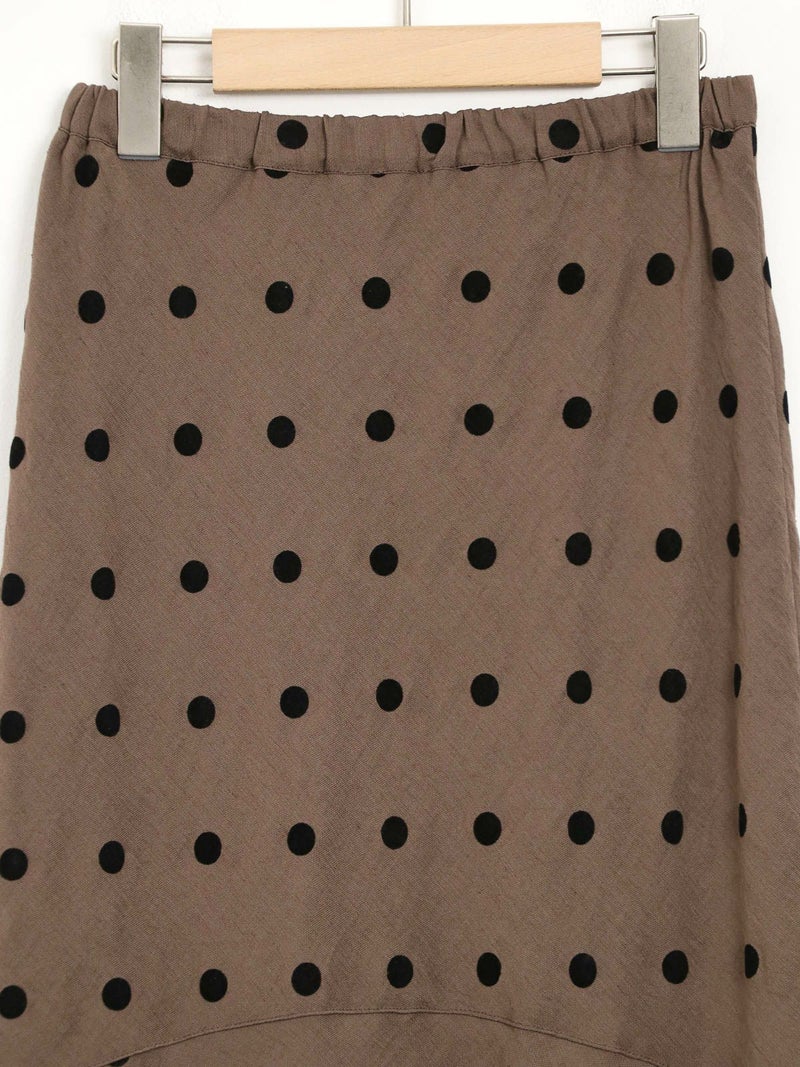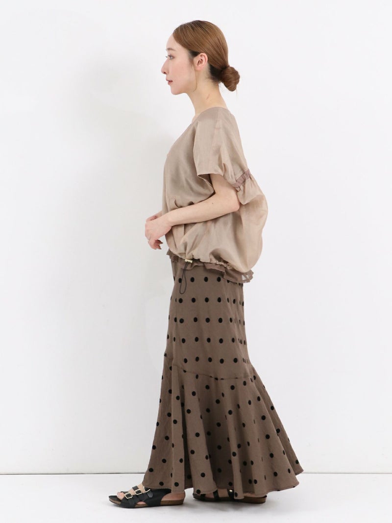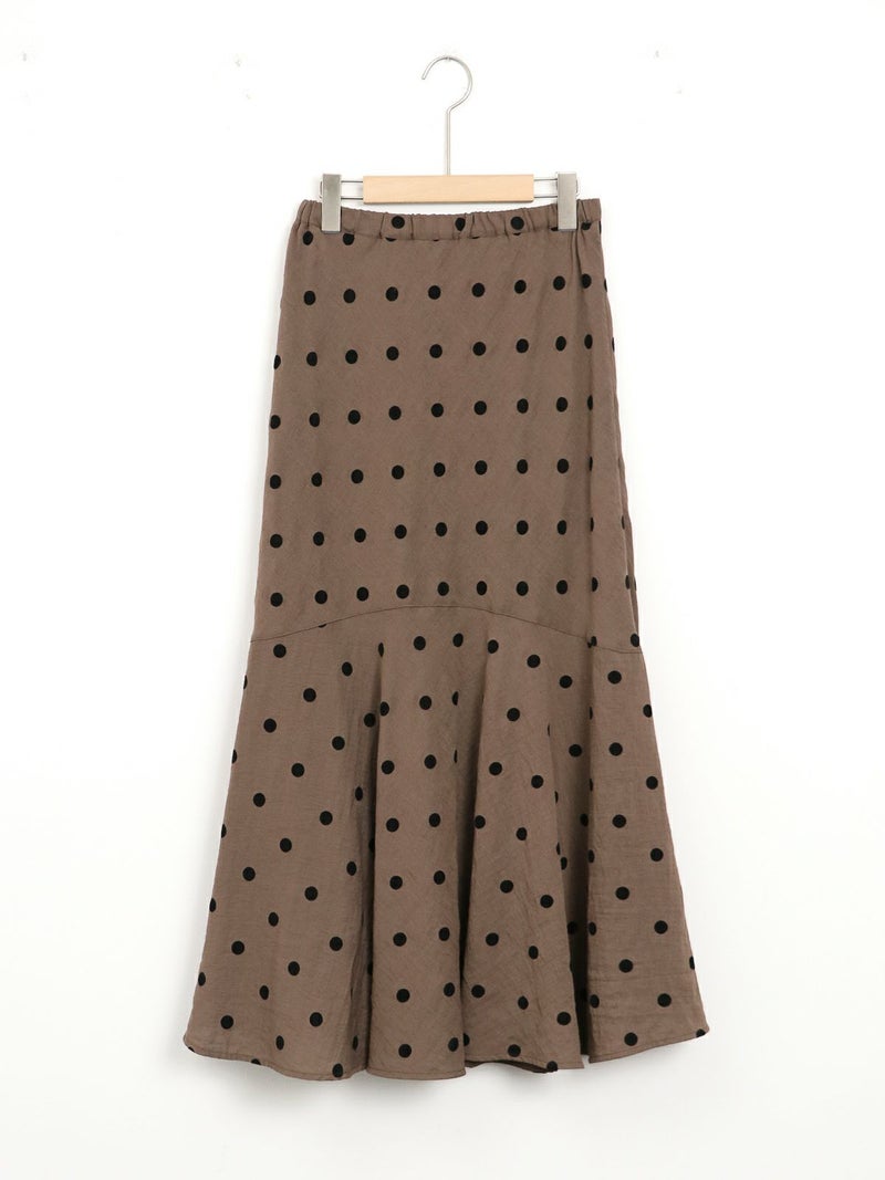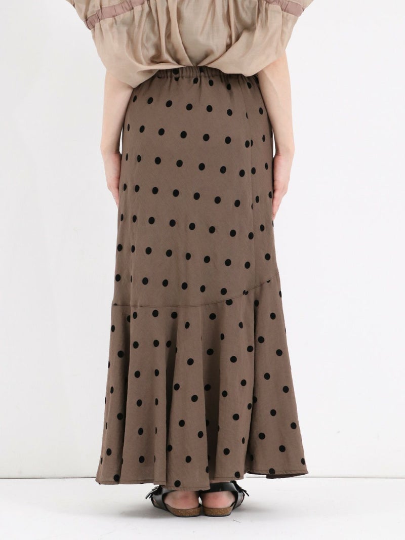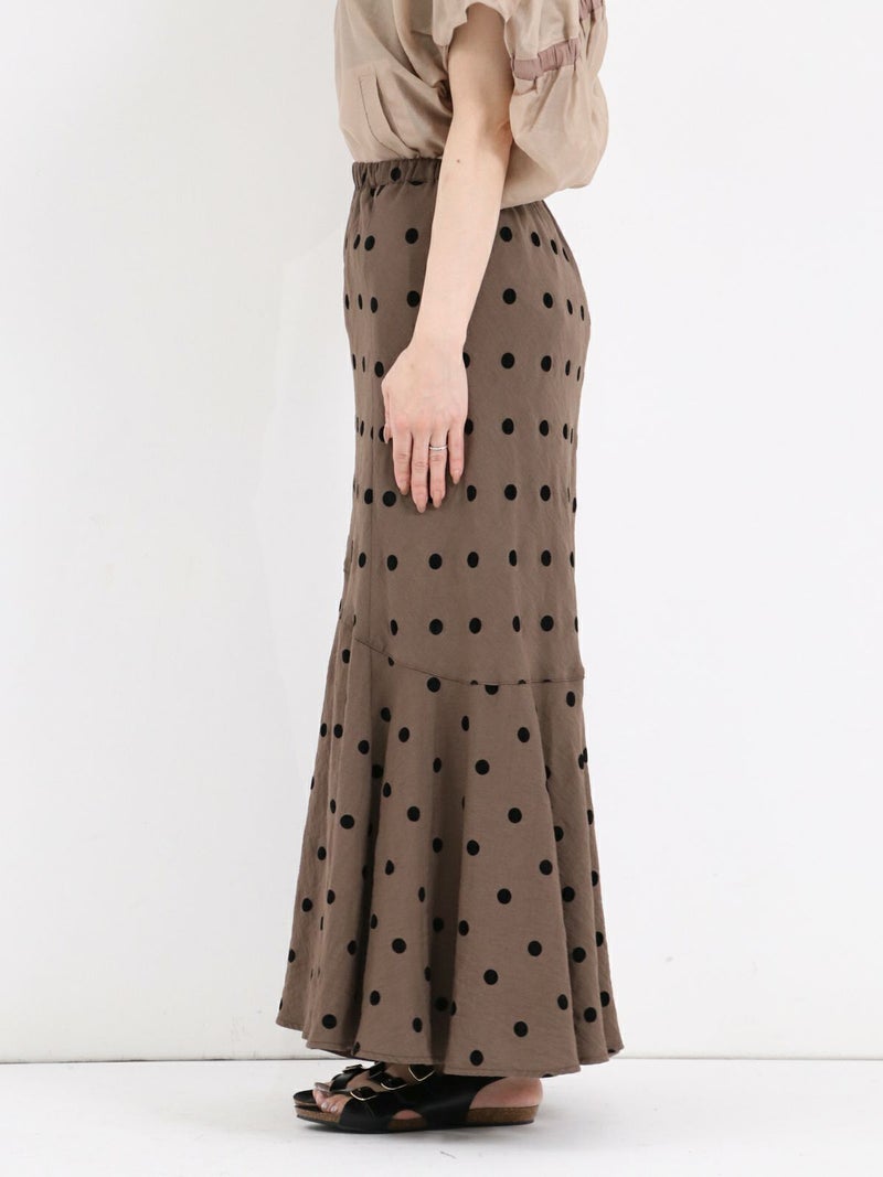 身体に沿うような女性らしいシルエットのマーメイドスカート。生地をバイアス裁ちして落ち感と横伸び感をプラス。クラスカルなフロッキードットもコーディネートのアクセントになります。ウエストゴム。裏地付き。