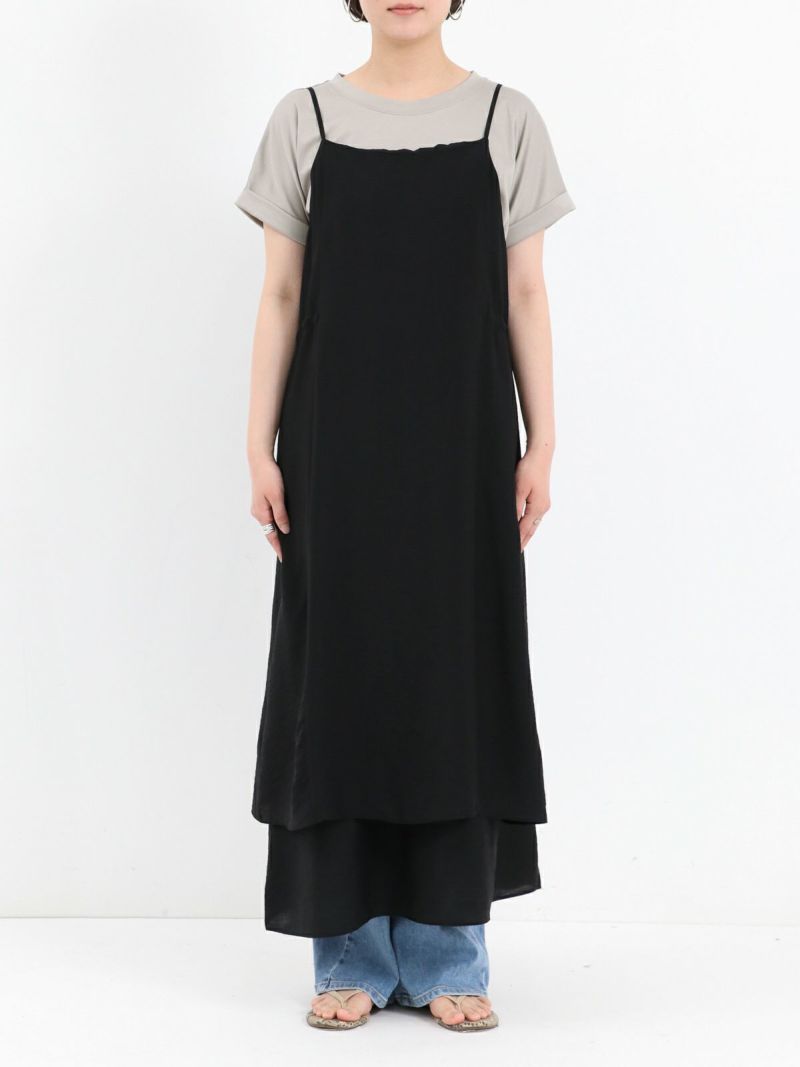 後ろリボンのシンプルなキャミワンピース。 わき腹から後ろまで入った紐を絞ることでウエストマークされ、スタイルアップして見えるワンピース。 シワ感のある生地で、カジュアルなコーデにも使いやすいアイテムです。 裾がティアードデザインになっているのもポイント。 パンツと合わせたレイヤードスタイルもオススメです。