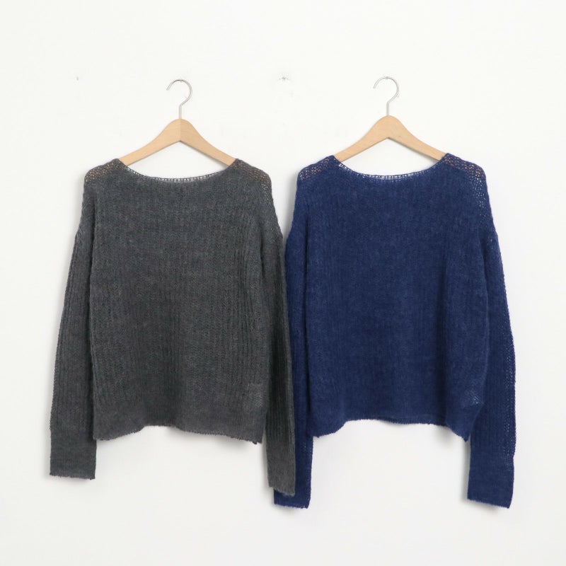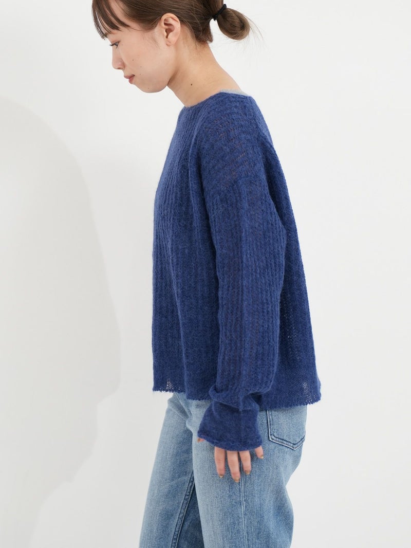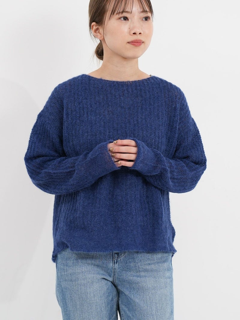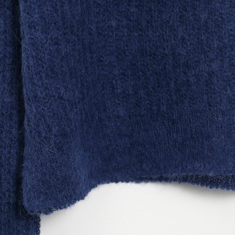 希少なスーリーアルパカを使用。通常のアルパカより光沢感があってなめらかで、暖かくて軽いのが特徴です。毛足が長めでフェミニンな雰囲気で着用でき、透け感があるのでインにTシャツやブラウスを合わせるのもオススメです。