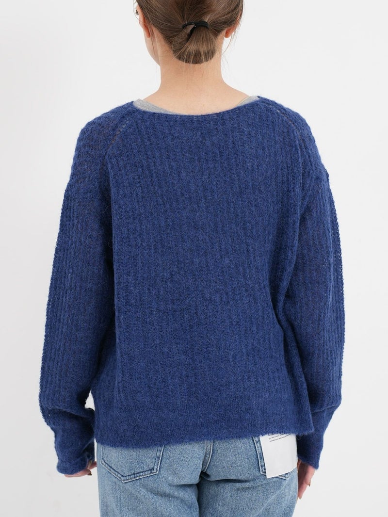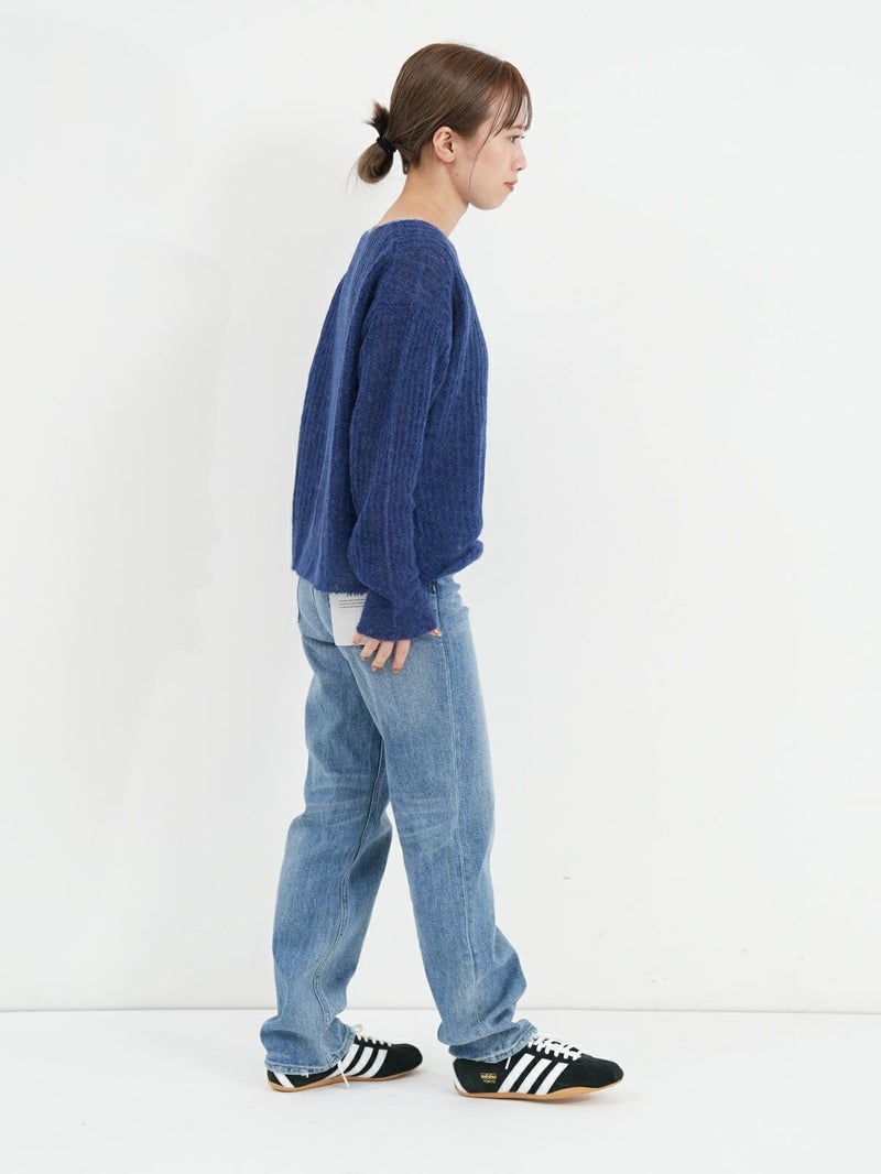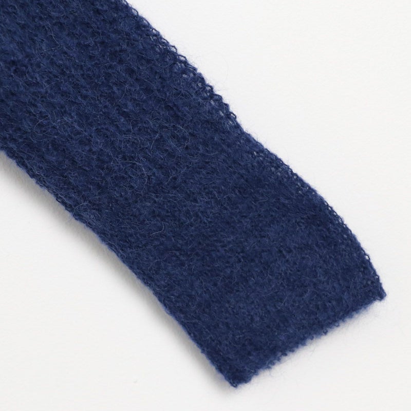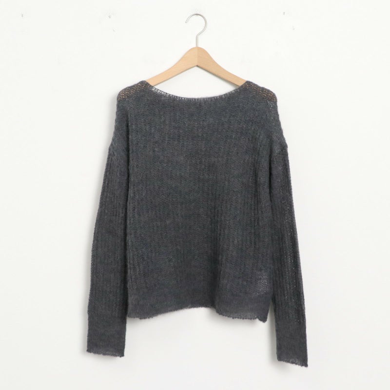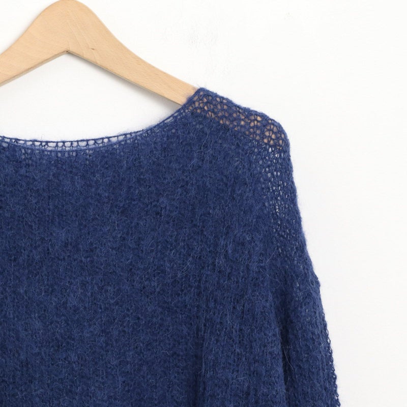 希少なスーリーアルパカを使用。通常のアルパカより光沢感があってなめらかで、暖かくて軽いのが特徴です。毛足が長めでフェミニンな雰囲気で着用でき、透け感があるのでインにTシャツやブラウスを合わせるのもオススメです。