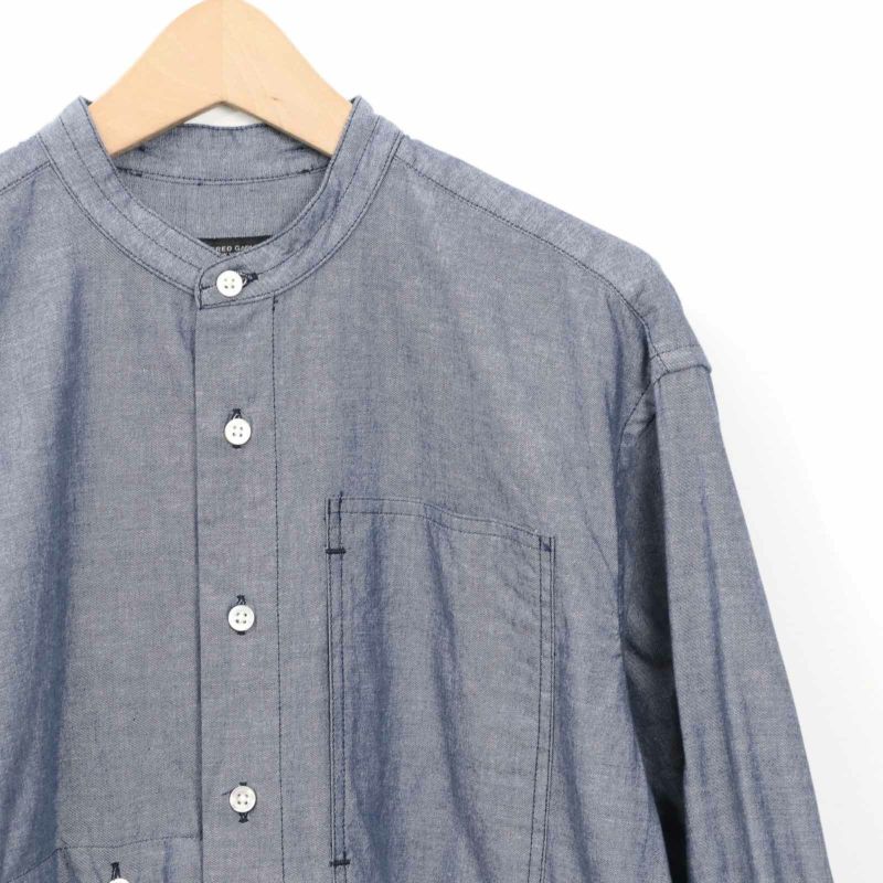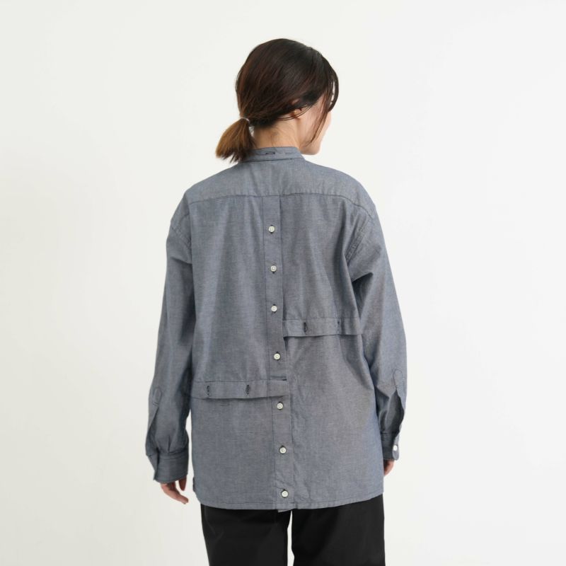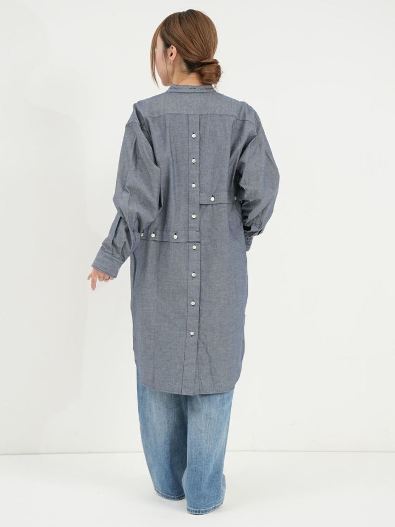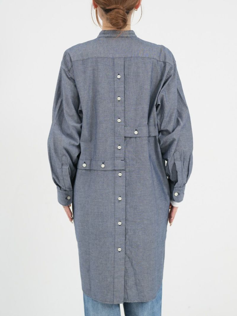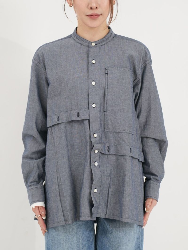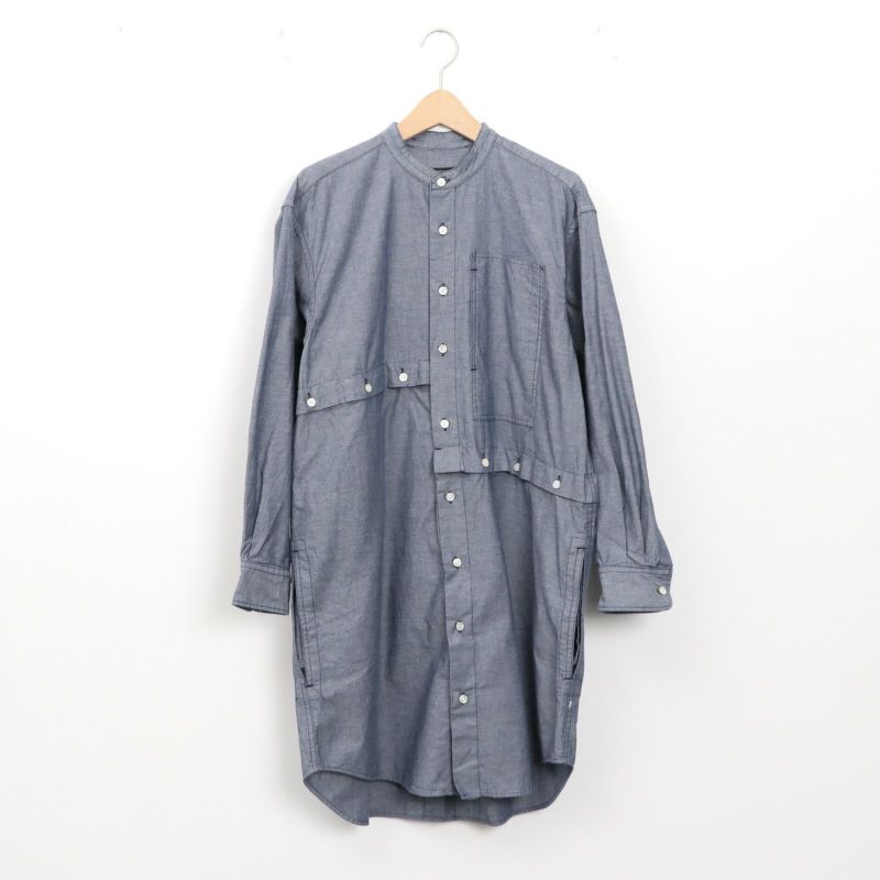インディゴカラーのバンドカラーシャツ。 着丈が変形する仕様になっており、通常時がロング丈、横部分のボタンを外すことでシャツの着丈を短くできます。1枚ではもちろん、ジャケットやコートのインナーにも幅広いスタイリングで着用していただけます。