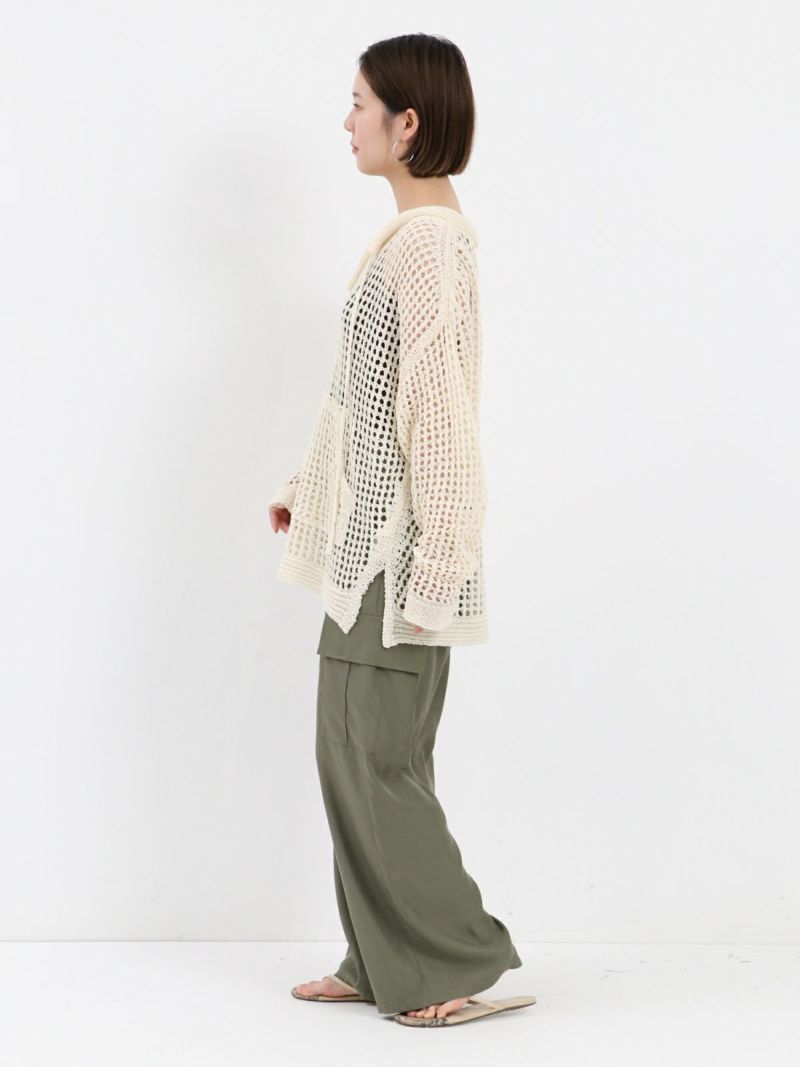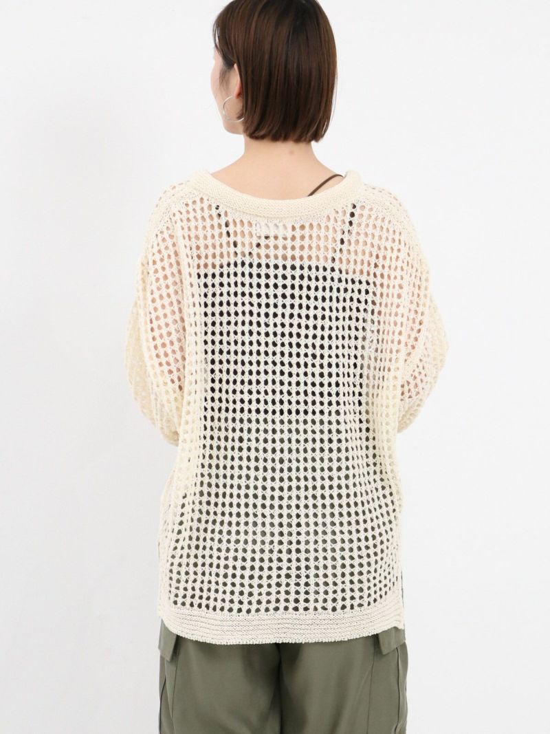 enricaのメッシュニットプルオーバー。 コード付きのスキッパーデザインとざっくりと編まれた透かし編みがトレンド感をプラス。和紙混糸を使用し、素材特有のシャリ感があるため涼しく着ていただけます。キャミソールやタンクトップを合わせたヘルシーな肌見せスタイルがおすすめです。