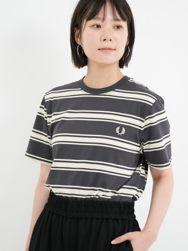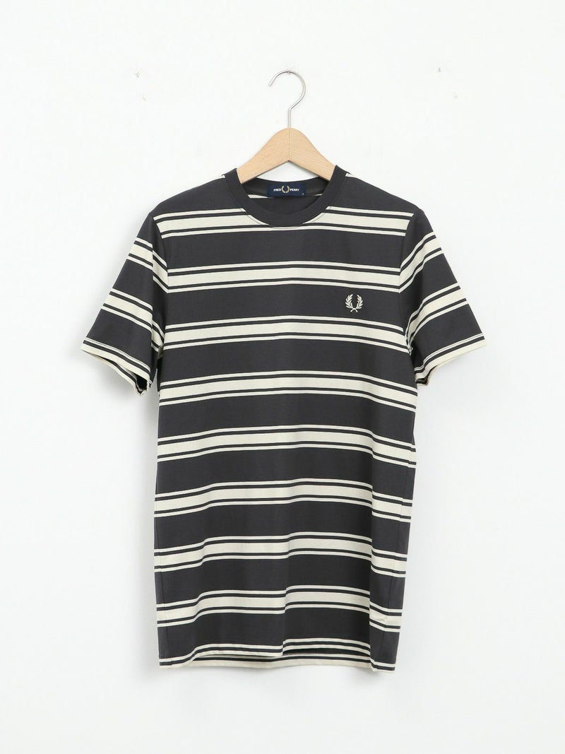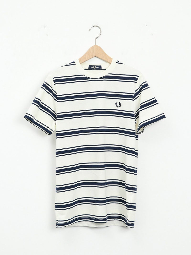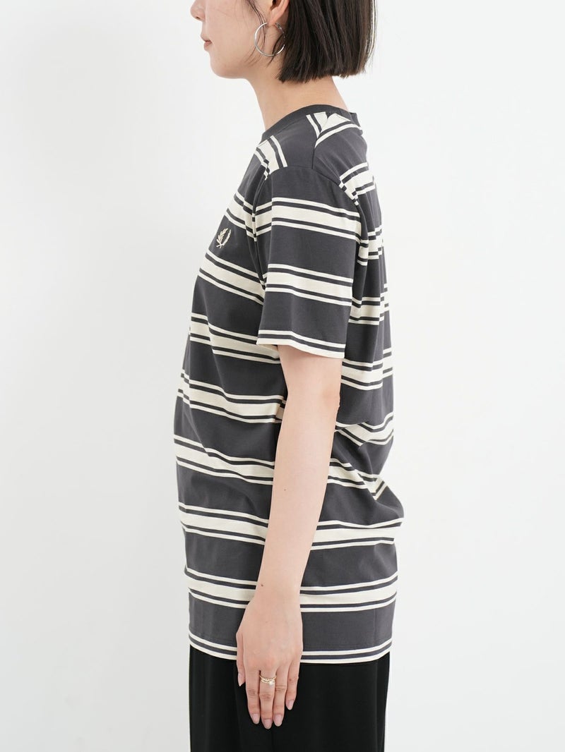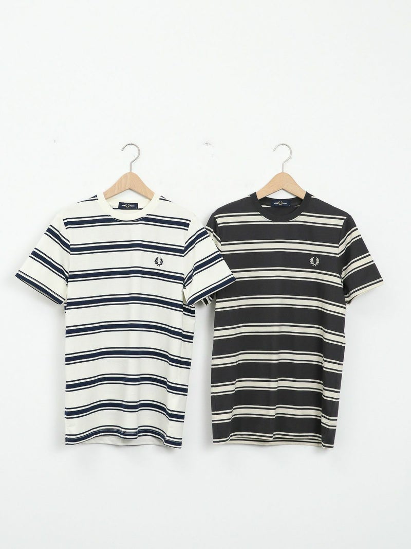 ピッチが太めのボーダーデザインが大人カジュアルコーデに馴染むショートスリーブTシャツ。 きれいめコーデやモードスタイルにもマッチする、落ち着いたトーンの配色がシックな雰囲気を放つ一枚です。FRED PERRYを象徴するローレルリースのワンポイントロゴ刺繍をあしらったベーシックなデザイン。中で身体が泳ぐくらいのレギュラーフィットシルエットながら、ルーズ過ぎずタイト過ぎない、バランスの良いサイジングがポイント。