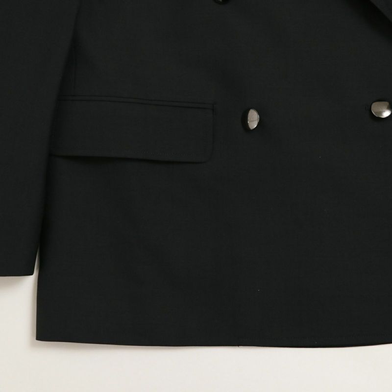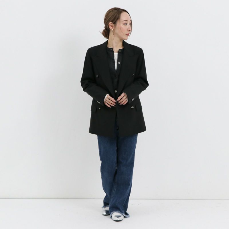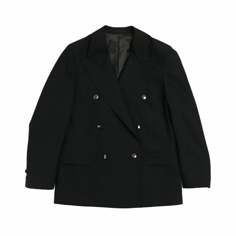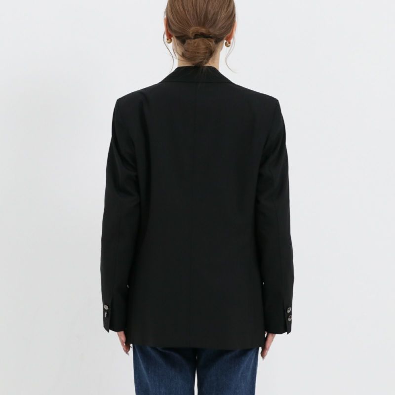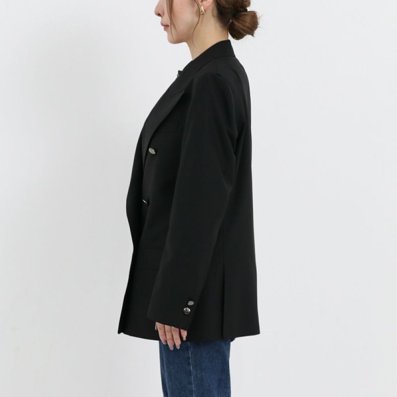 Gallery by ffs オリジナルのブレザーから、新色のブラックが登場! 大きく襟先の剣先が尖った形のピークドラペル仕様で、華やかさ、力強さ、上品さを表現しています。 ブラックカラーにシルバーボタンと、モードなデザインが特徴。 フォーマルからカジュアルまで、個性を出したい方へおすすめです。