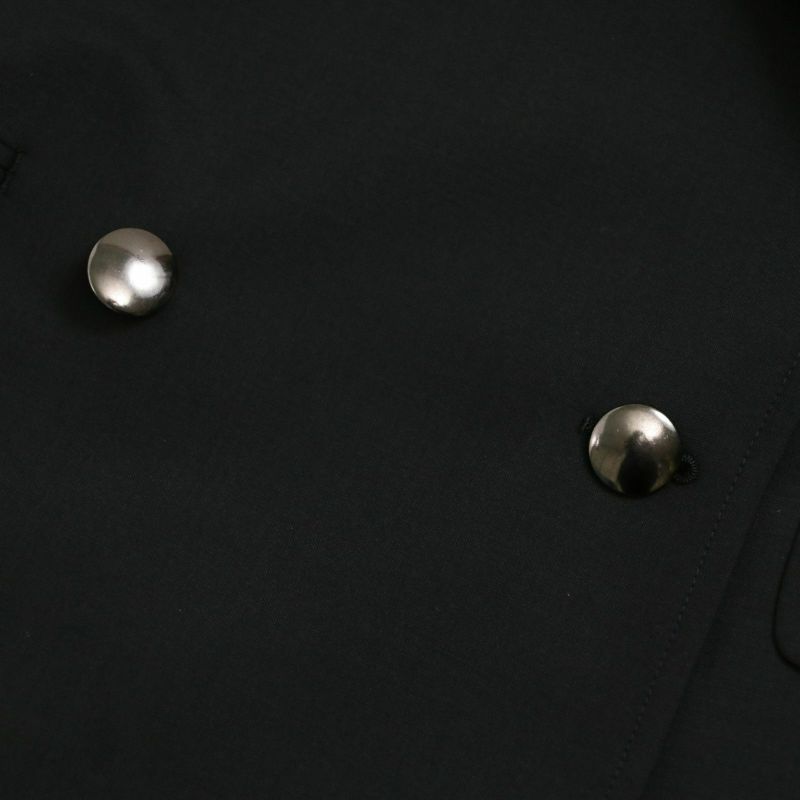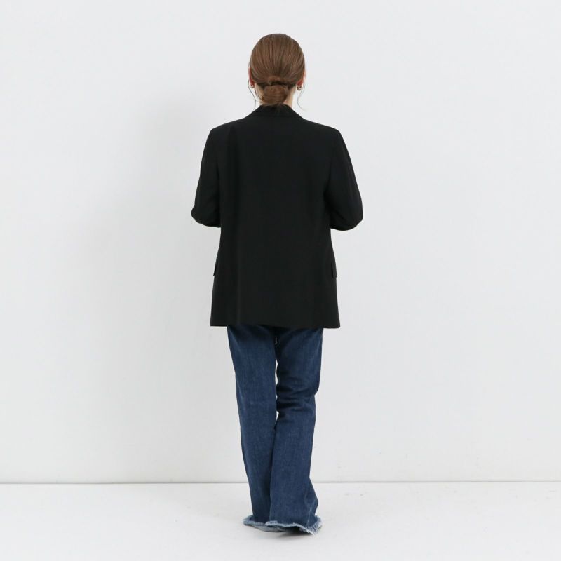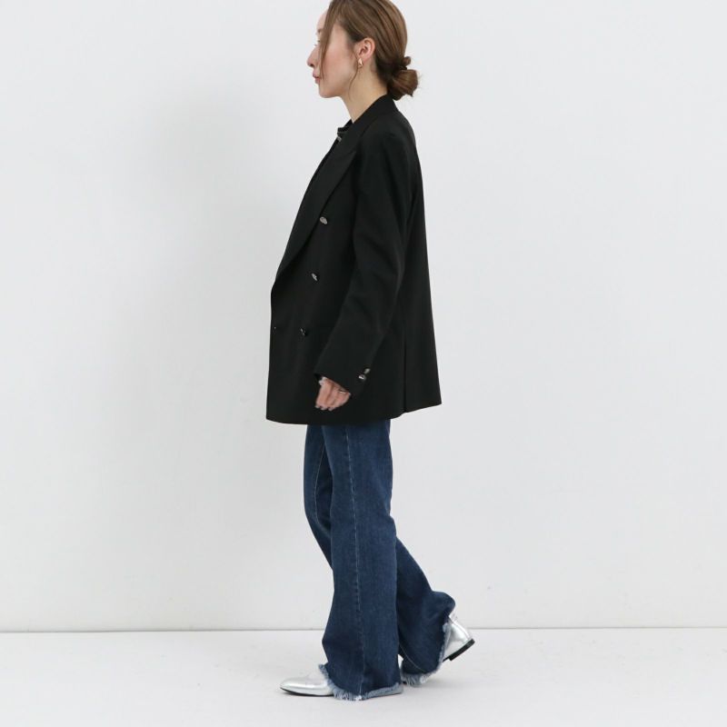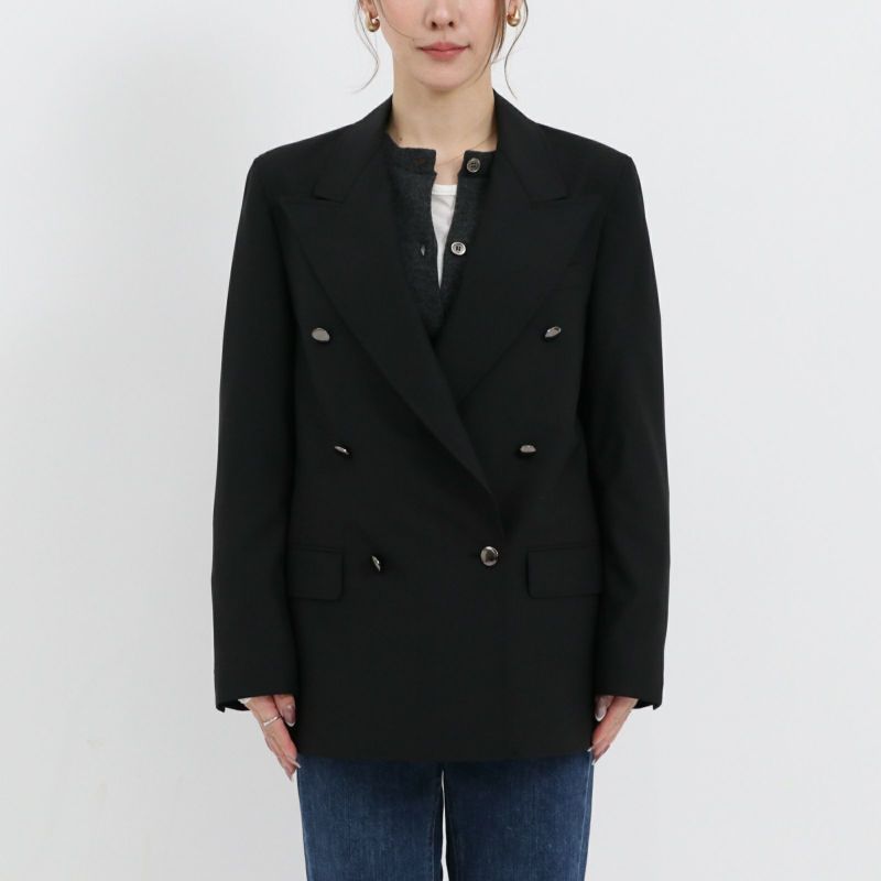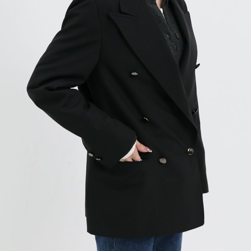 Gallery by ffs オリジナルのブレザーから、新色のブラックが登場! 大きく襟先の剣先が尖った形のピークドラペル仕様で、華やかさ、力強さ、上品さを表現しています。 ブラックカラーにシルバーボタンと、モードなデザインが特徴。 フォーマルからカジュアルまで、個性を出したい方へおすすめです。