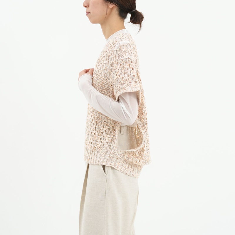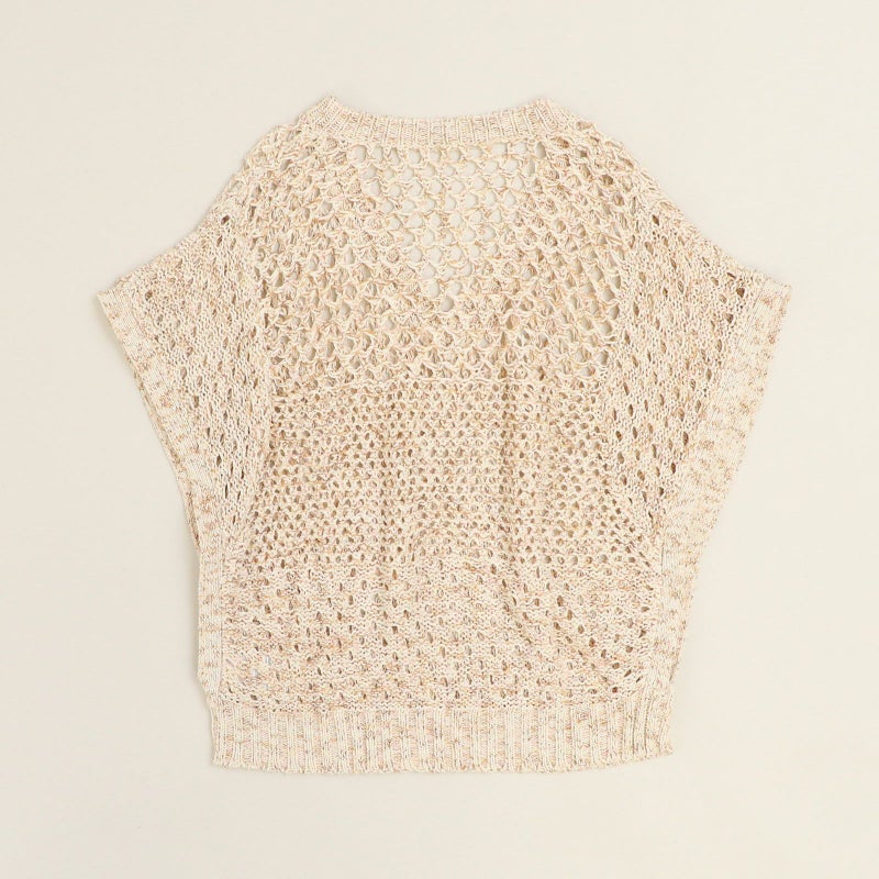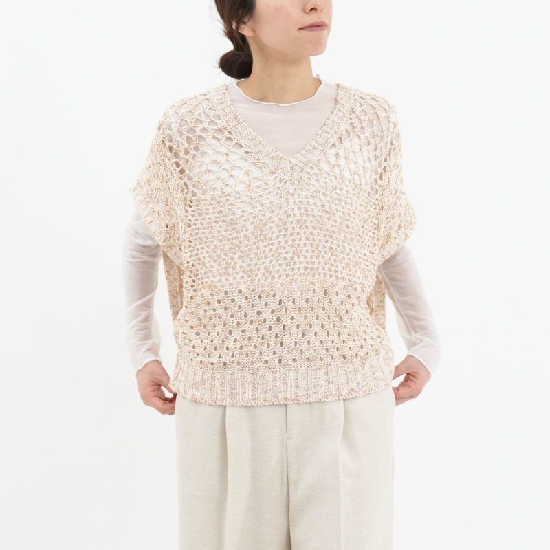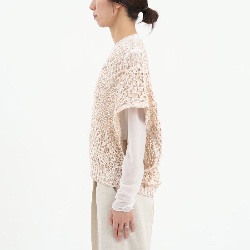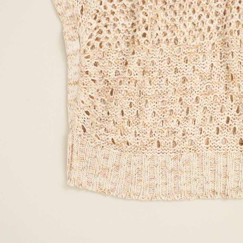 綿混紡の太番手糸を使用したLILLY LYNQUE定番、透かし編みのベスト。 編み柄を変化させた見た目にも可愛いニットトップス。インナーも合わせやすい丈感です。