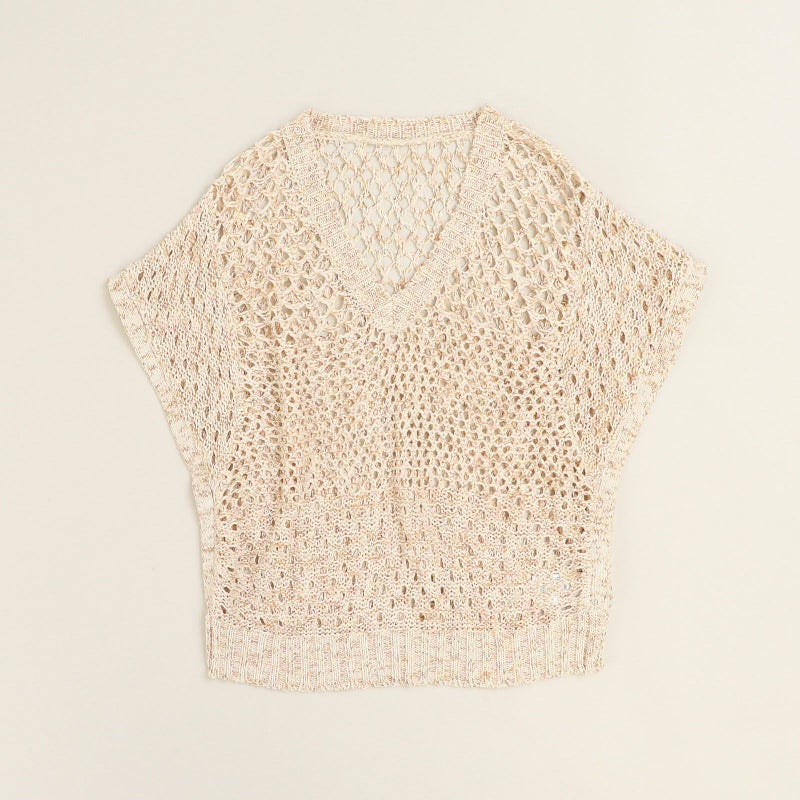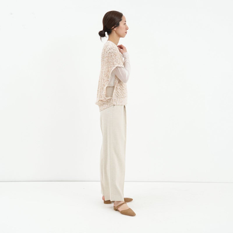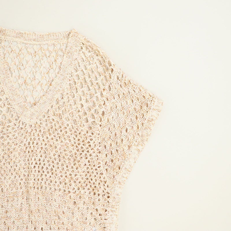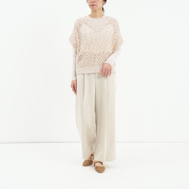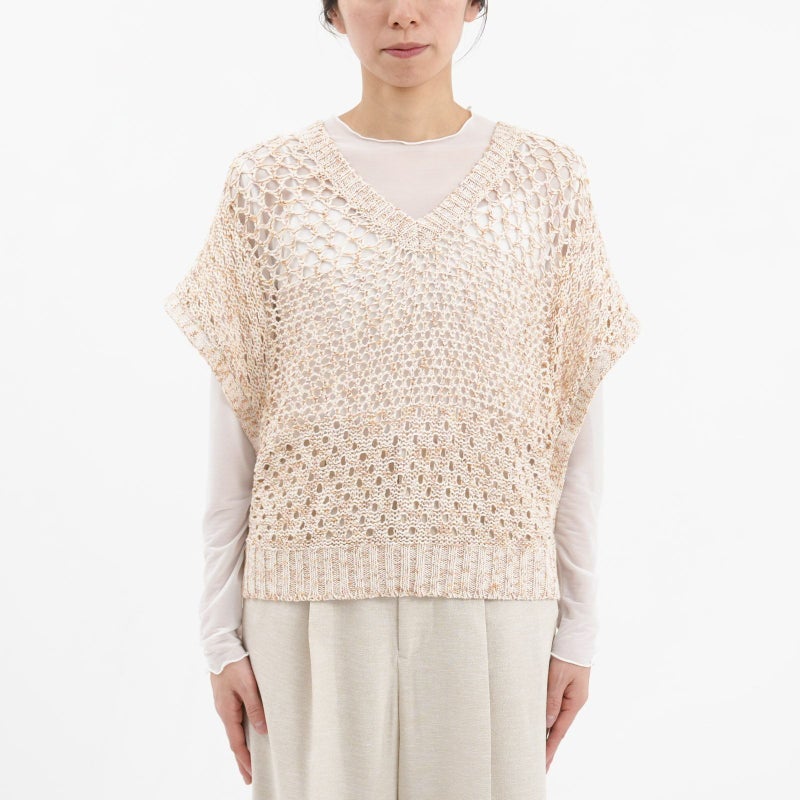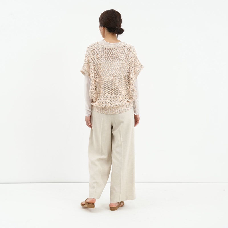 綿混紡の太番手糸を使用したLILLY LYNQUE定番、透かし編みのベスト。 編み柄を変化させた見た目にも可愛いニットトップス。インナーも合わせやすい丈感です。