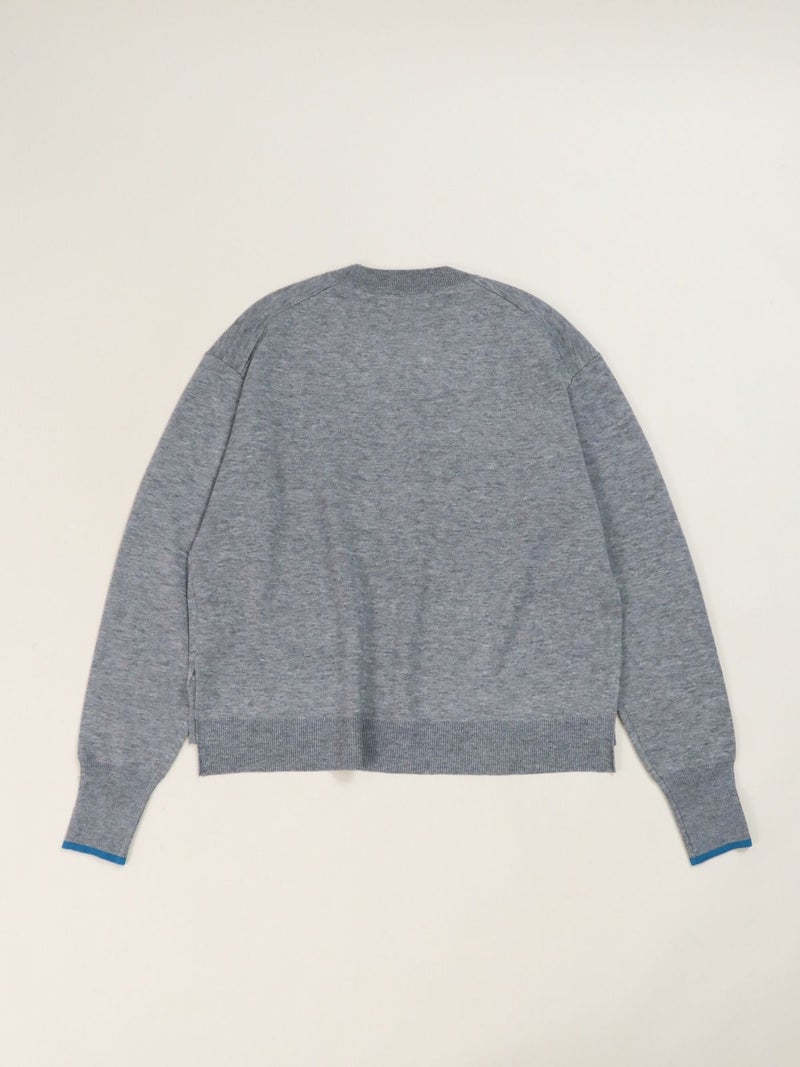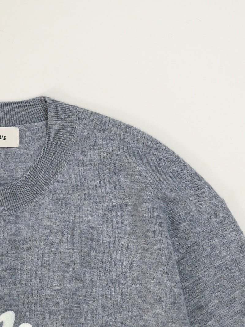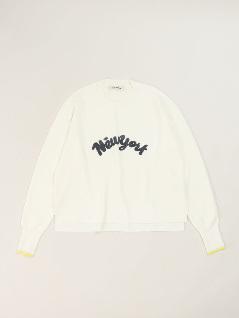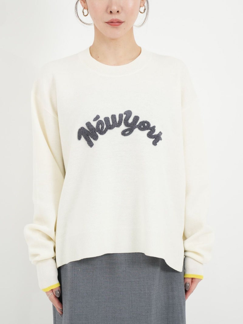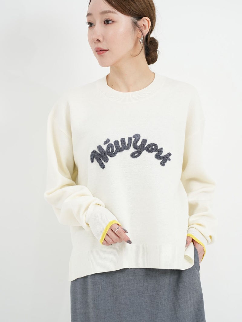 チェーンステッチでロゴを施したニットトップス。 ロゴをカーブでいれることで柔らかい印象に。袖先の配色もポイントです。Wool混でも繊細な糸なのでチクチク感を感じにくく肌触りもとても良い1枚です。