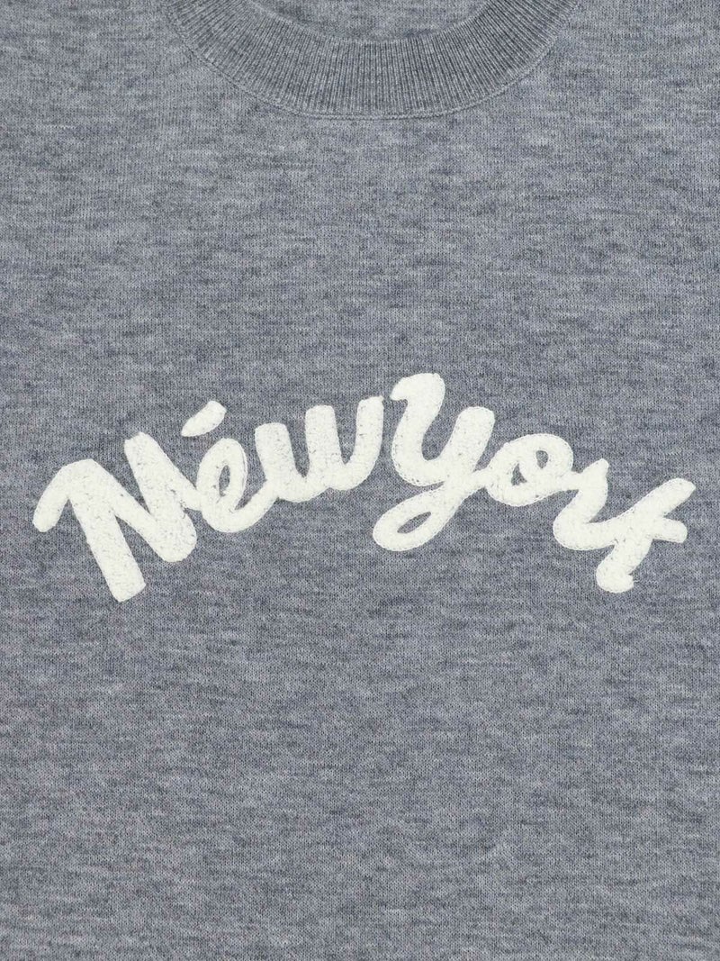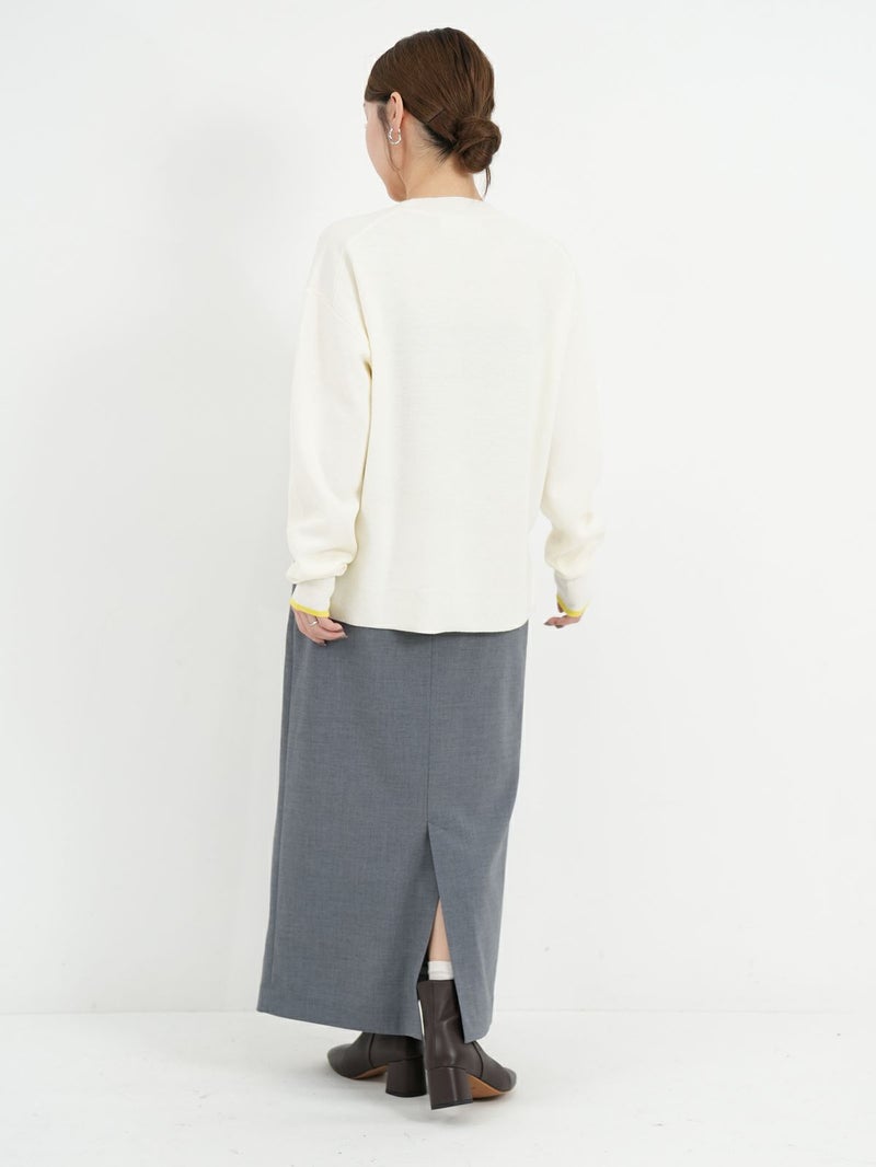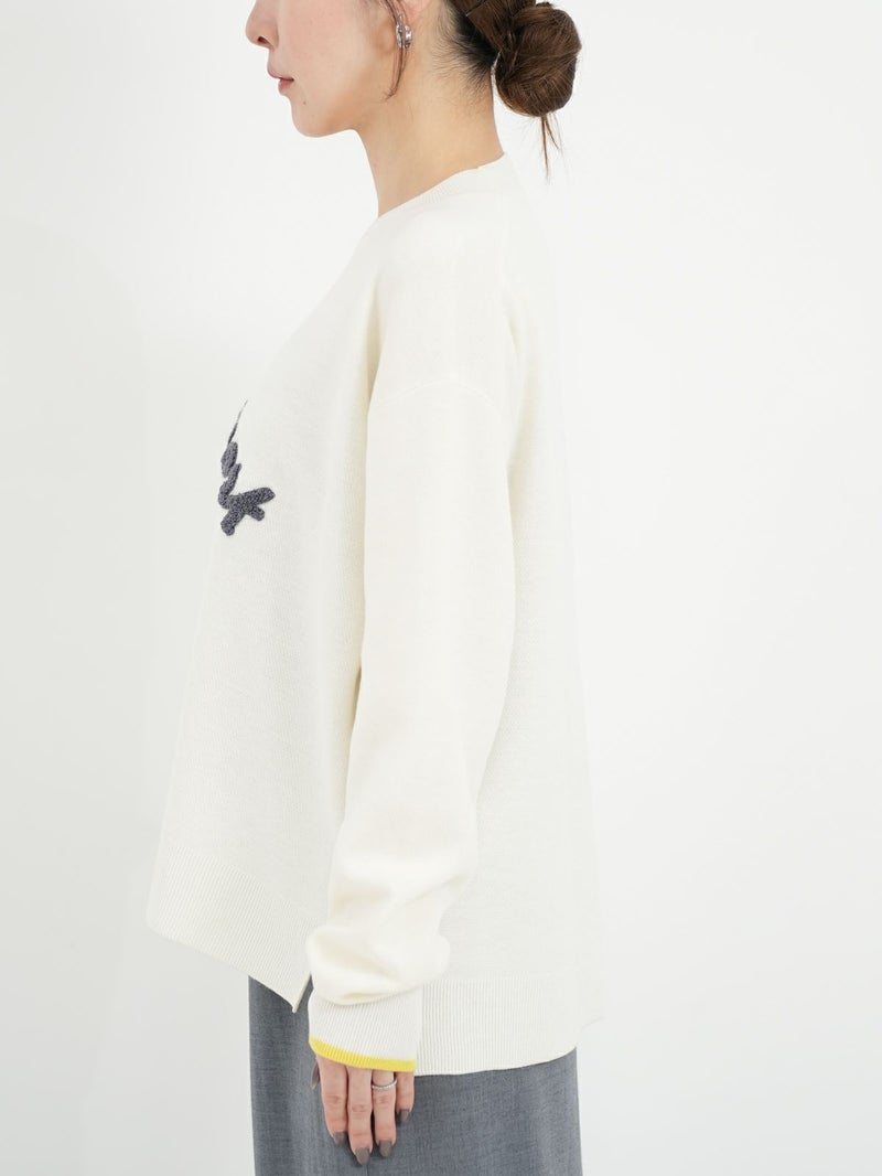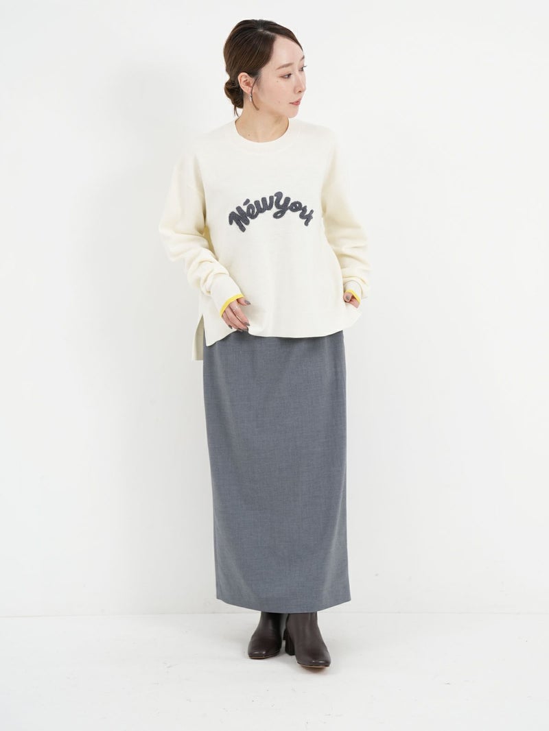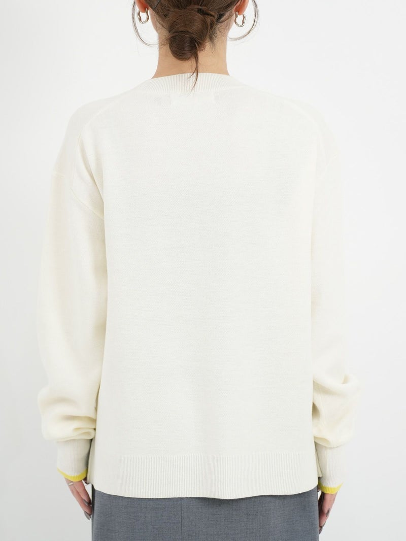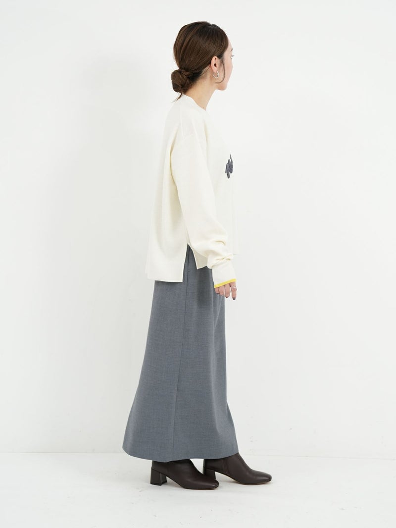 チェーンステッチでロゴを施したニットトップス。 ロゴをカーブでいれることで柔らかい印象に。袖先の配色もポイントです。Wool混でも繊細な糸なのでチクチク感を感じにくく肌触りもとても良い1枚です。