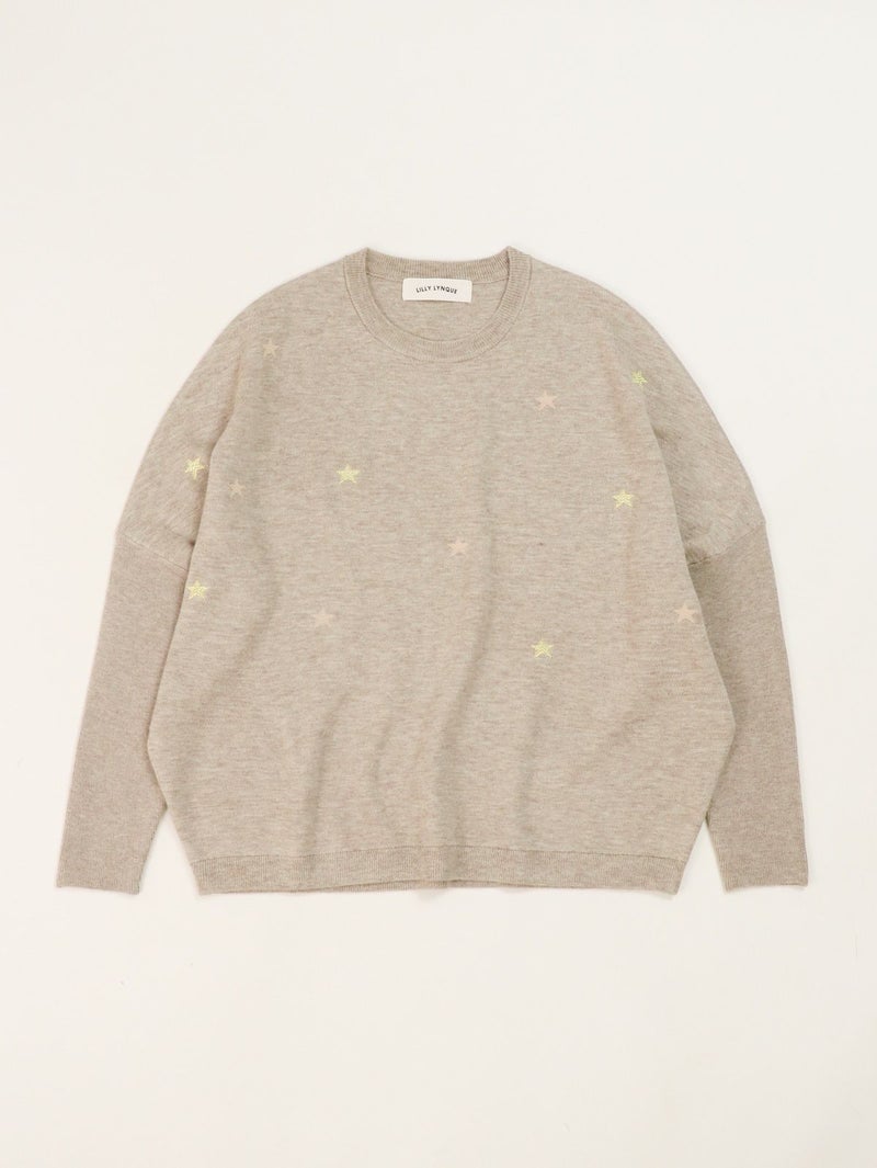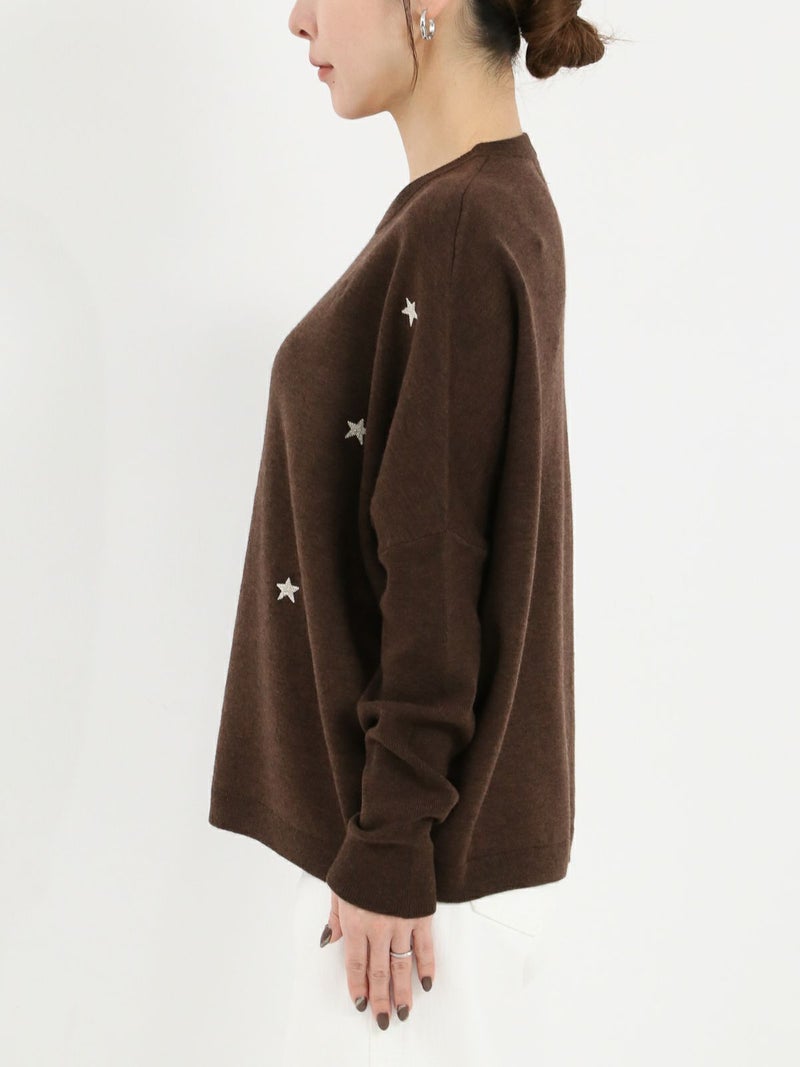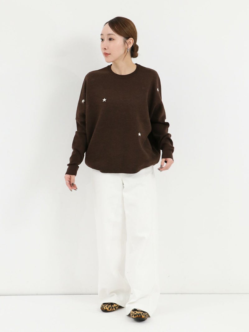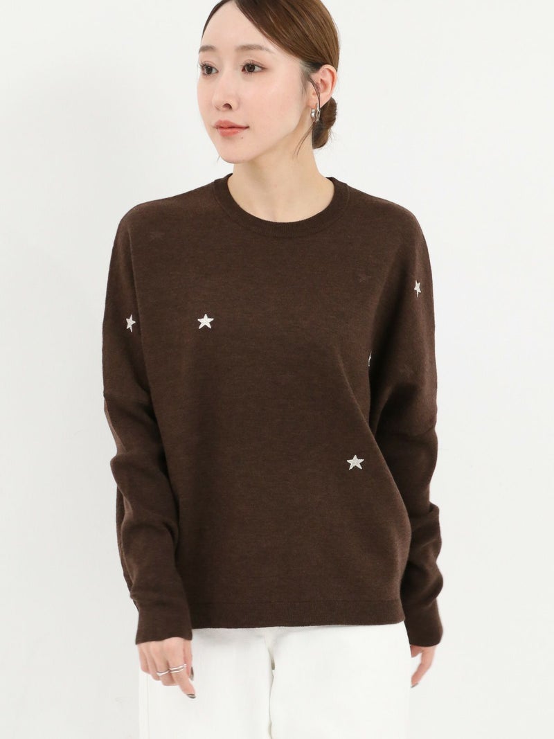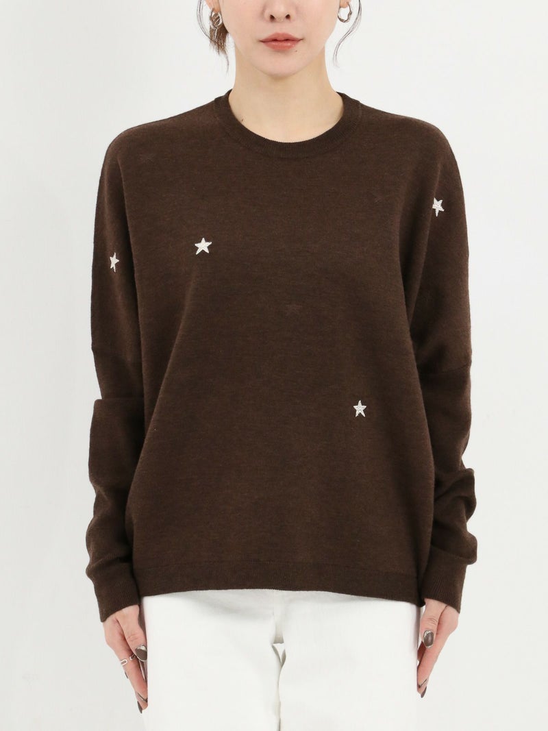 スター刺繍がポイントになったハイゲージニット。 シンプルなクルーネックデザインに、さりげなく輝く星の刺繍を散りばめました。ハイゲージならではのきれいめな表情で、カジュアルすぎず上品な印象に。ウール混ながら繊細な糸を使用しているため、ちくちくしにくく肌触りもやさしい着心地です。どんなボトムにも合わせやすく、デイリーに活躍してくれる1枚です。