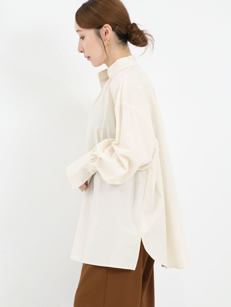 くったりと柔らかなコットン100%素材が心地よい、大人のためのスタンドカラーシャツ。 首周りに施した繊細なギャザーが、さりげないアクセントとなり、一枚で着るだけで顔周りを華やかに見せてくれます。程よくゆとりのあるサイズ感と、ニュアンスが出る袖口のデザインが、シンプルながらもこなれた雰囲気を演出します。