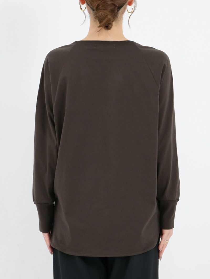 ゆとりを出した肩幅・身幅に長すぎない着丈のシルエット。アームと袖幅を広めにしたラグランスリーブに袖口にリブを付けた9分袖のデザインがポイントです。