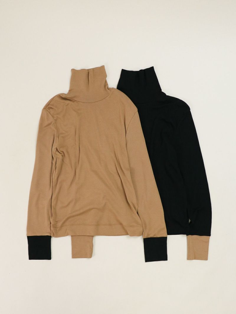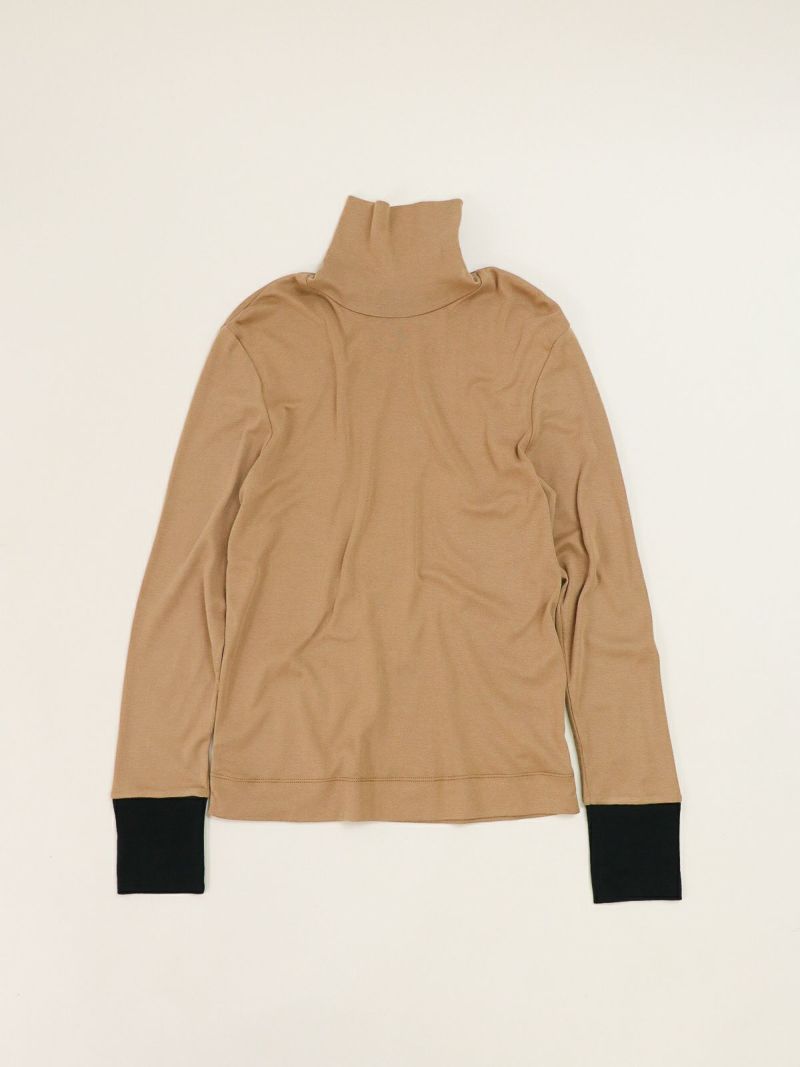 柔らかなコットン素材を使用したバイカラータートル。 袖口の異なるカラーの切り替えがアクセントになり、シンプルながらも程よく個性をプラスしてくれます。窮屈感のない優しいフィット感で1枚着はもちろんジャケットやカーディガンのインナーにもおすすめです。