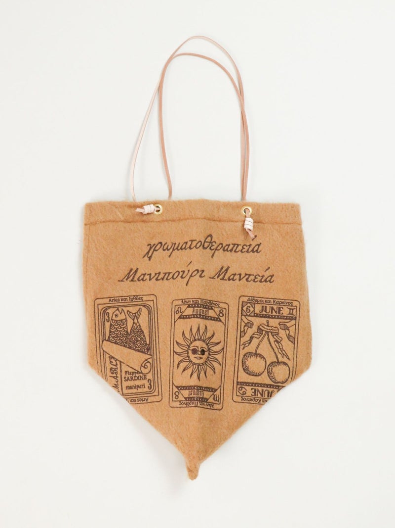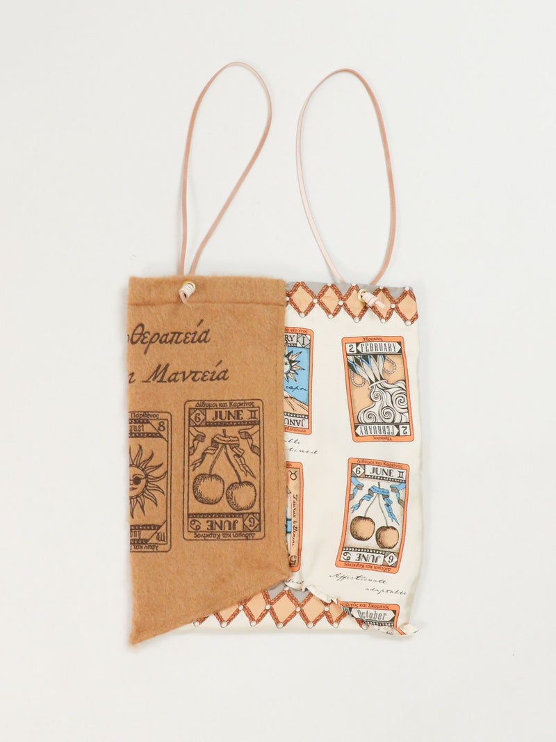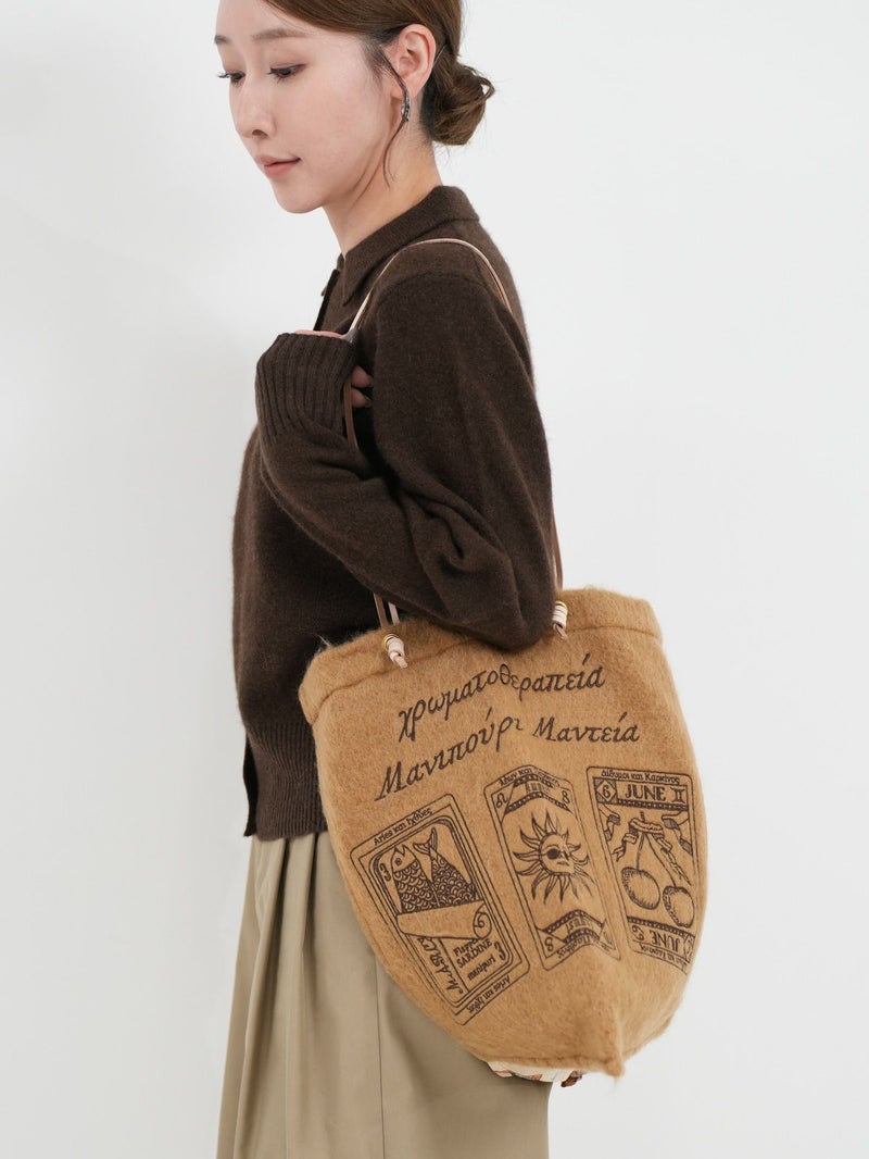 ウール生地とシルクスカーフの異素材を組み合わせた刺繍入りのバッグ。 持ち手がサイドに付いており、持った時のフォルムが三角形になるユニークなデザイン。軽量でA4も入るサイズ感。見る角度により様々な表情が楽しめると人気のトートバッグです。