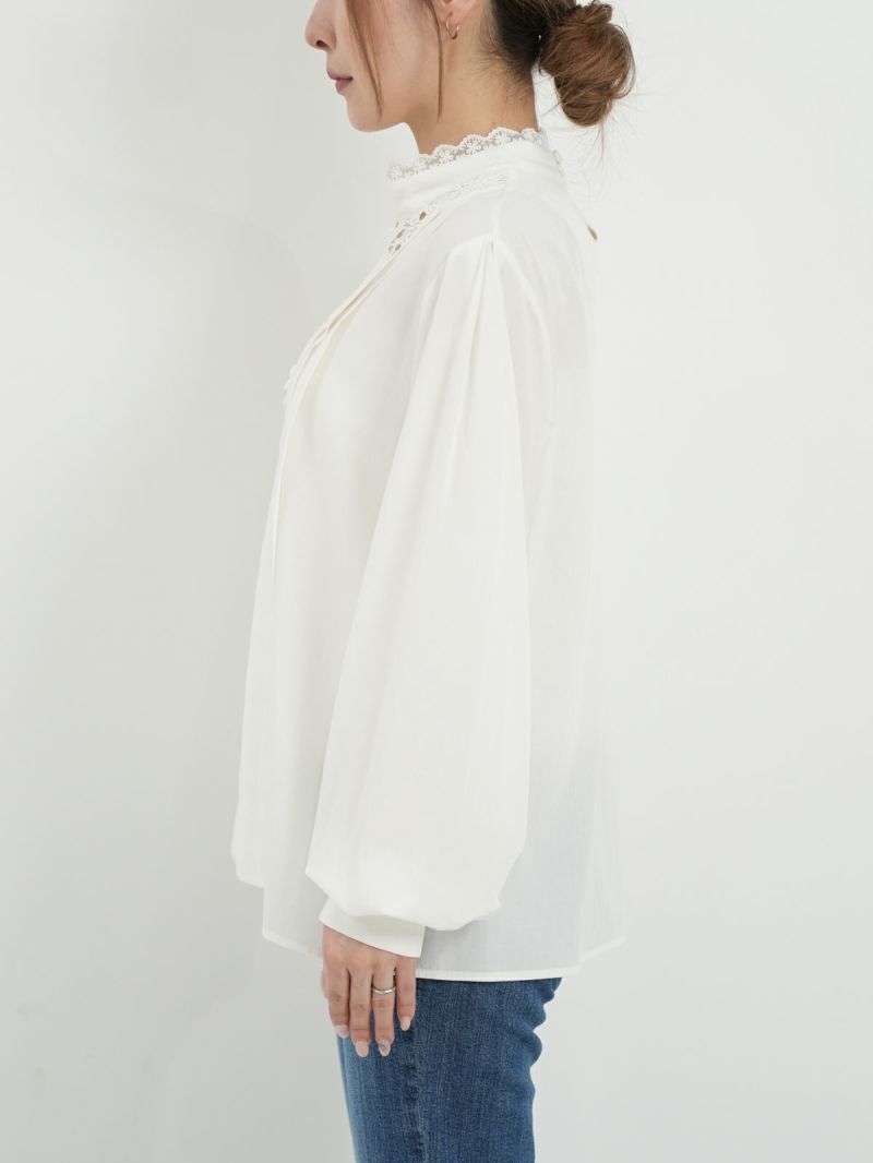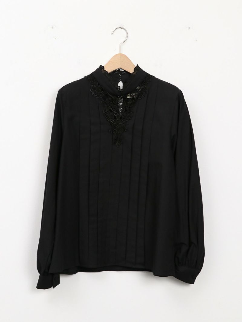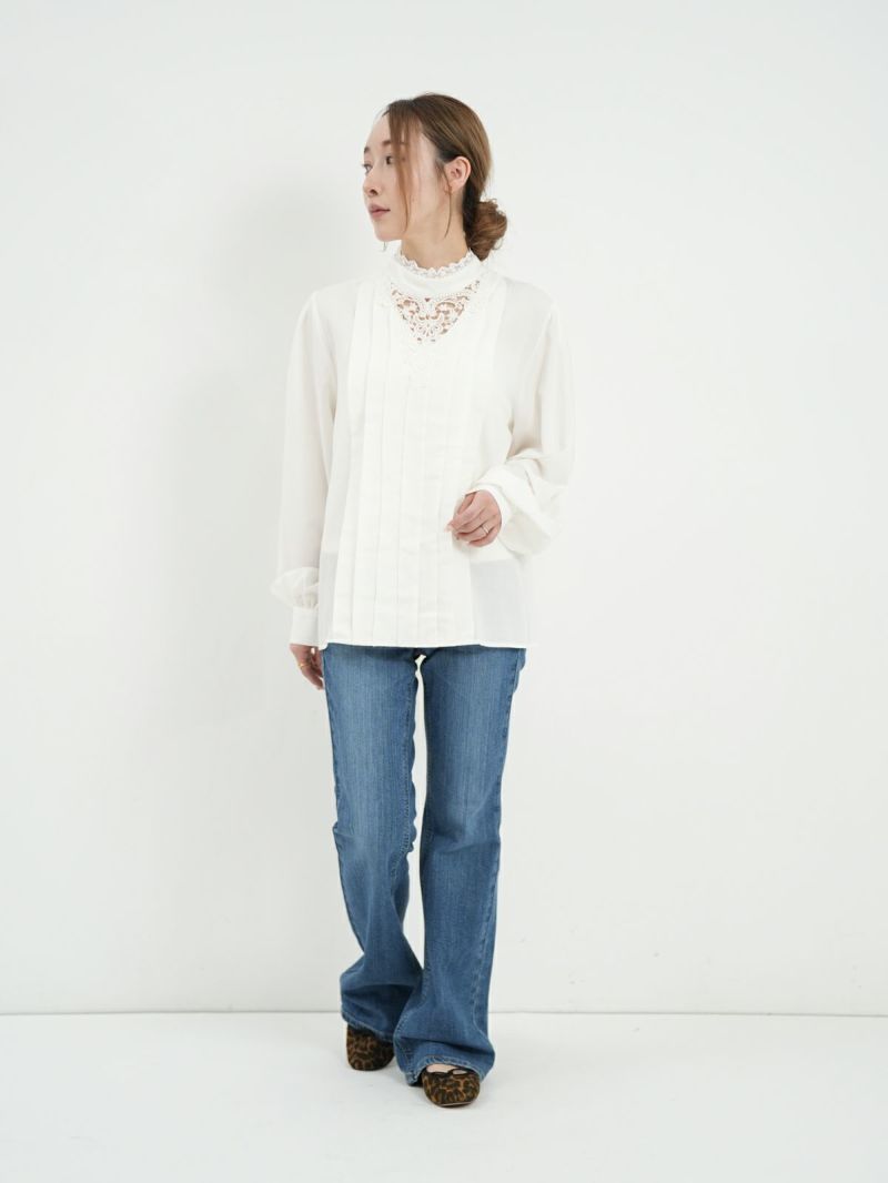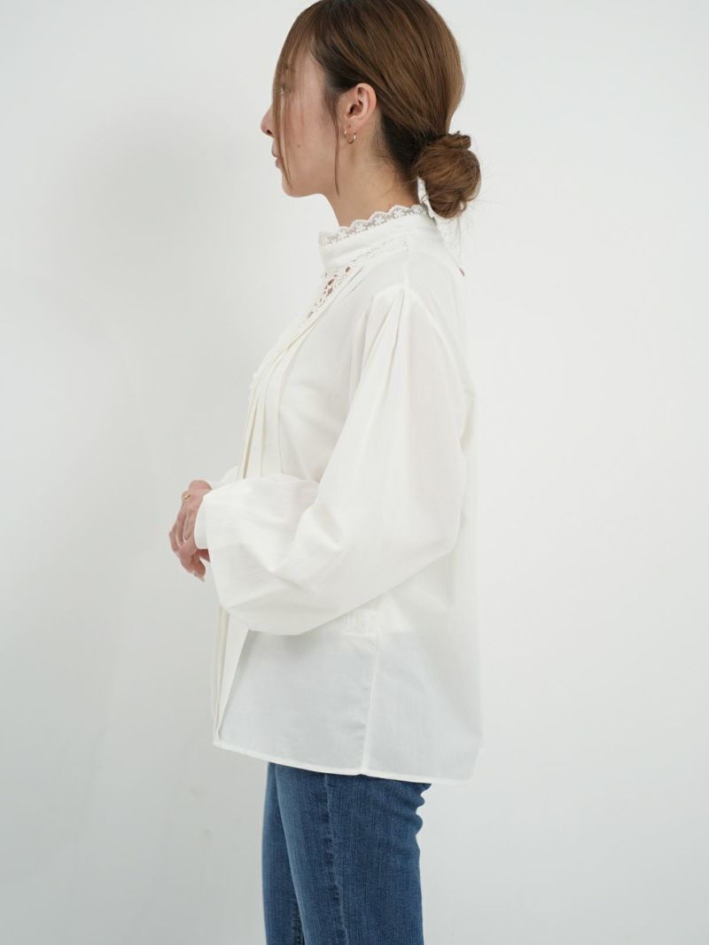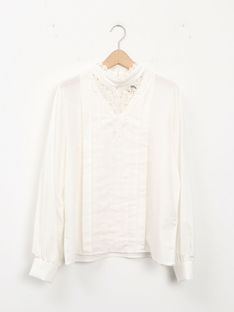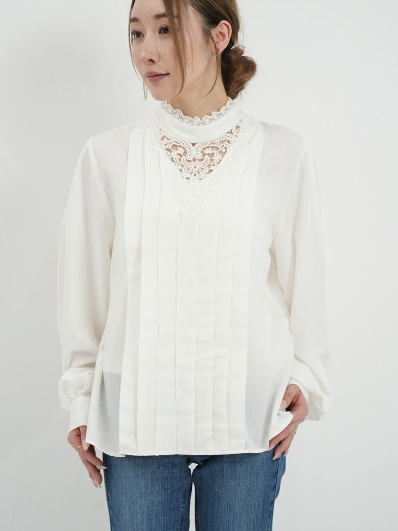 クラシックなイメージの繊細なレース使いがポイントのブラウス。 ヴィンテージブラウスを元に、丈や袖のボリュームを細かく修正を加えた拘りの1枚。見頃のピンタックデザインがスタイリングに存在感をプラスしてくれ、華やかにまとまります。