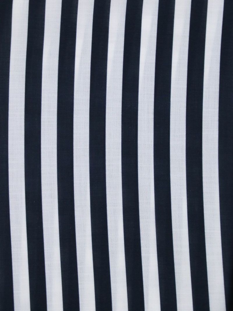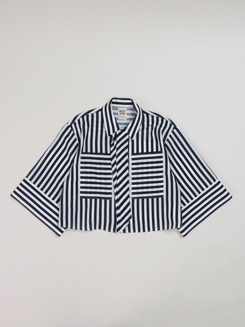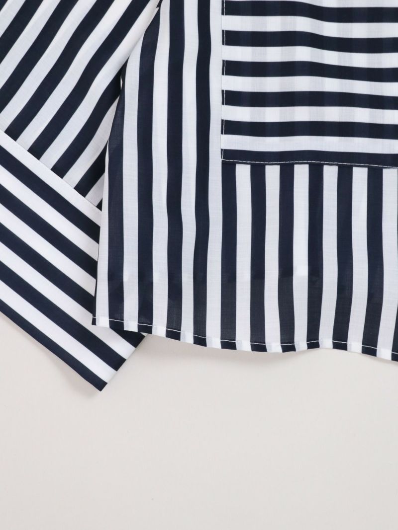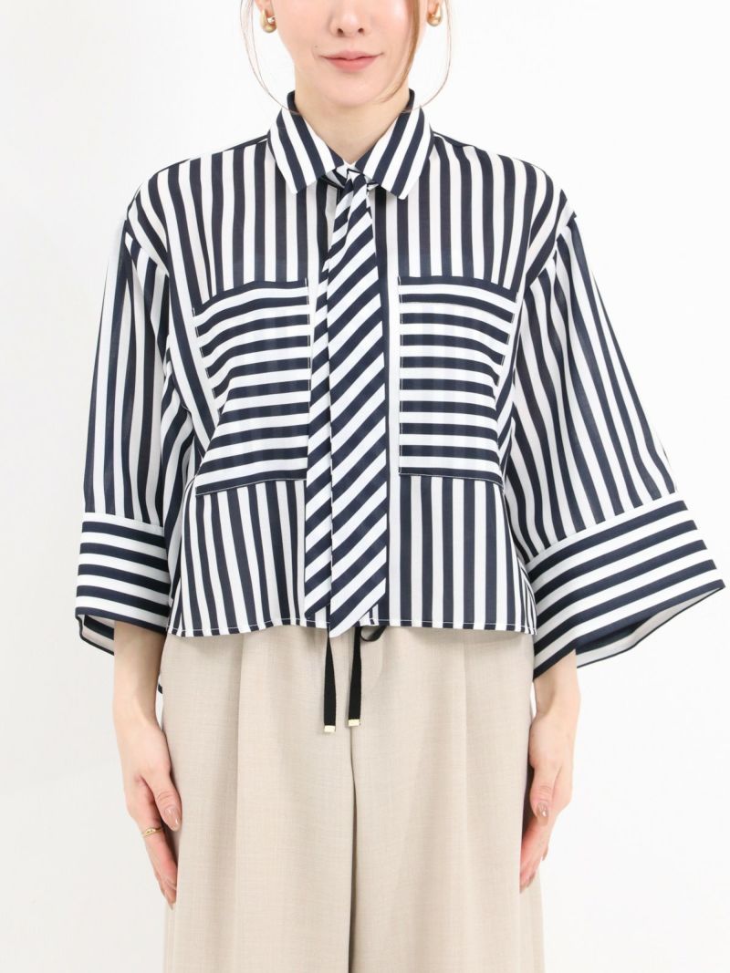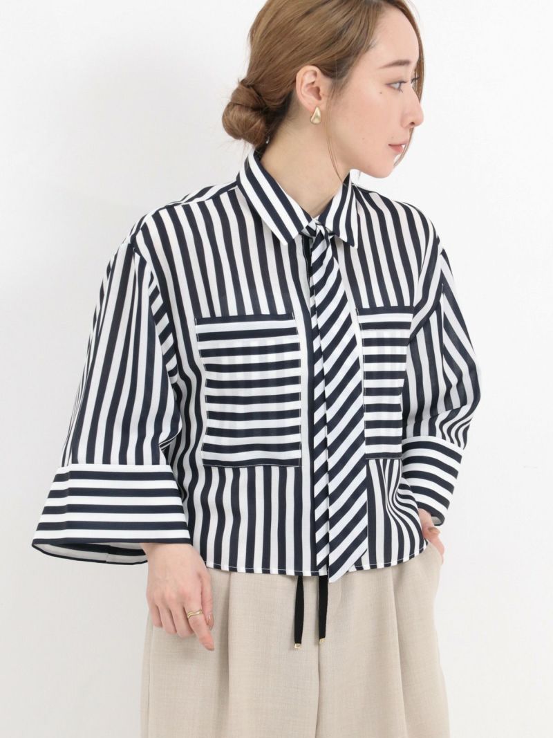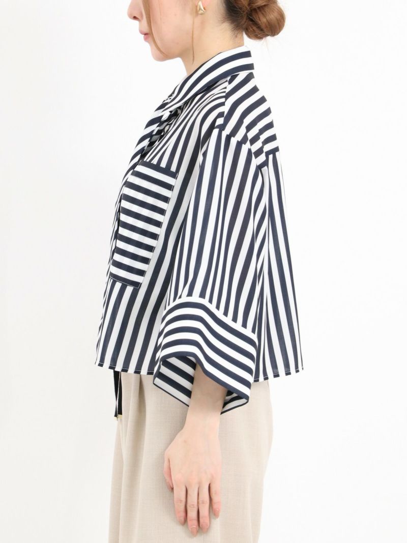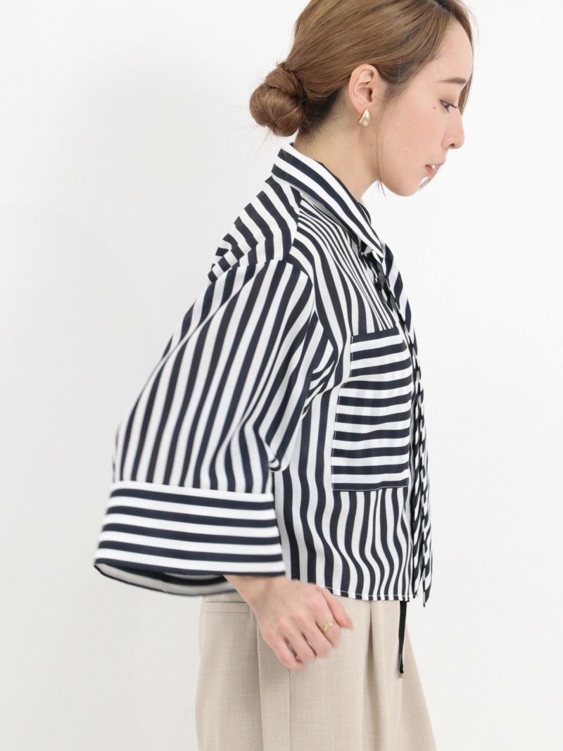 梨地のようにさらりとした感触を持つポリエステル素材を使用した涼し気なシャツです。白×黒の大胆なストライプとボリュームのあるワイドな袖がポイントです。
