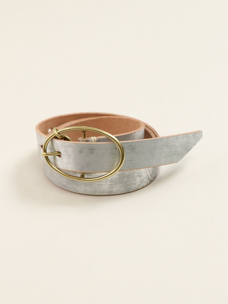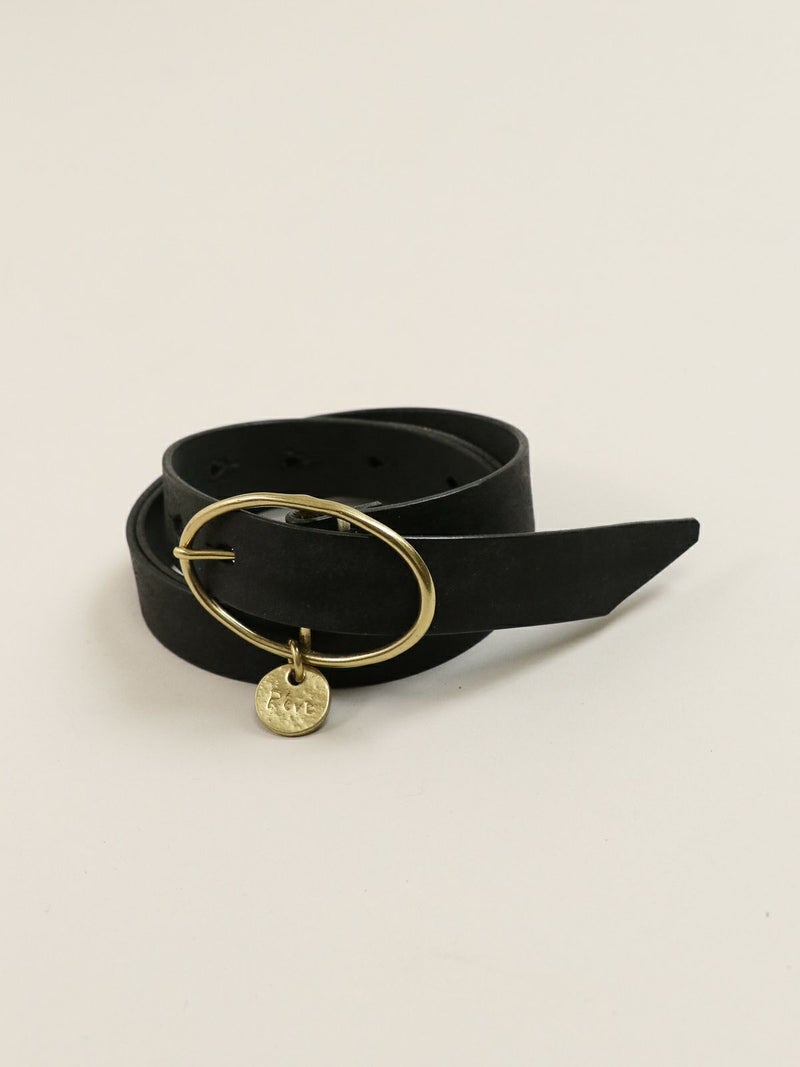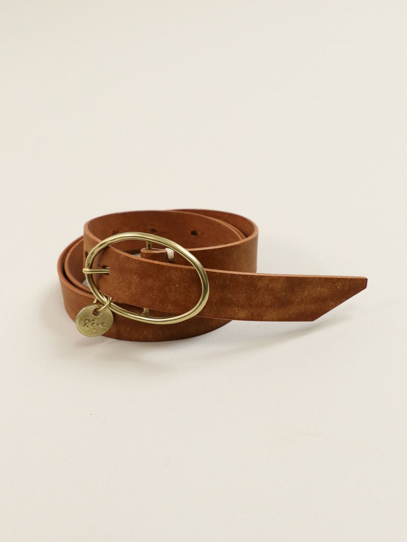 バックル部分のメダルチャームがポイントのレザーベルト。 使い込む程柔らかくツヤの出るプエブロ素材で、経年変化を楽しみつつ長く使える一本です。ゴールドの金具がコーディネートのポイントに。