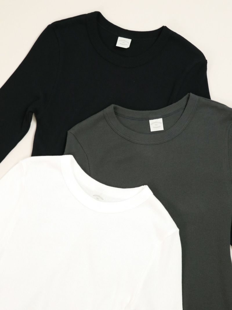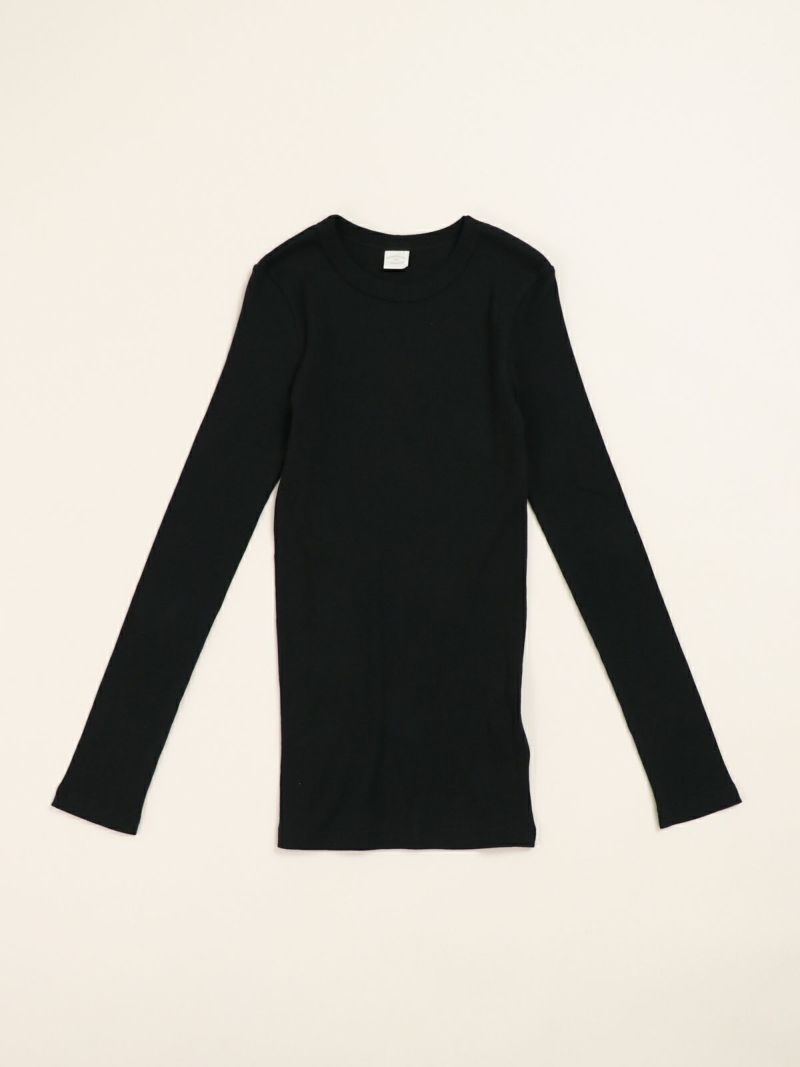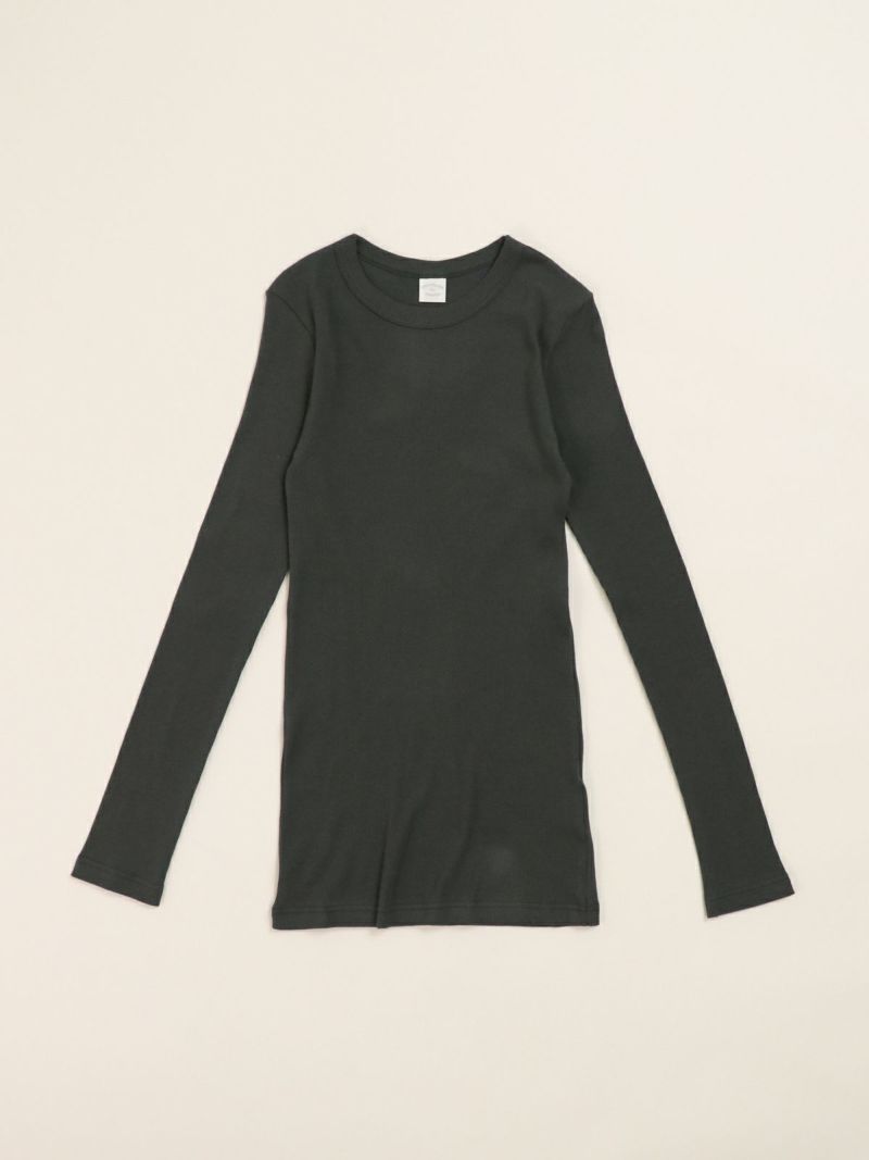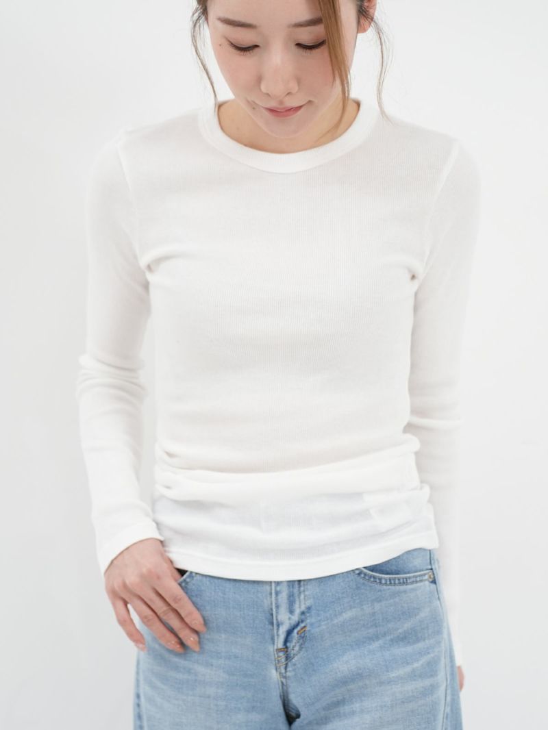 定番のテレコカットソー。 伸縮性があるので、身体に程よくフィットします。コットン100%のさらっとした肌触りが、素肌に優しく着心地の良い一枚です。首元が空きすぎないところもポイントです。
