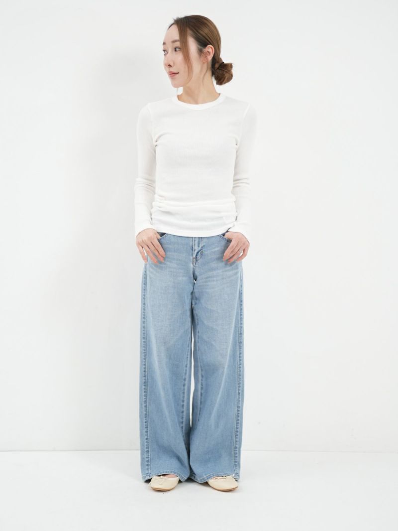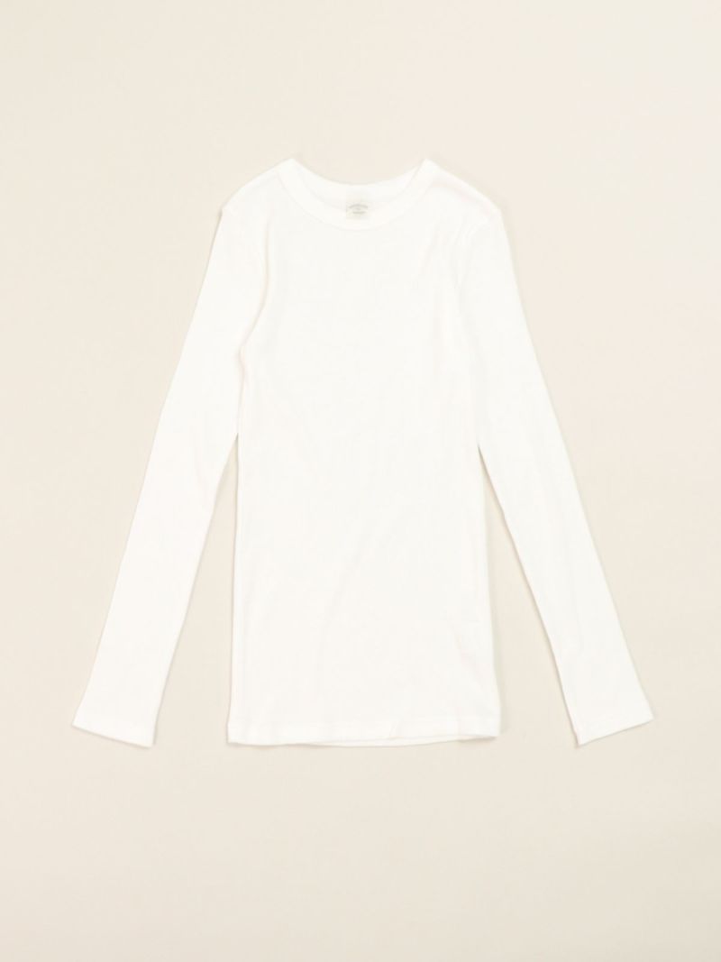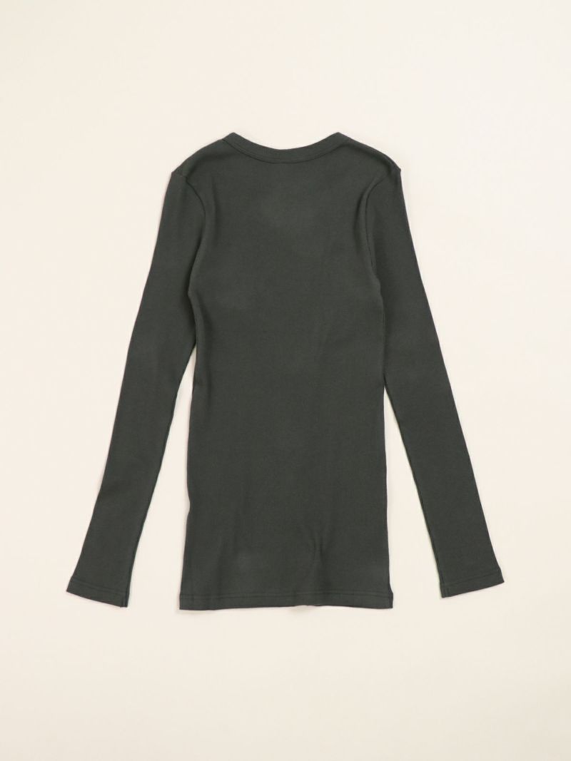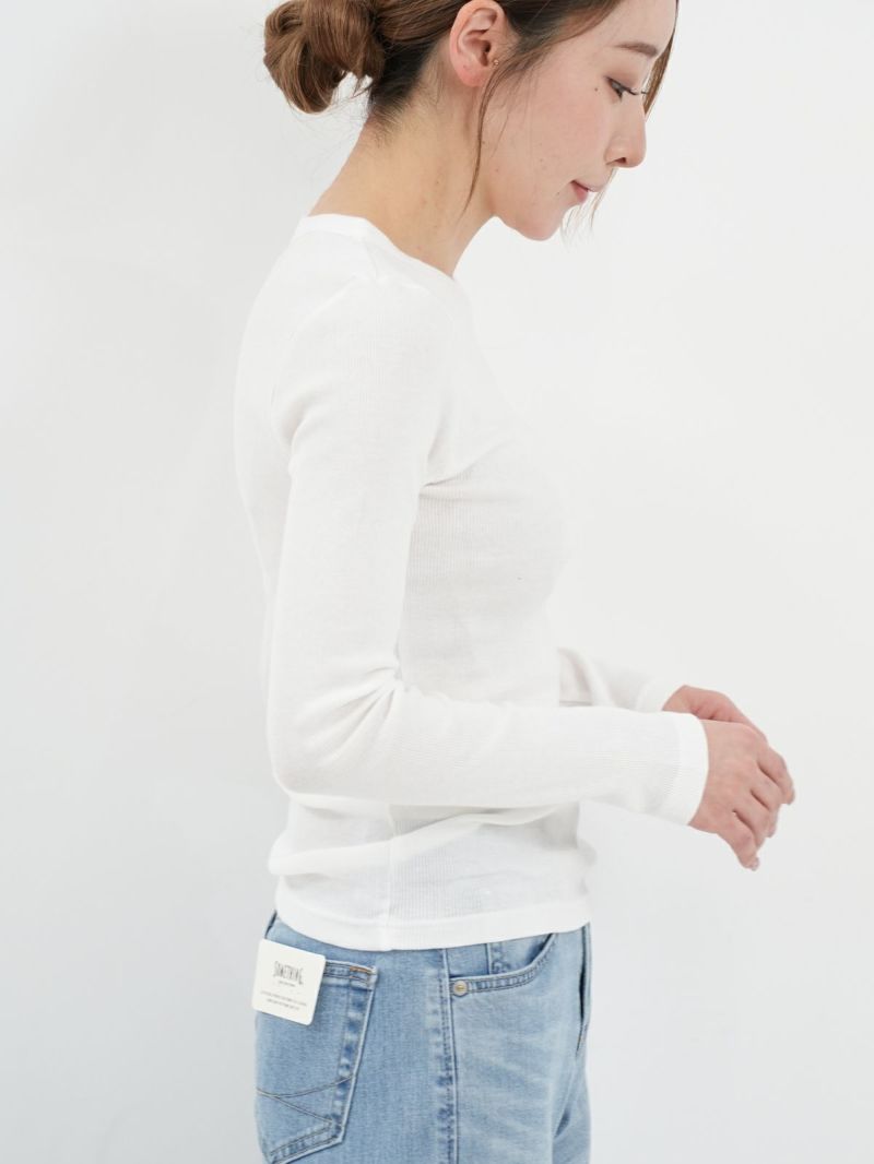 定番のテレコカットソー。 伸縮性があるので、身体に程よくフィットします。コットン100%のさらっとした肌触りが、素肌に優しく着心地の良い一枚です。首元が空きすぎないところもポイントです。