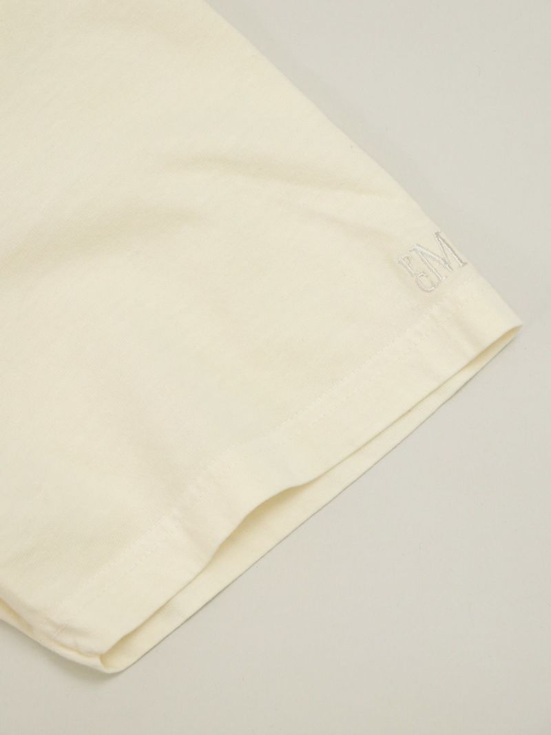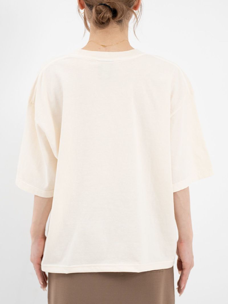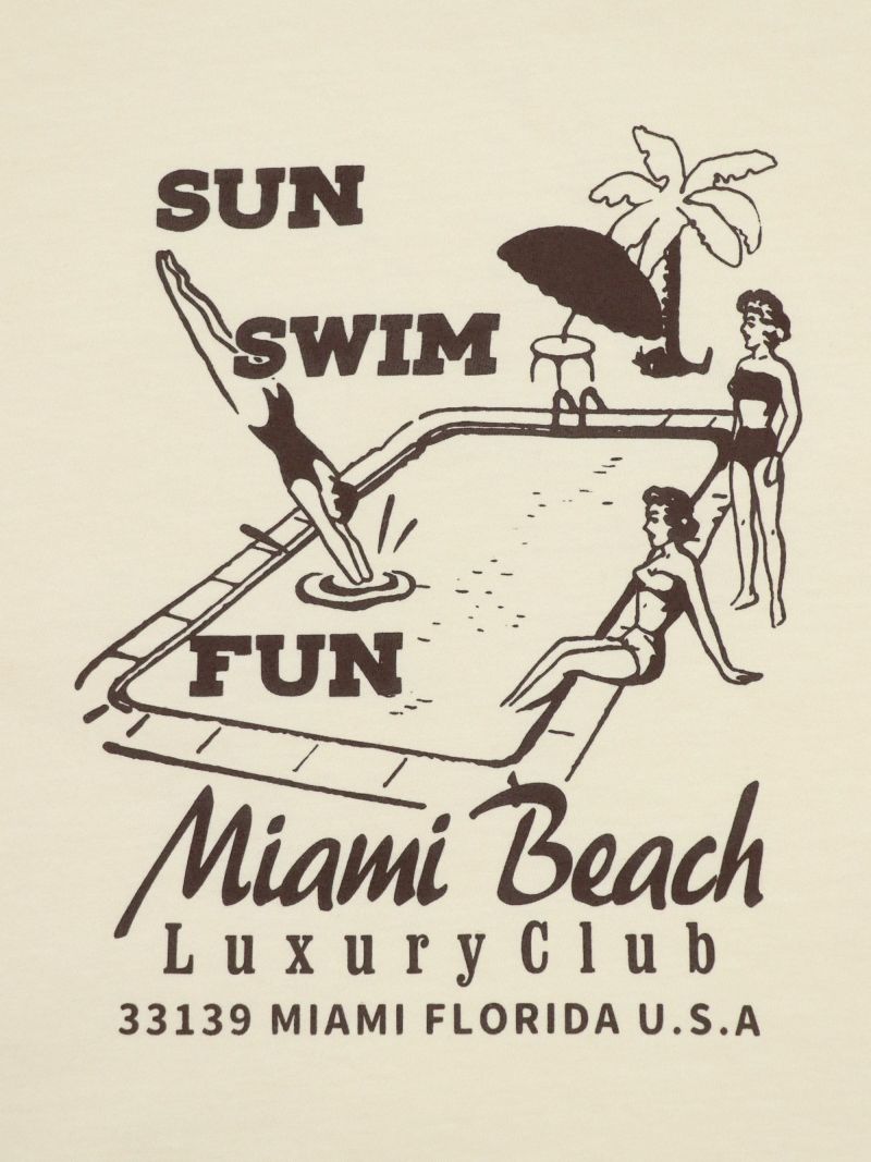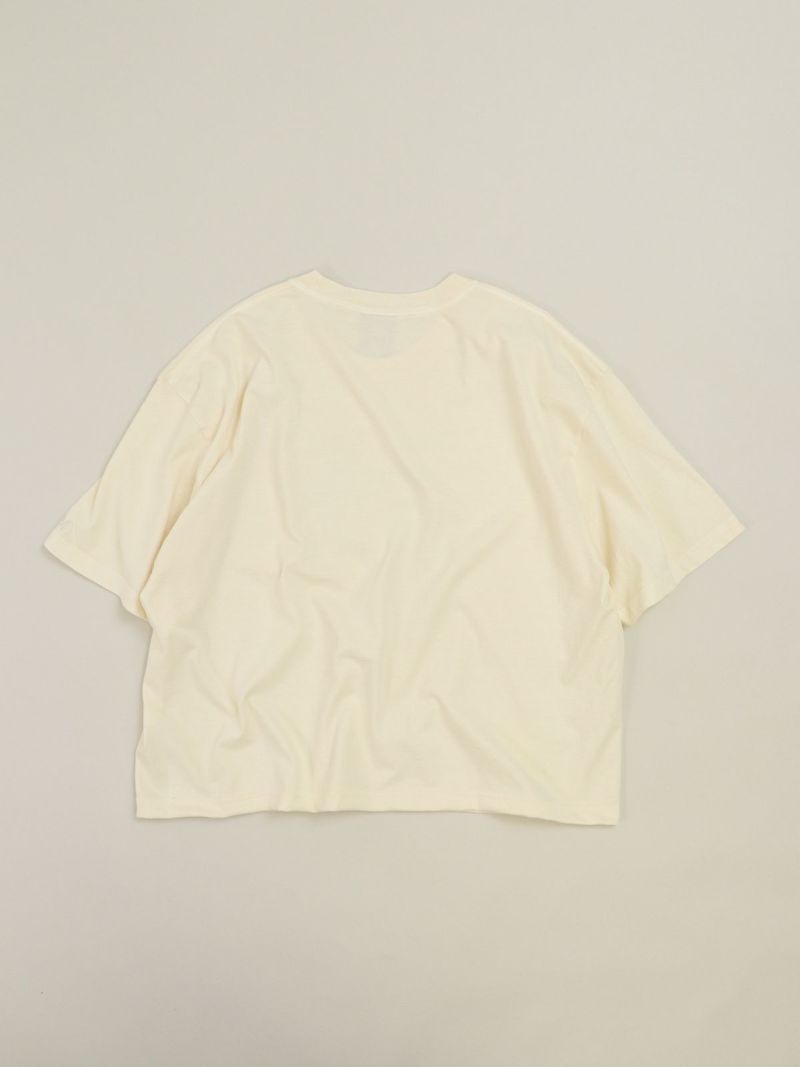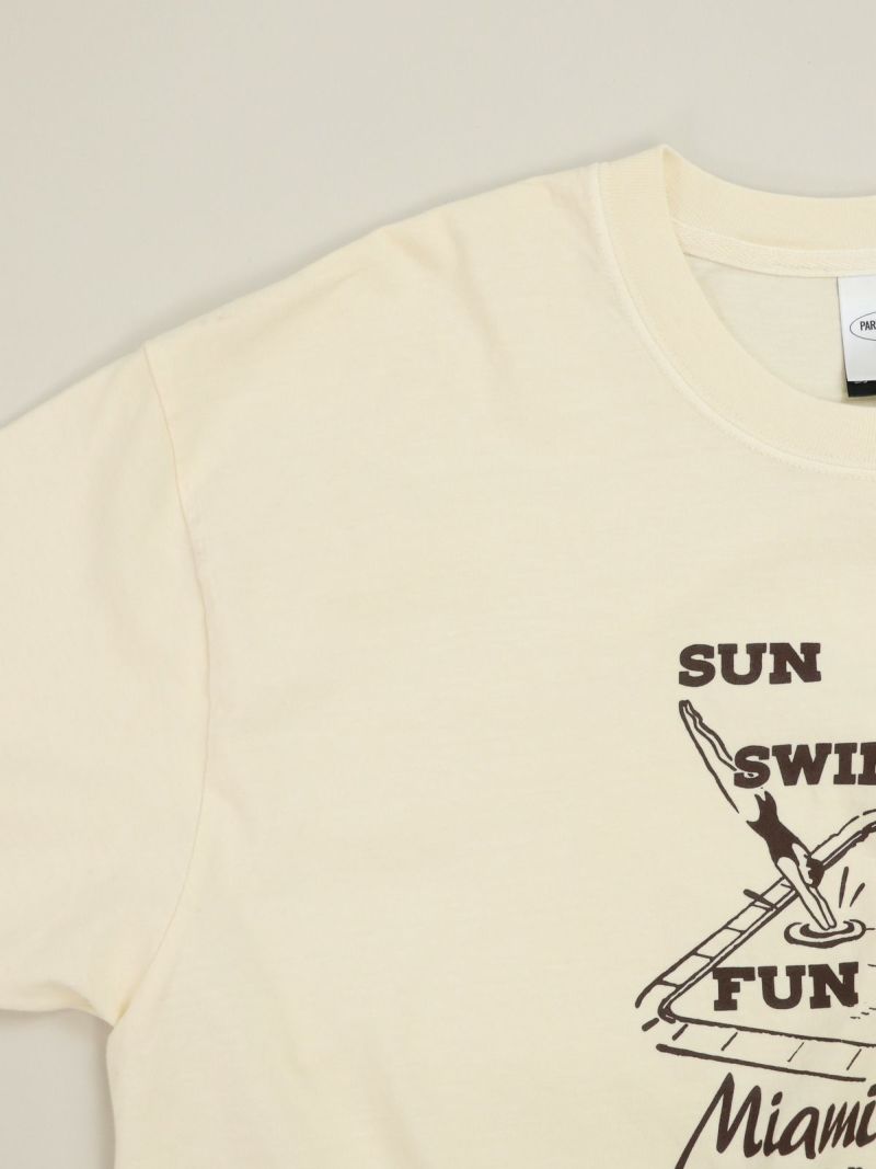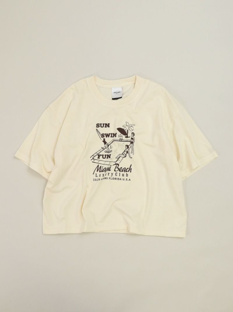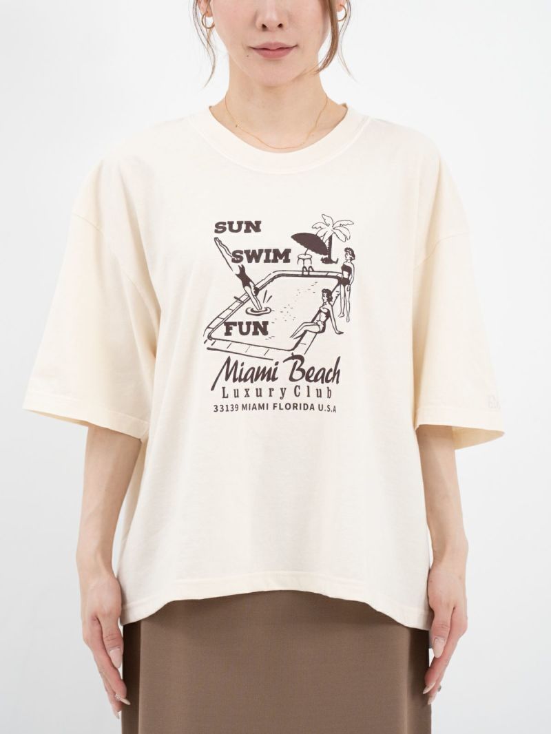 プールサイドのグラフィックが印象的なTシャツ。 顔料染め特有の奥行きのあるカラーで柔らかい素材感が特徴です。ワイドなシルエットで袖のロゴ刺繍もポイントに。