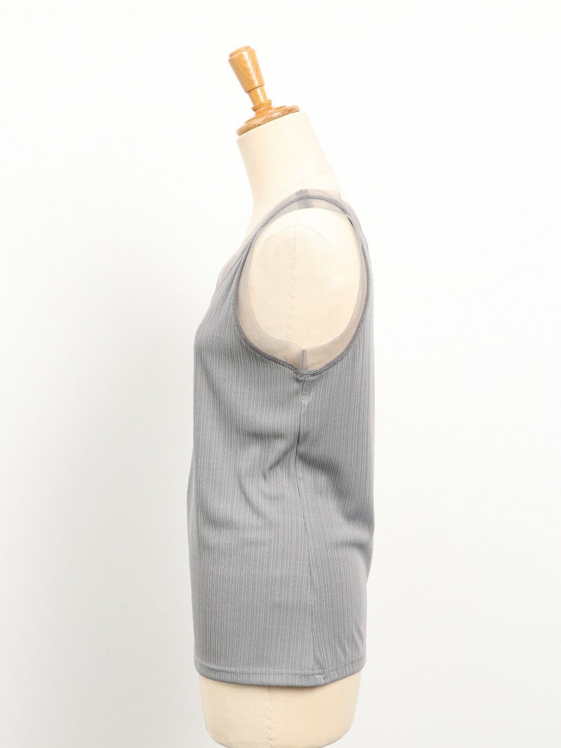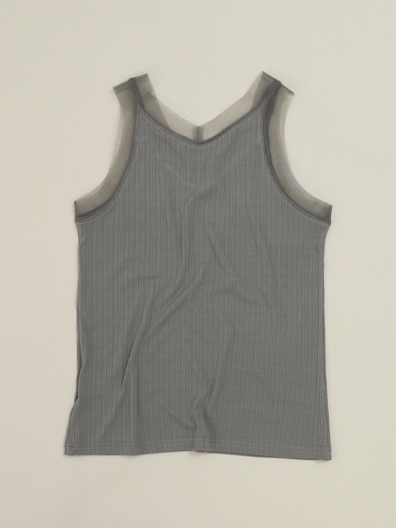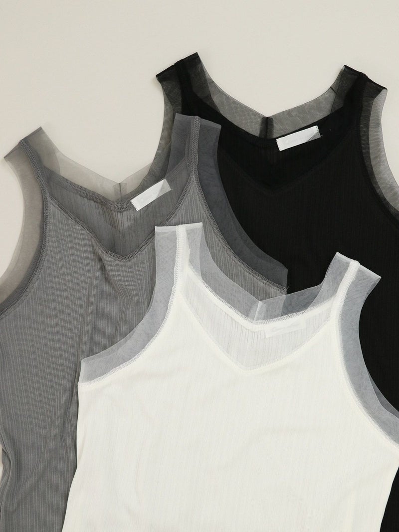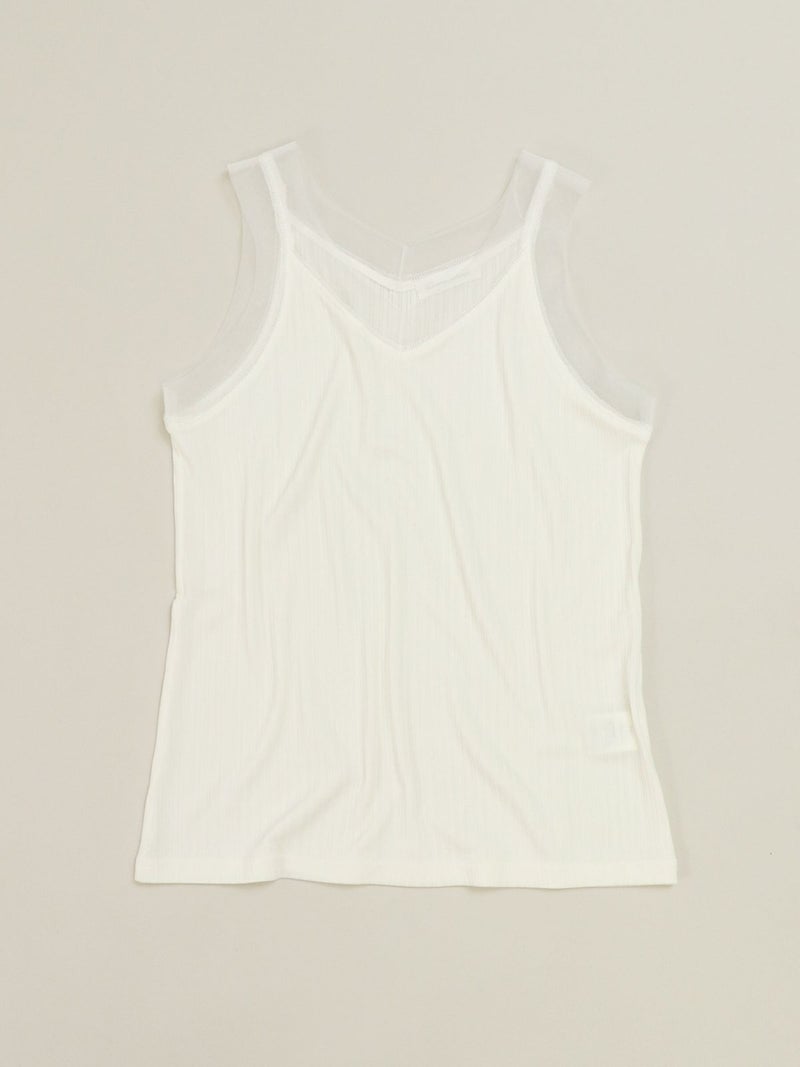 前後の衿とアームホールにボディと同色計のチュール素材をドッキングしたタンクトップ。 透け感のあるトップスやシャツなどと合わせて、さり気なくポイントとなるインナーは夏の頼れるアイテムとして活躍します。
