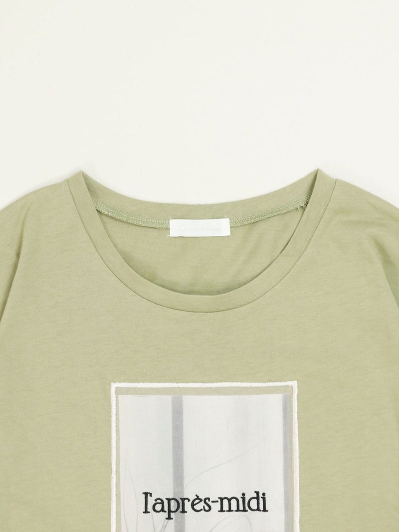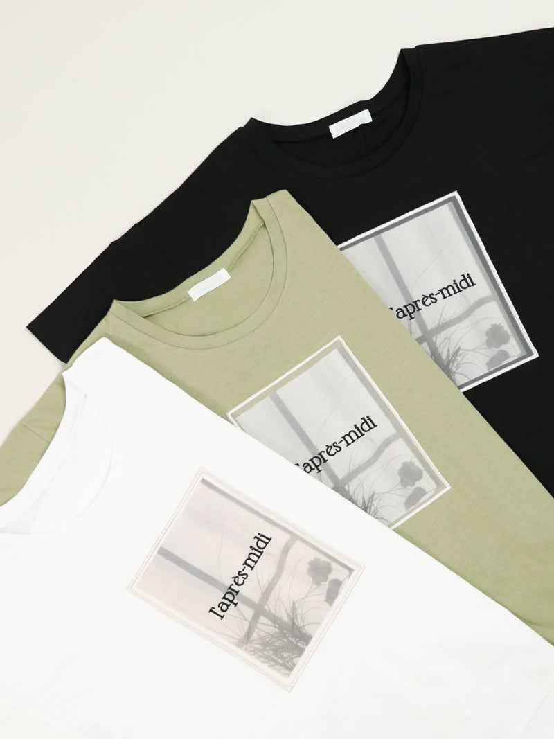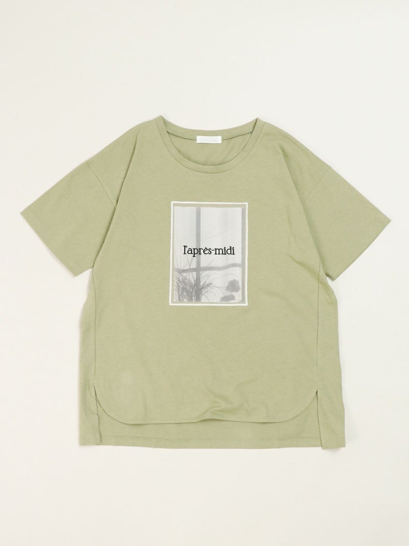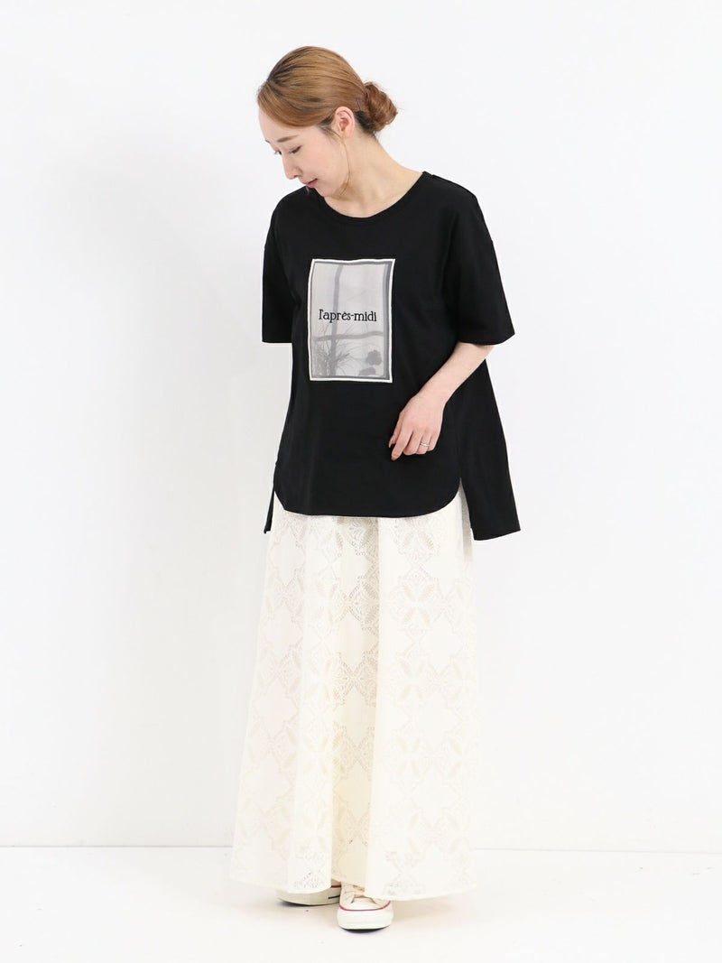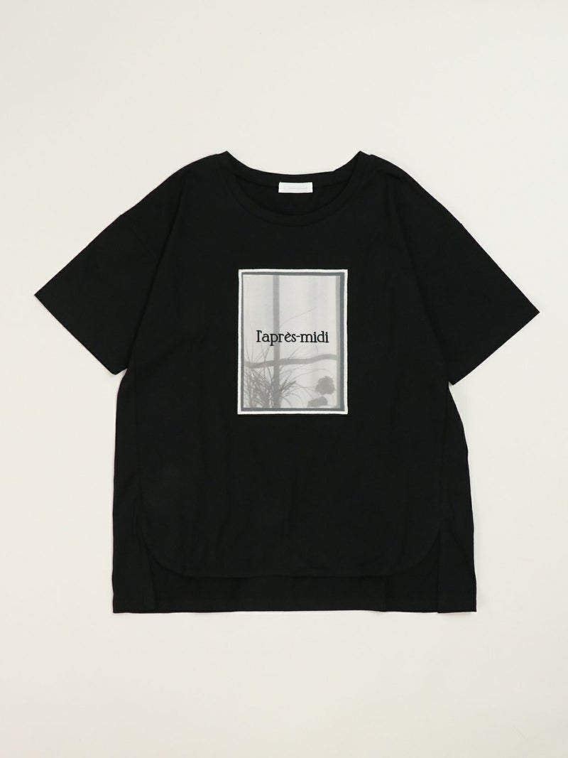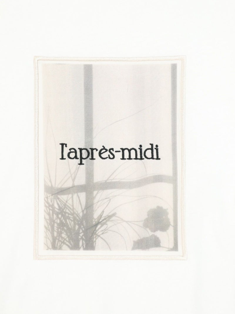 フォトプリントにシアー素材を重ね、ロゴに刺繍を施したアイコニックなTシャツ。 サイドに浅めにスリットを入れ、ボトムスを選ばずに着用していただけます。 ロゴの意味=昼下がり