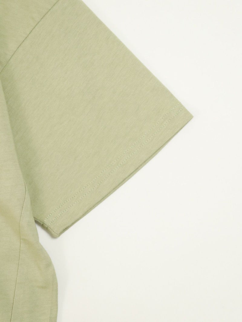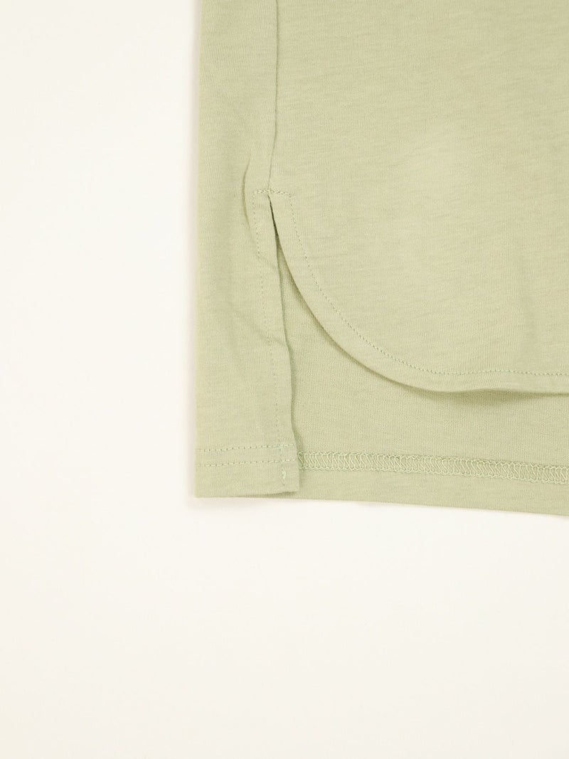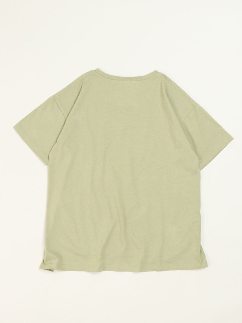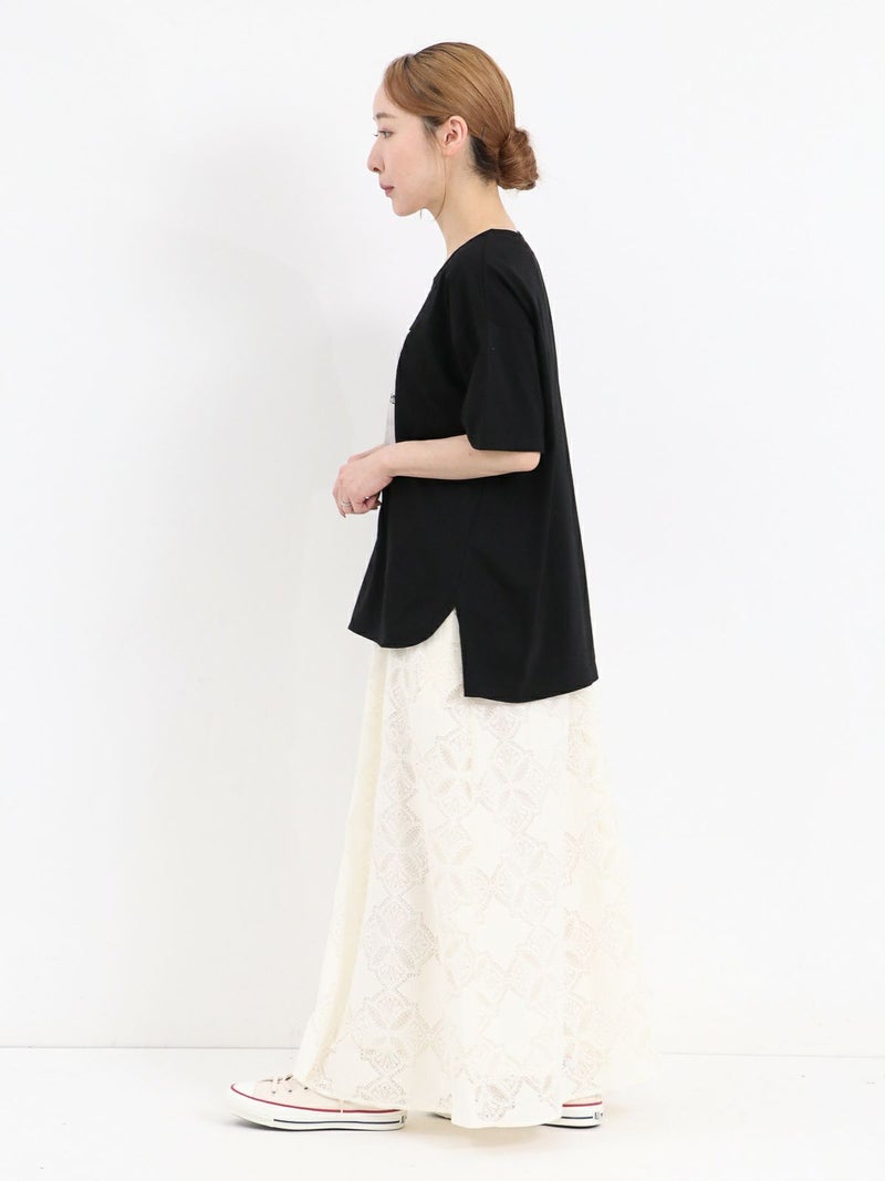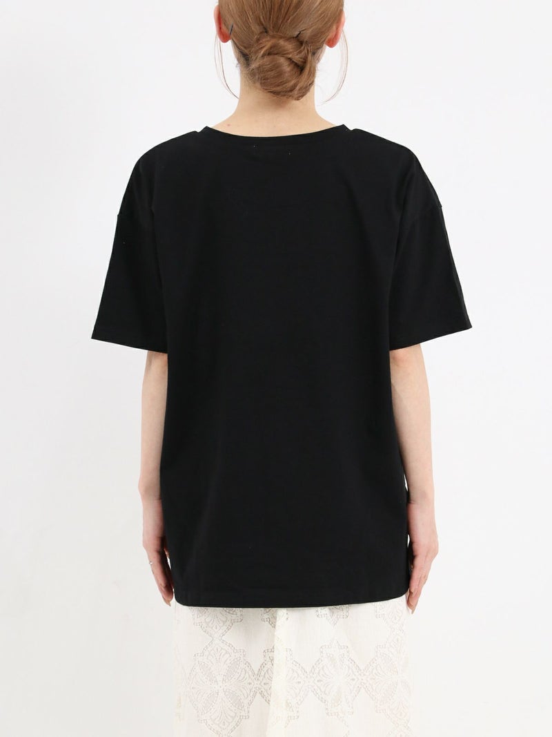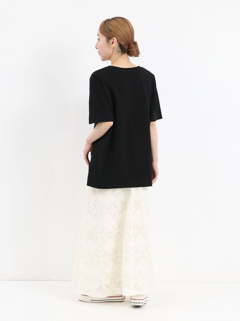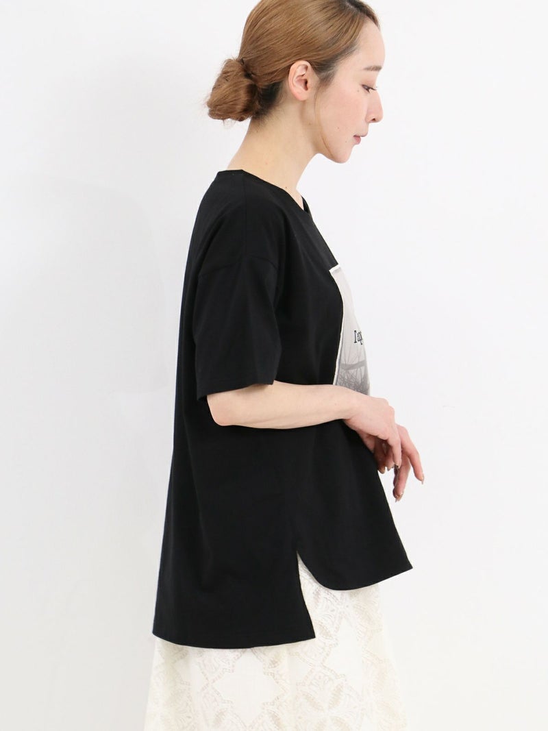 フォトプリントにシアー素材を重ね、ロゴに刺繍を施したアイコニックなTシャツ。 サイドに浅めにスリットを入れ、ボトムスを選ばずに着用していただけます。 ロゴの意味=昼下がり