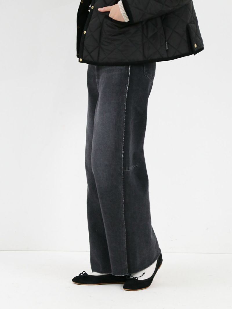 本格的なヴィンテージ感が楽しめるSERGEのリメイクデニム。 前半分と後ろ半分で色味の違うデニム生地をドッキングしているデザイン。前の生地と後ろの生地の合わせ部分が絶妙にカーブして前にでており、あえて切りっぱなしの古着感のある雰囲気を見せるようにしています。裾の部分も切りっぱなしになっていてヴィンテージ感を演出しています。
