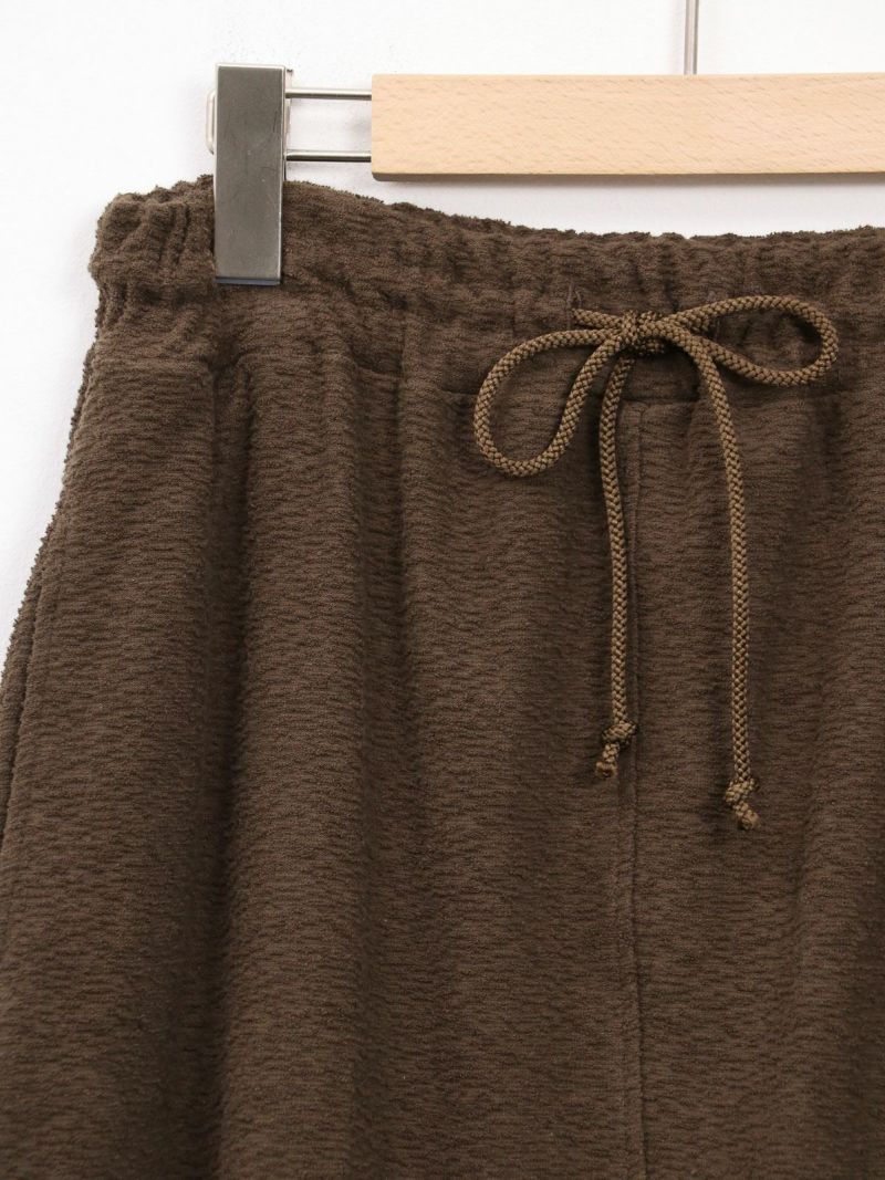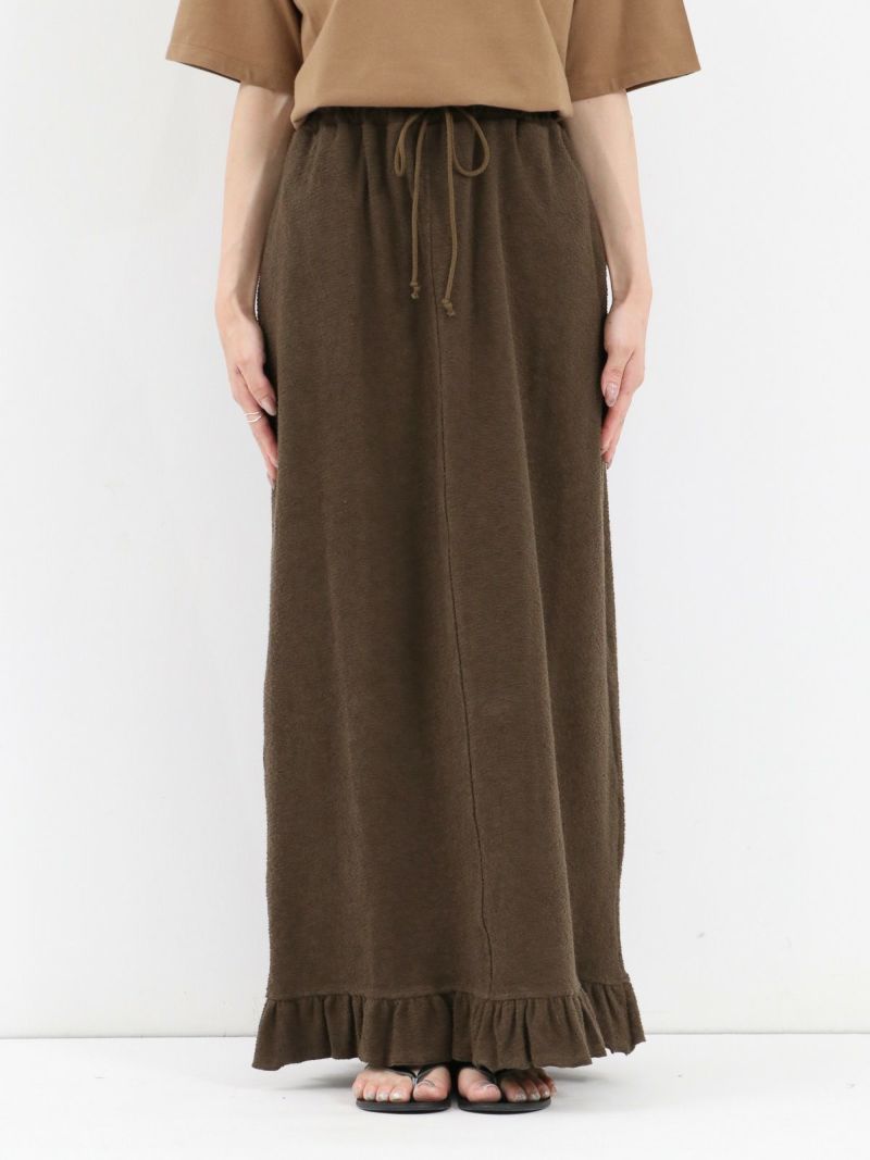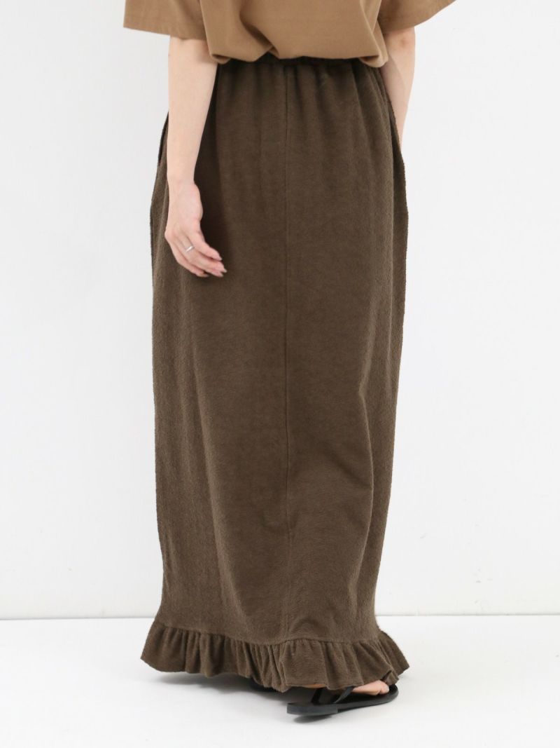 柔らかなパイル地のフリルヘムスカート。 ランダムな長さのループで表面に凹凸がありラフな印象になりすぎず◎無地のTシャツ合わせでもコーディネートが完成する1枚です。