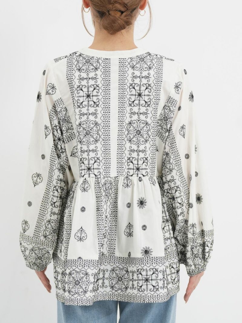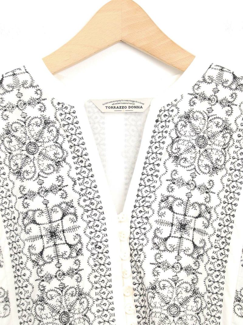 たっぷりの刺繍をモノトーンで施し、大人っぽさと華やかさがのあるブラウス。 ウエスト切替位置をやや高めにデザインしているためスタイルアップも叶う1枚です。